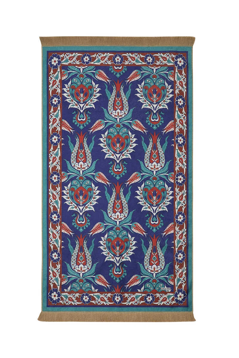 The Lacivert Kadife Halı Seccade features a silky texture and eye-catching colors with Turkish motifs and tile patterns. It is designed for comfortable use with dimensions of 65×115 cm and originates from Bursa, Turkey.