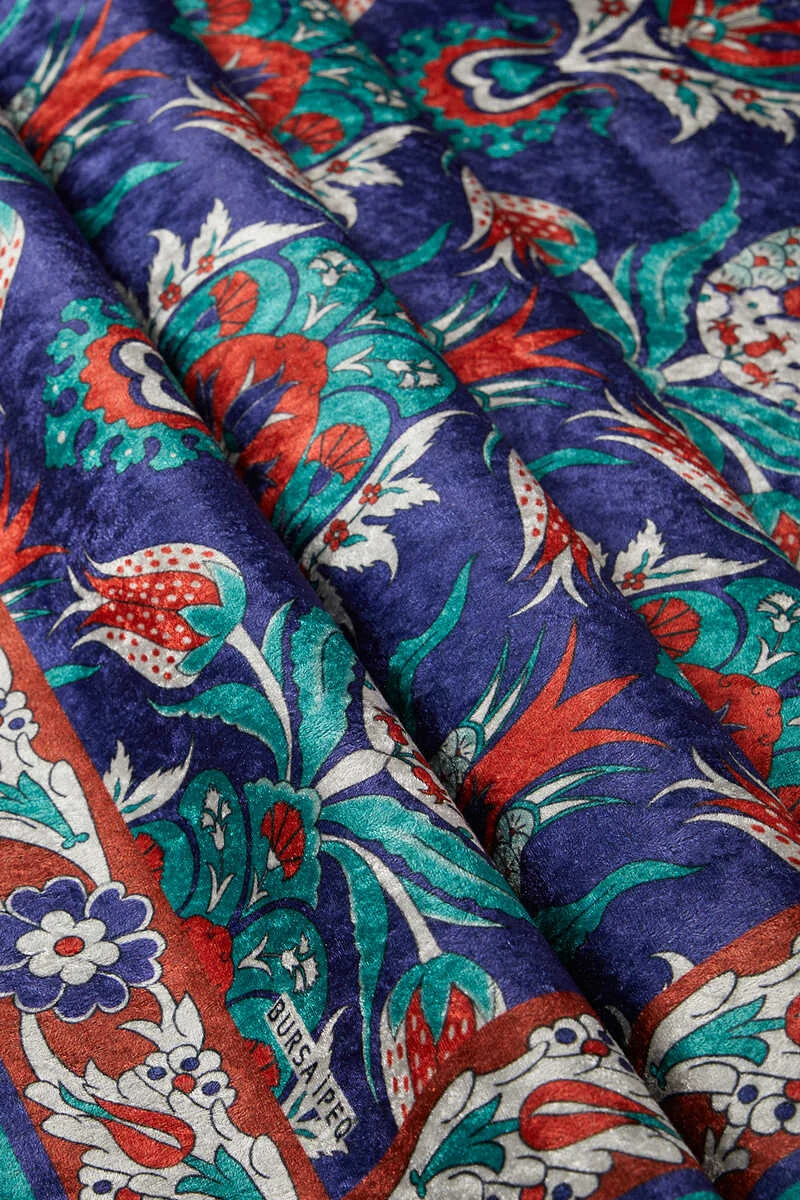 This navy velvet prayer rug features traditional Turkish motifs and intricate tile designs, offering a decorative touch to any space. Crafted in Bursa, Turkey, it is designed for comfort and ease of use with its dimensions of 65x115cm. The soft velvet texture adds an elegant feel, making it both functional and stylish.