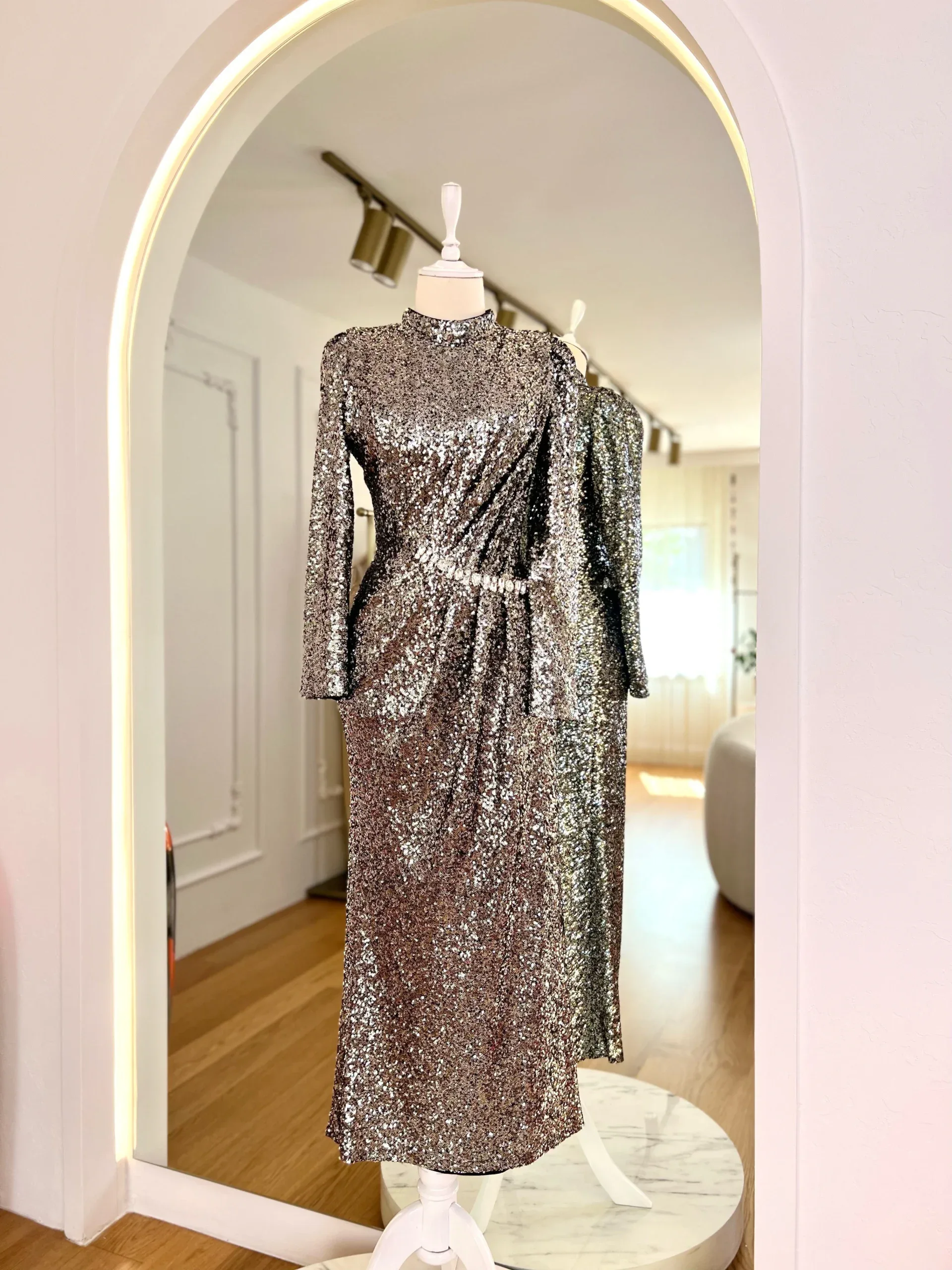 The Neena Modest Evening Dress is designed with a length of 135 cm and a mandarin collar. It is equipped with a zipper at the back for easy wear. The dress is crafted from a sequin fabric, adding a touch of elegance. The skirt section includes drapes, enhancing its sophisticated look. The waist is accentuated with stone details that are securely attached, ensuring durability.