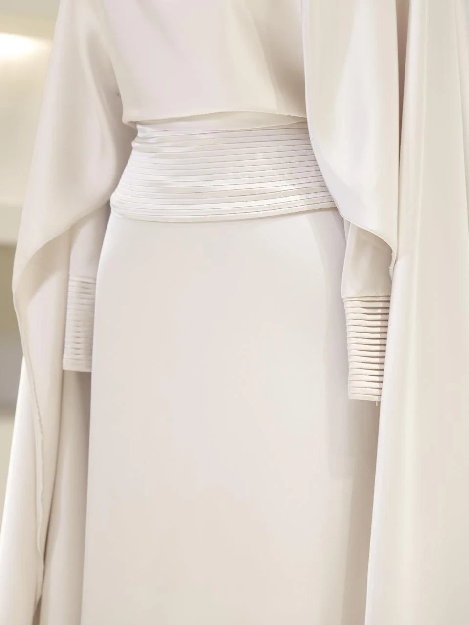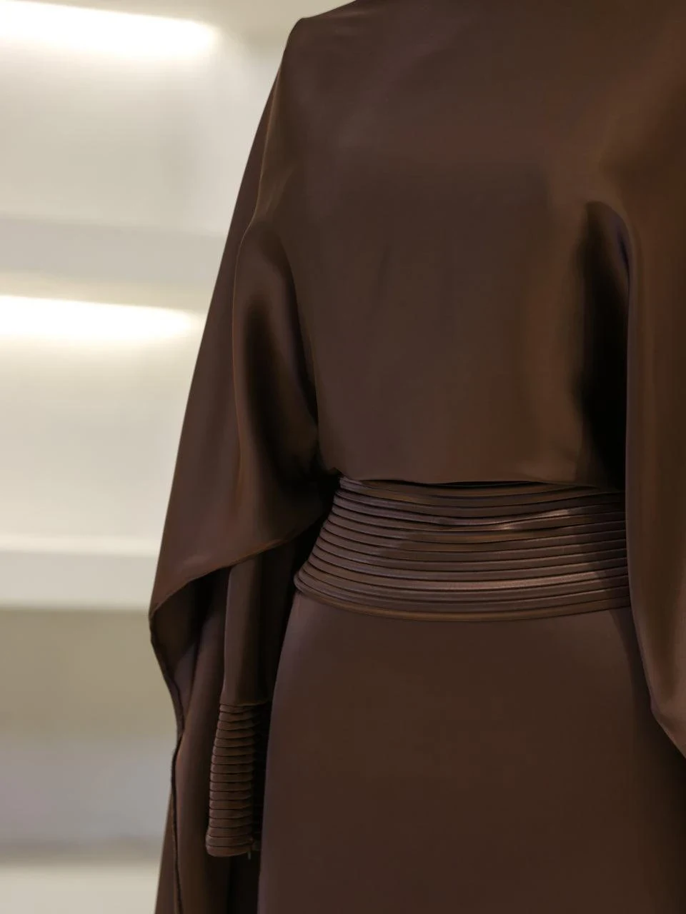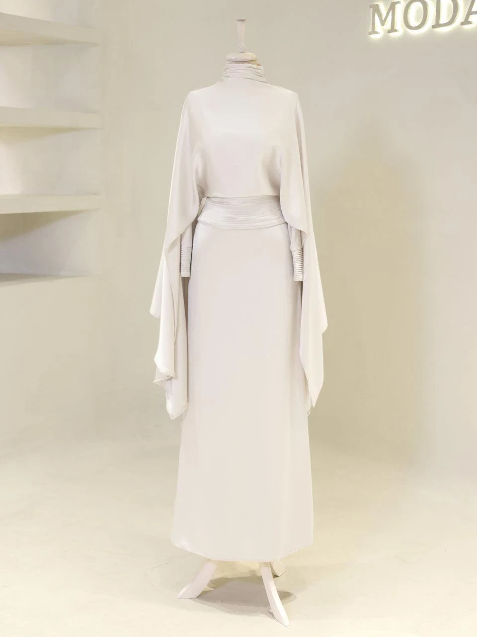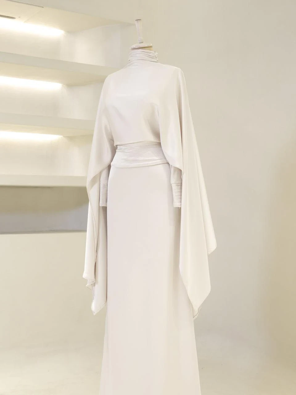 The Neva Modest Evening Dress offers a refined look with its satin fabric and pencil form design. Measuring approximately 150 cm in length, this dress is tailored to provide a perfect fit. It includes a lining for added comfort and a back zipper for easy wear. The dress is equipped with chest padding, ensuring a smooth silhouette.