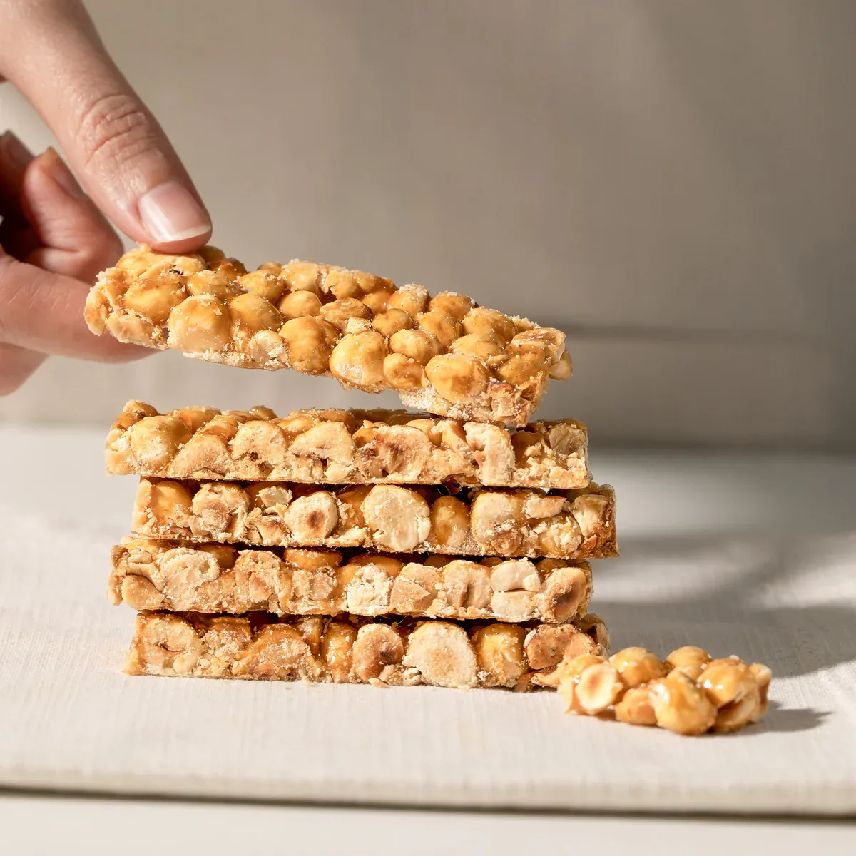 These hazelnut crunch bars are packed with freshly roasted nuts, including Antep pistachios from Gaziantep, sesame seeds, and peanuts. We also use hazelnuts from Giresun and almonds from the Aegean region. The bars are sweetened naturally with date juice and a hint of lemon juice. Each bar weighs 20 g and comes in a pack of six. Enjoy a snack that combines quality ingredients sourced from various regions in Turkey.