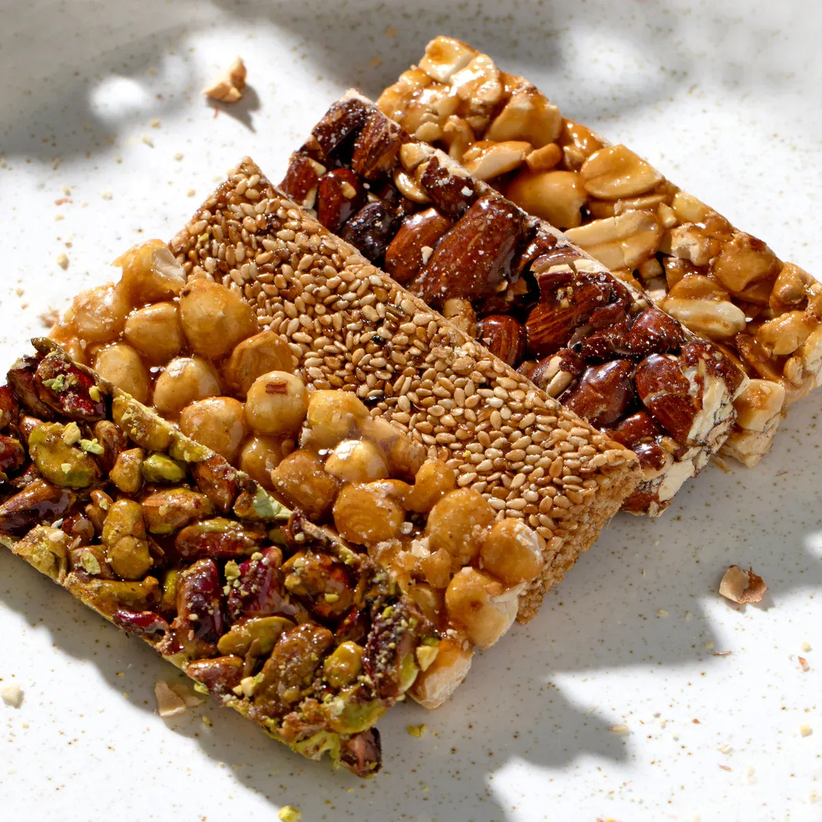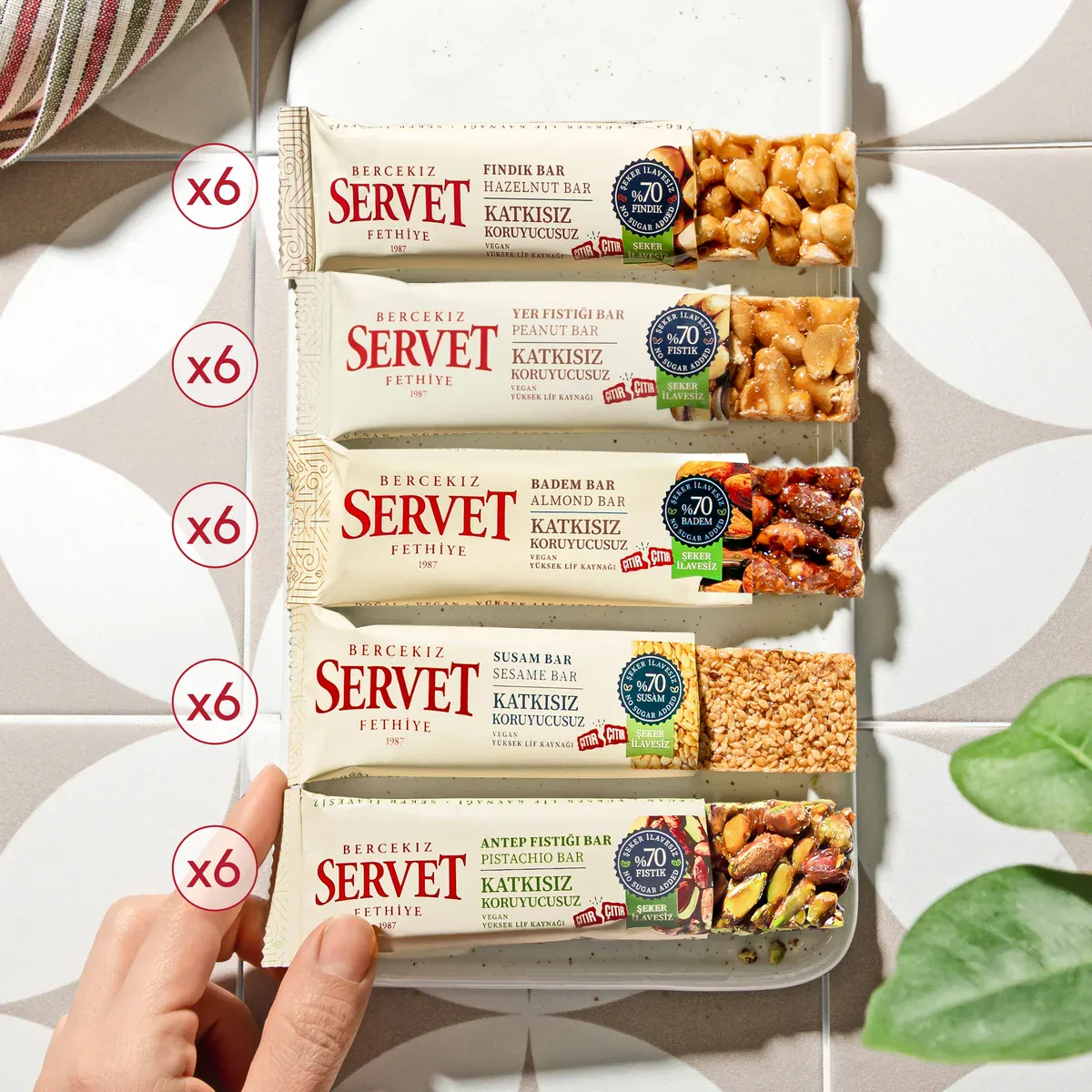 These mixed nut brittle bars contain a blend of freshly roasted nuts, date juice, and lemon juice. The nuts are carefully sourced: raw pistachios from Gaziantep, hazelnuts from Giresun, almonds from the Aegean region, and locally found sesame seeds and peanuts. Each bar is crafted without added sugar for a naturally sweet taste. The product originates from Turkey and offers a convenient snack option in a pack of 30, each weighing 20 grams.