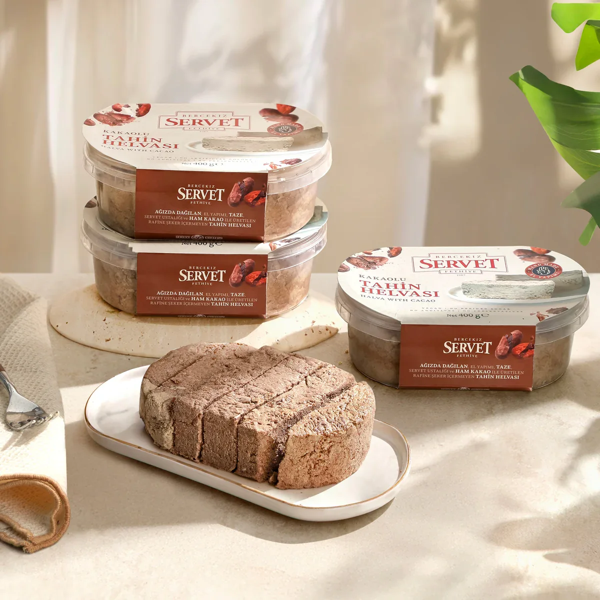 The "Rafine Şeker İlavesiz Kakaolu Taze Tahin Helvası 3'lü Paket" is a tahini halva made in Fethiye, Turkey, using only natural date juice as a sweetener. It is one of the best-selling tahini halvas on online marketplaces in Turkey.