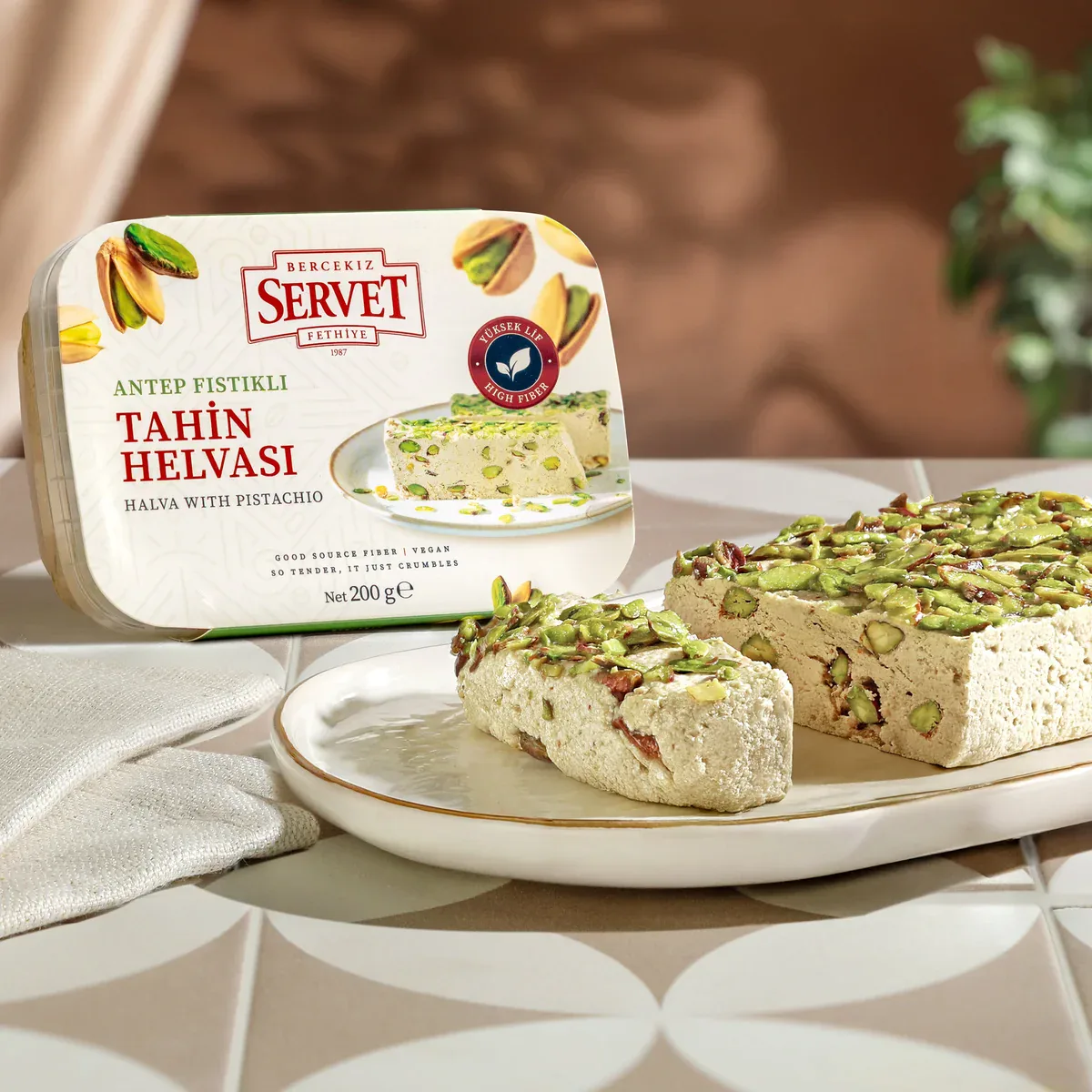 This pistachio tahini halva is crafted in Fethiye, Turkey. It stands out for its unique recipe that excludes refined sugar. Instead, it is sweetened using only natural date juice. This product is one of the best-selling tahini halvas on online marketplaces in Turkey. Enjoy a clean-label treat with a distinct taste.