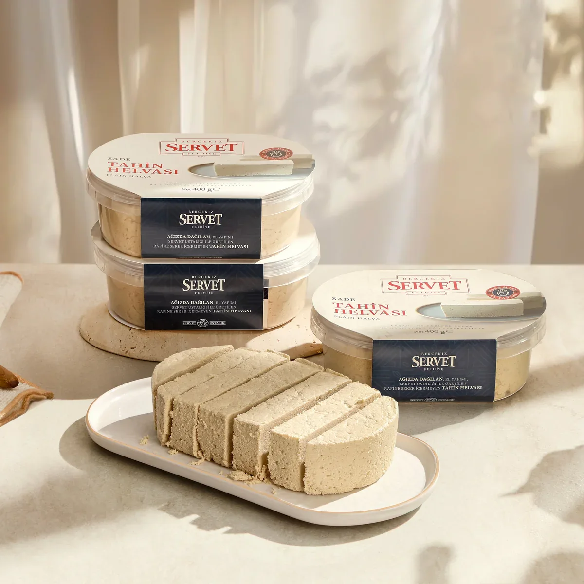 The "Rafine Şeker İlavesiz Sade Taze Tahin Helvası 3'lü Paket" is a tahini halva produced in Fethiye, Turkey. It is sweetened with natural date juice instead of refined sugar.