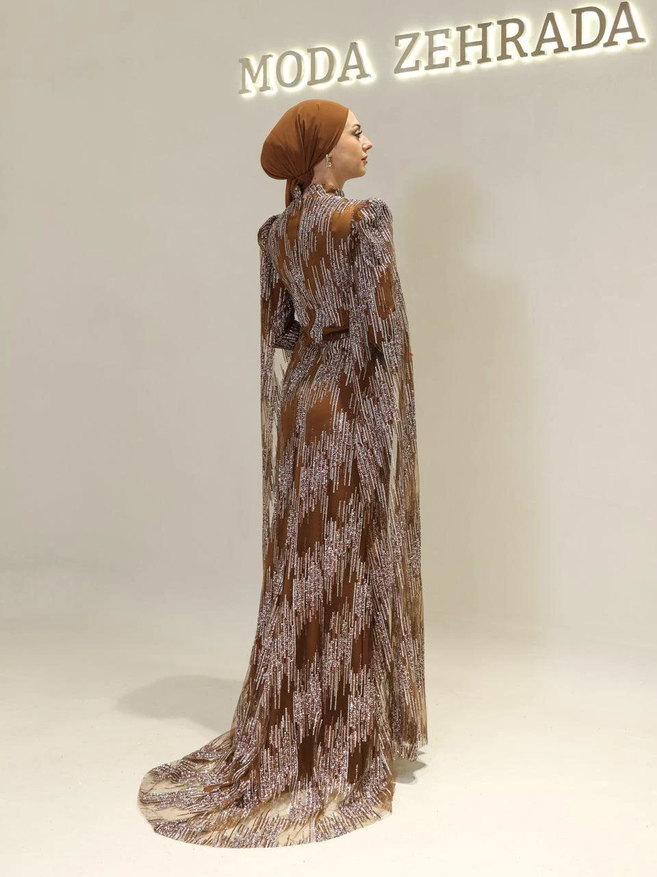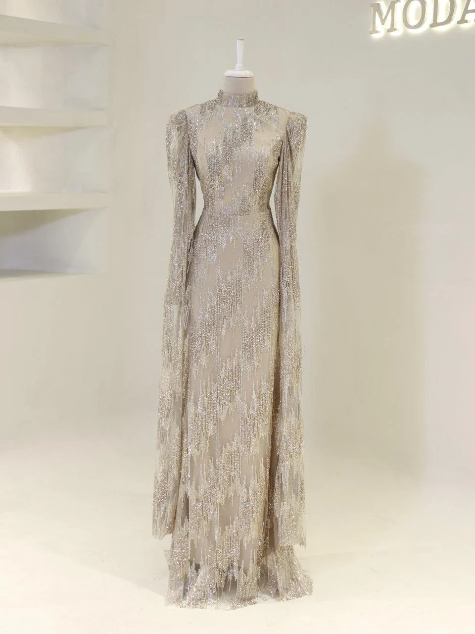 The Noche Modest Evening Dress offers a standard fit with a front length of 165 cm and a back length of 180 cm. Made from tulle fabric, it features a lining and a back zipper closure. The dress includes a built-in bust pad and cape-style sleeves. It has adhesive embellishments and a flared skirt design. Note: Due to the adhesive nature of the embellishments, some may detach over time; however, this will not affect the overall appearance of the dress.