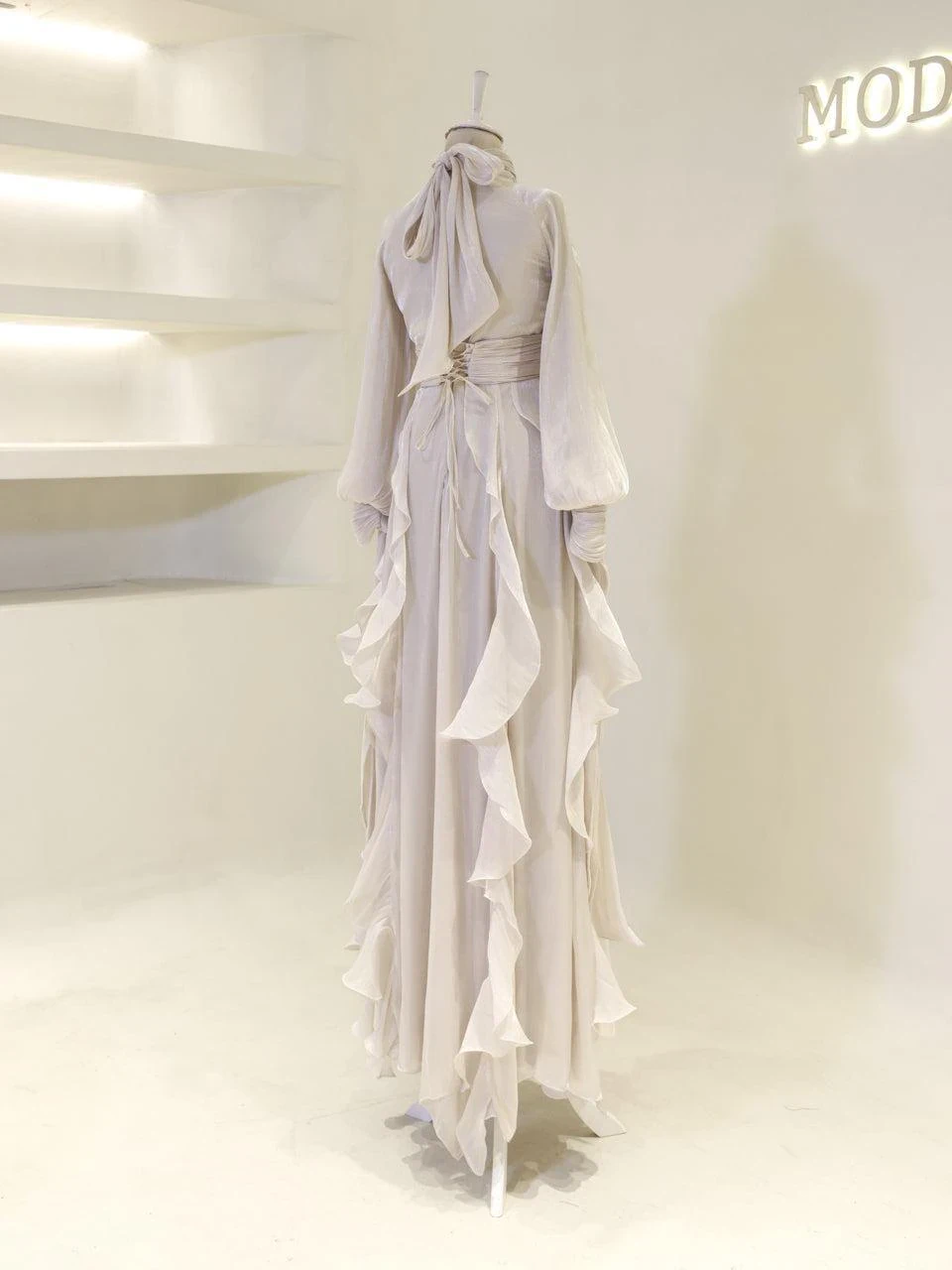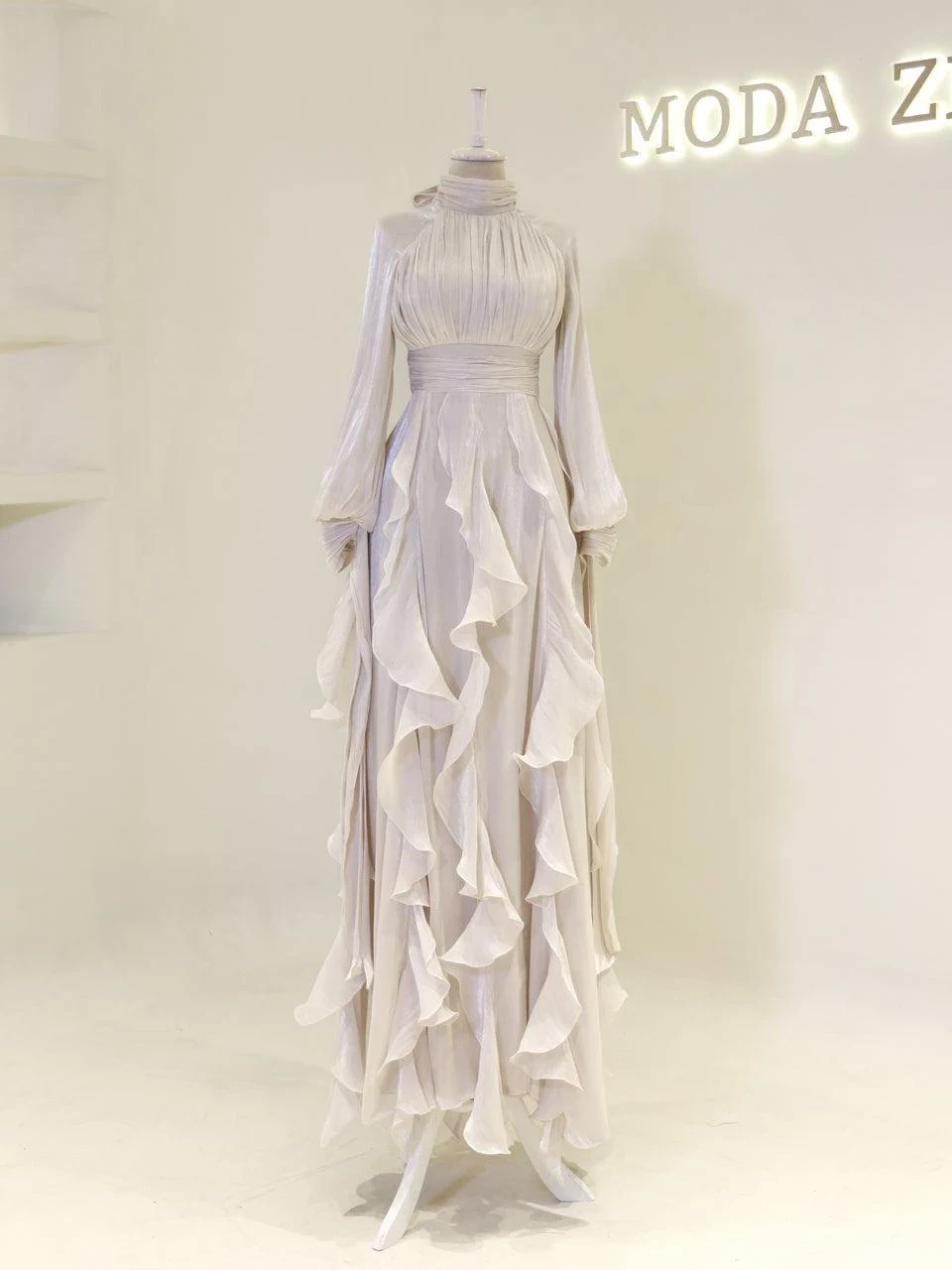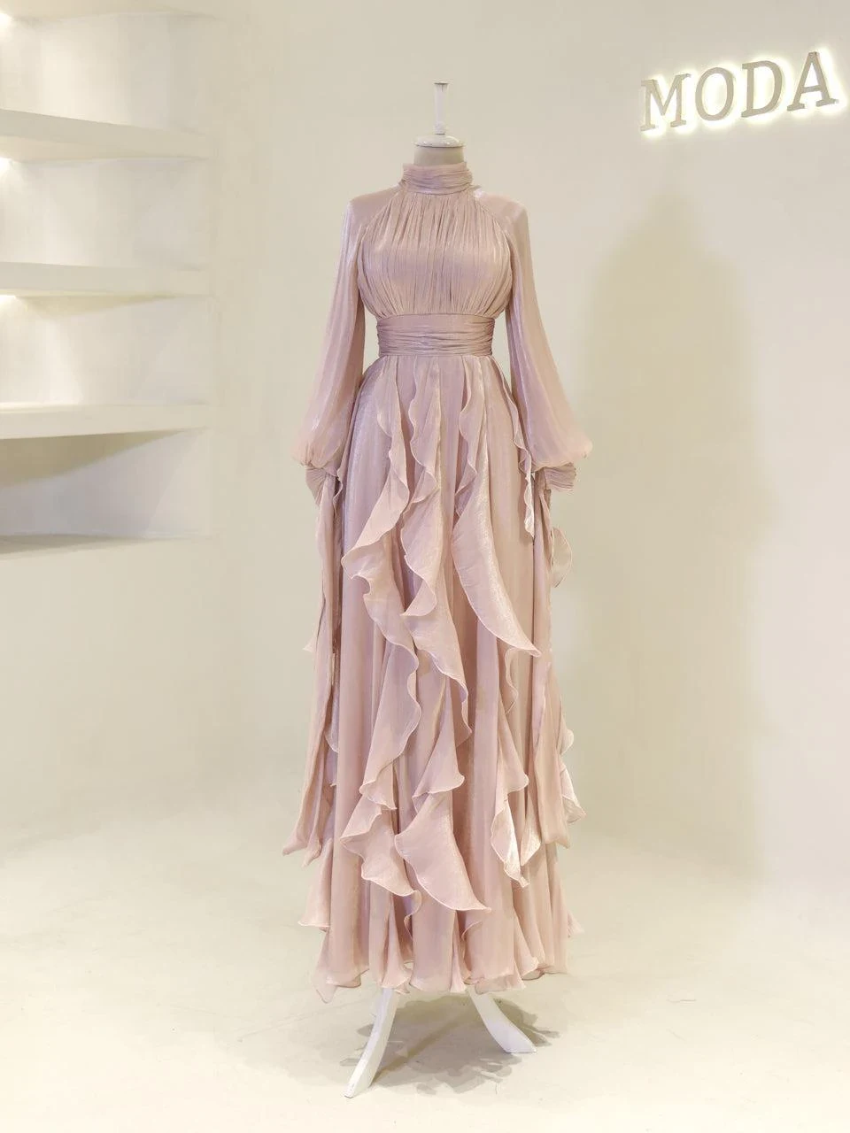 The Nola Modest Evening Dress is designed for a perfect fit, with a length ranging from 160 to 165 cm. Crafted from orchid fabric, this dress includes a lining and features a built-in chest pad for added comfort. The back zipper closure ensures ease of wear, while the cuff ties add a subtle touch of elegance. The dress is designed with a flared skirt, providing a graceful silhouette.