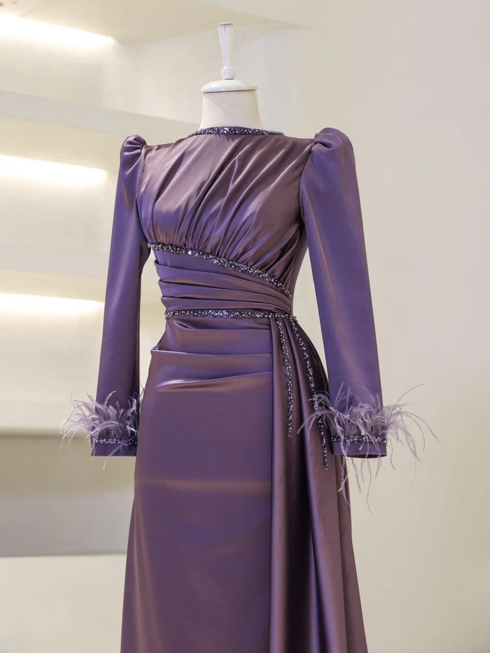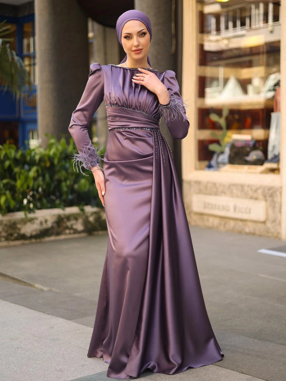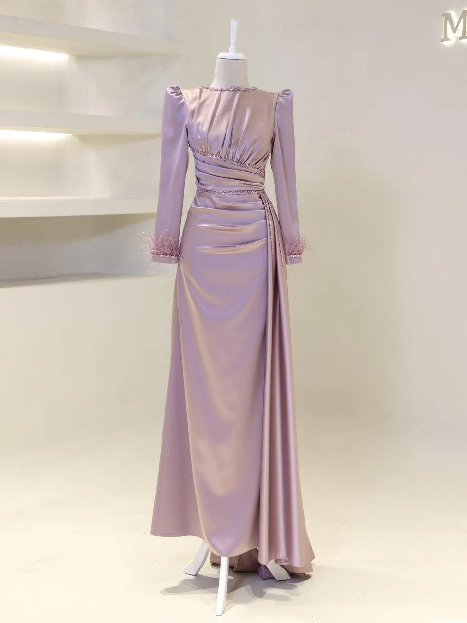 The Ofelya Modest Evening Dress is designed with a true-to-size fit and measures 155 cm in length. Crafted from satin fabric, it features a lining and a back zipper closure. The upper part of the dress is draped, and the embellishments are glued on. The cuffs are adorned with ostrich feather details, and there is a train detail on the side of the skirt. Please note that due to the nature of the glued embellishments, some may become loose, but this will not significantly affect the overall appearance of the dress.