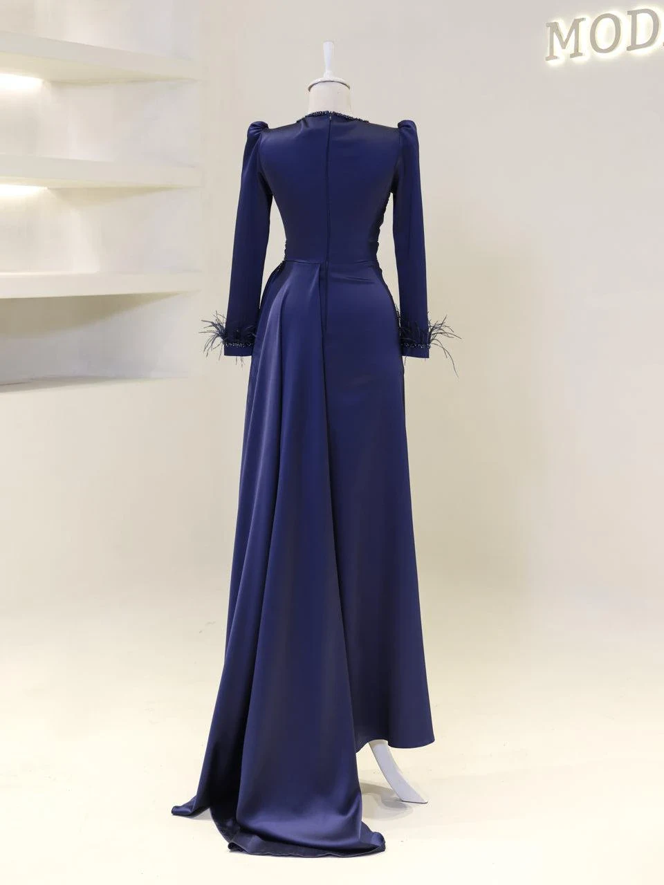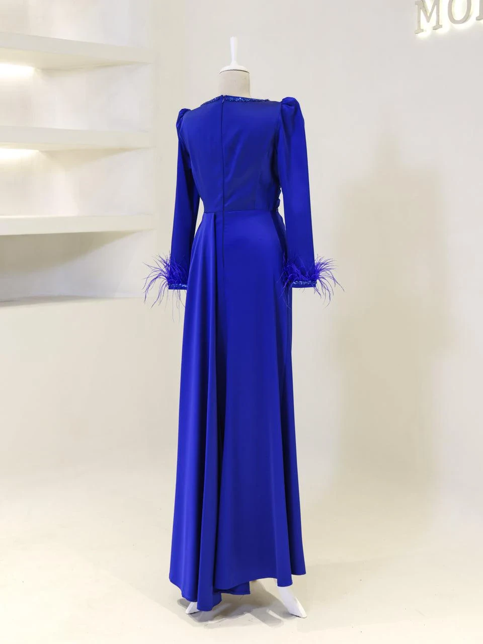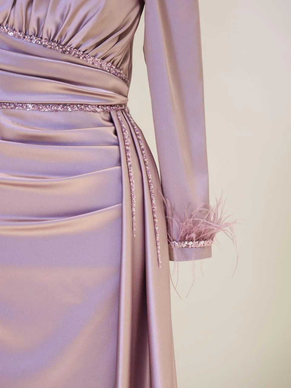 The Ofelya Modest Evening Dress is designed with a true-to-size fit and measures 155 cm in length. Crafted from satin fabric, it features a lining and a back zipper closure. The upper part of the dress is draped, and the embellishments are glued on. The cuffs are adorned with ostrich feather details, and there is a train detail on the side of the skirt. Please note that due to the nature of the glued embellishments, some may become loose, but this will not significantly affect the overall appearance of the dress.