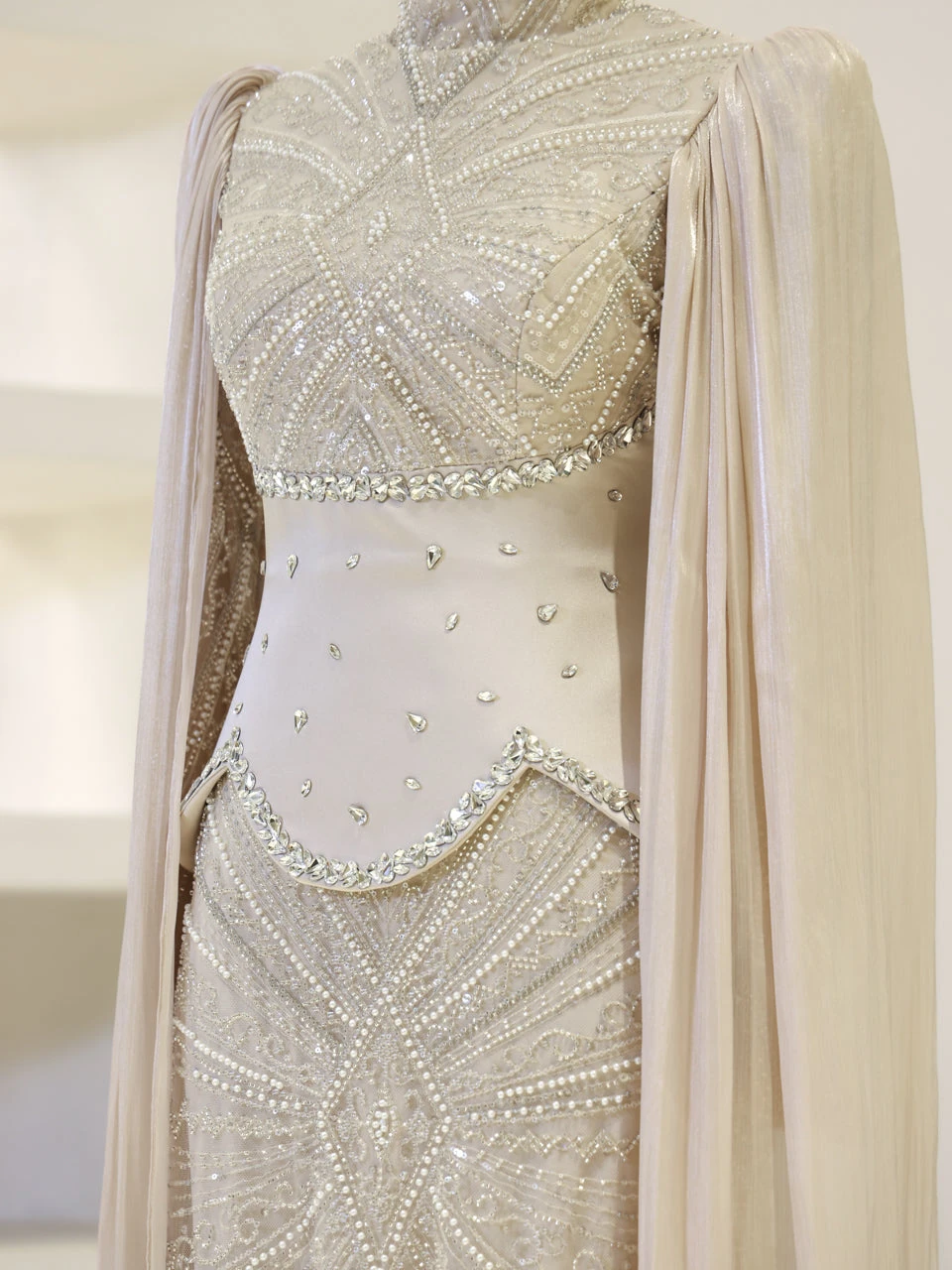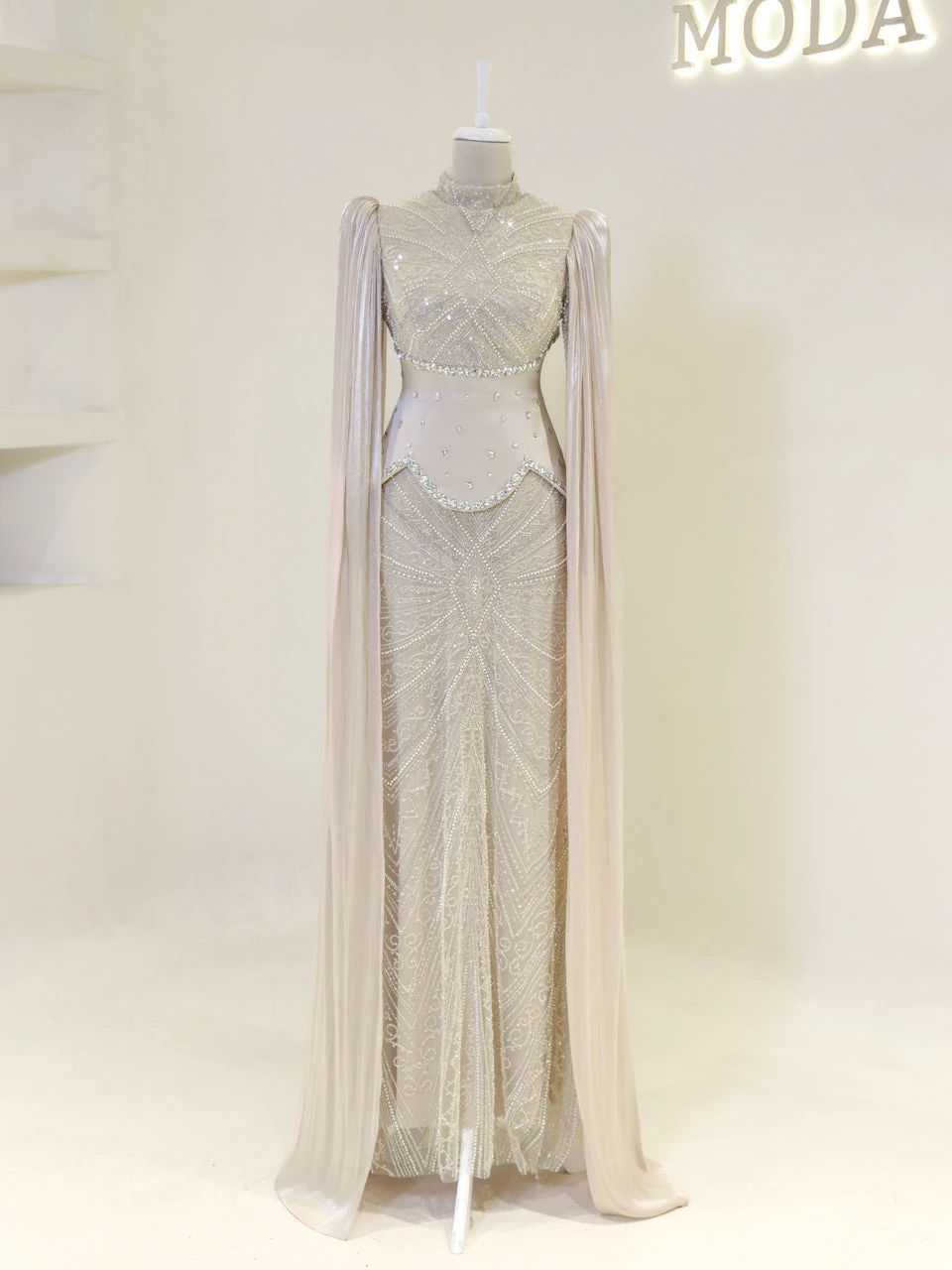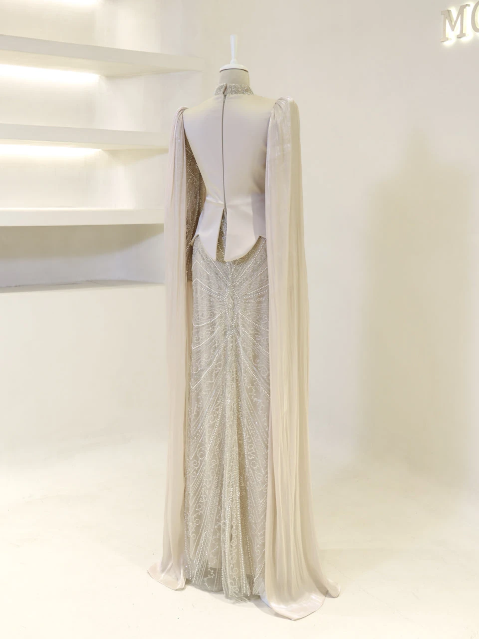 The Pariah Modest Evening Dress is designed with a perfect fit, measuring 160 cm in length. The upper part is crafted from satin fabric, while the lower part features tulle material. This dress includes a back zipper closure and built-in chest pads for added comfort. It is fully lined and features a cape detail that extends from the shoulders to the hem. The dress is adorned with sewn and glued embellishments and has a straight skirt form.