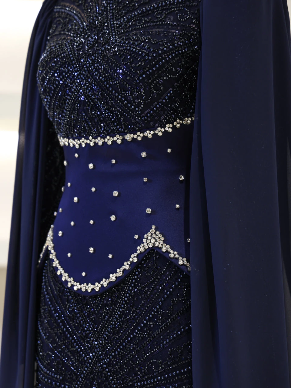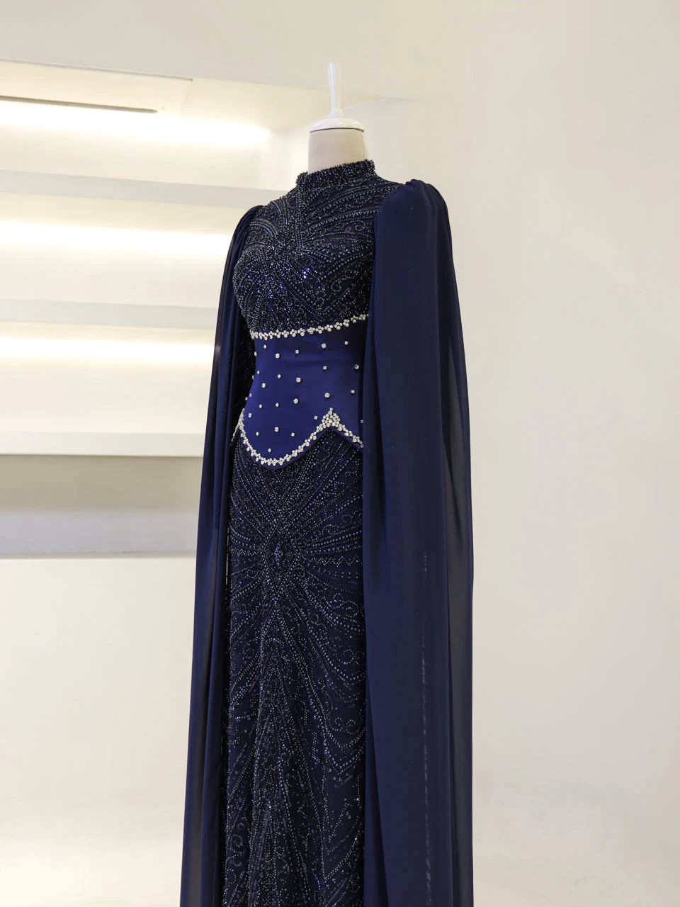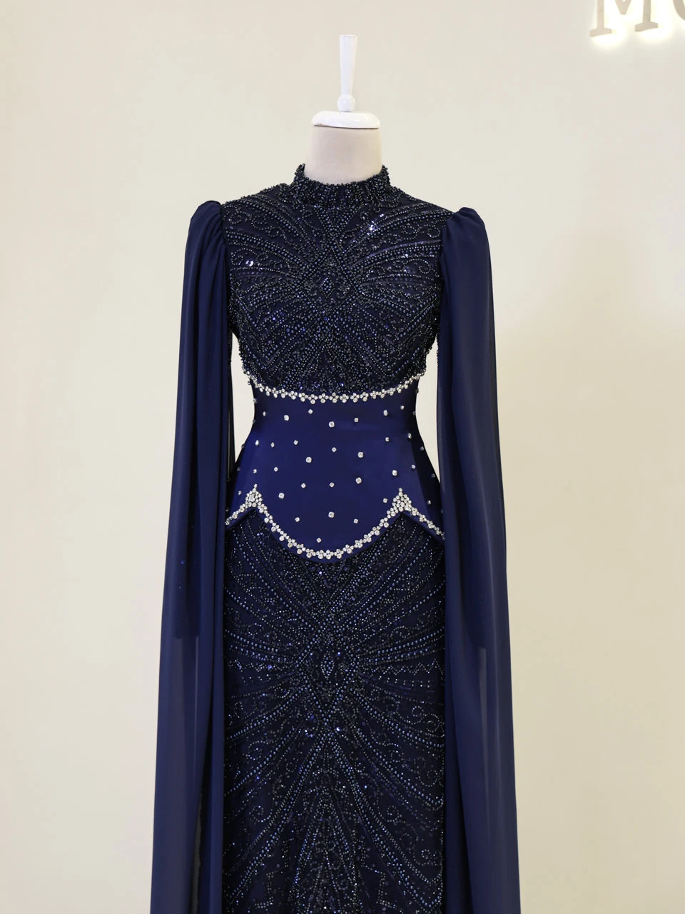 The Pariah Modest Evening Dress is designed with a perfect fit, measuring 160 cm in length. The upper part is crafted from satin fabric, while the lower part features tulle material. This dress includes a back zipper closure and built-in chest pads for added comfort. It is fully lined and features a cape detail that extends from the shoulders to the hem. The dress is adorned with sewn and glued embellishments and has a straight skirt form.