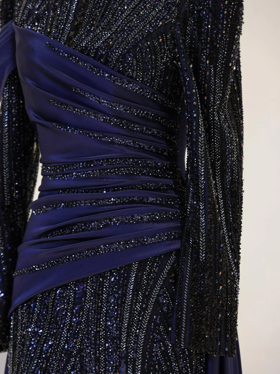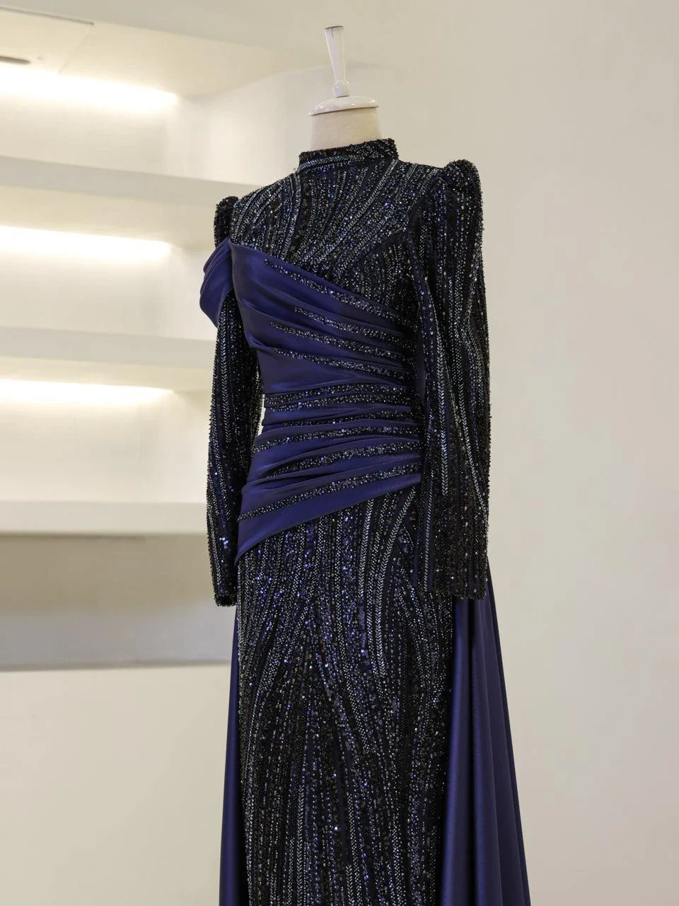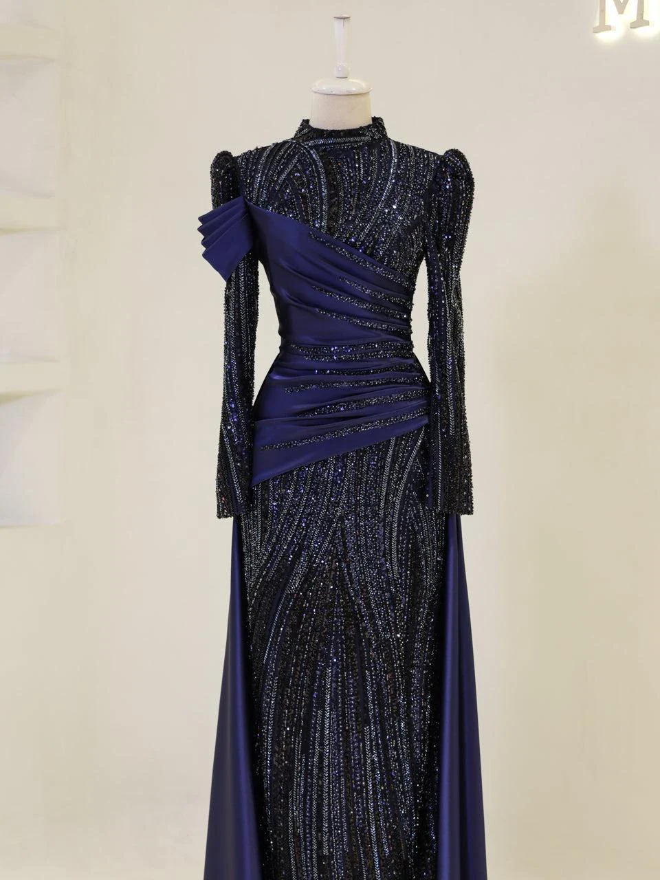 The Parla Modest Evening Dress offers a perfect fit with an average length of 165 cm. Made from luxurious satin fabric, this dress features a full lining and a back zipper for ease of wear. The embellishments are securely attached, and the skirt section includes a cape-like overlay with a pencil form inner skirt.