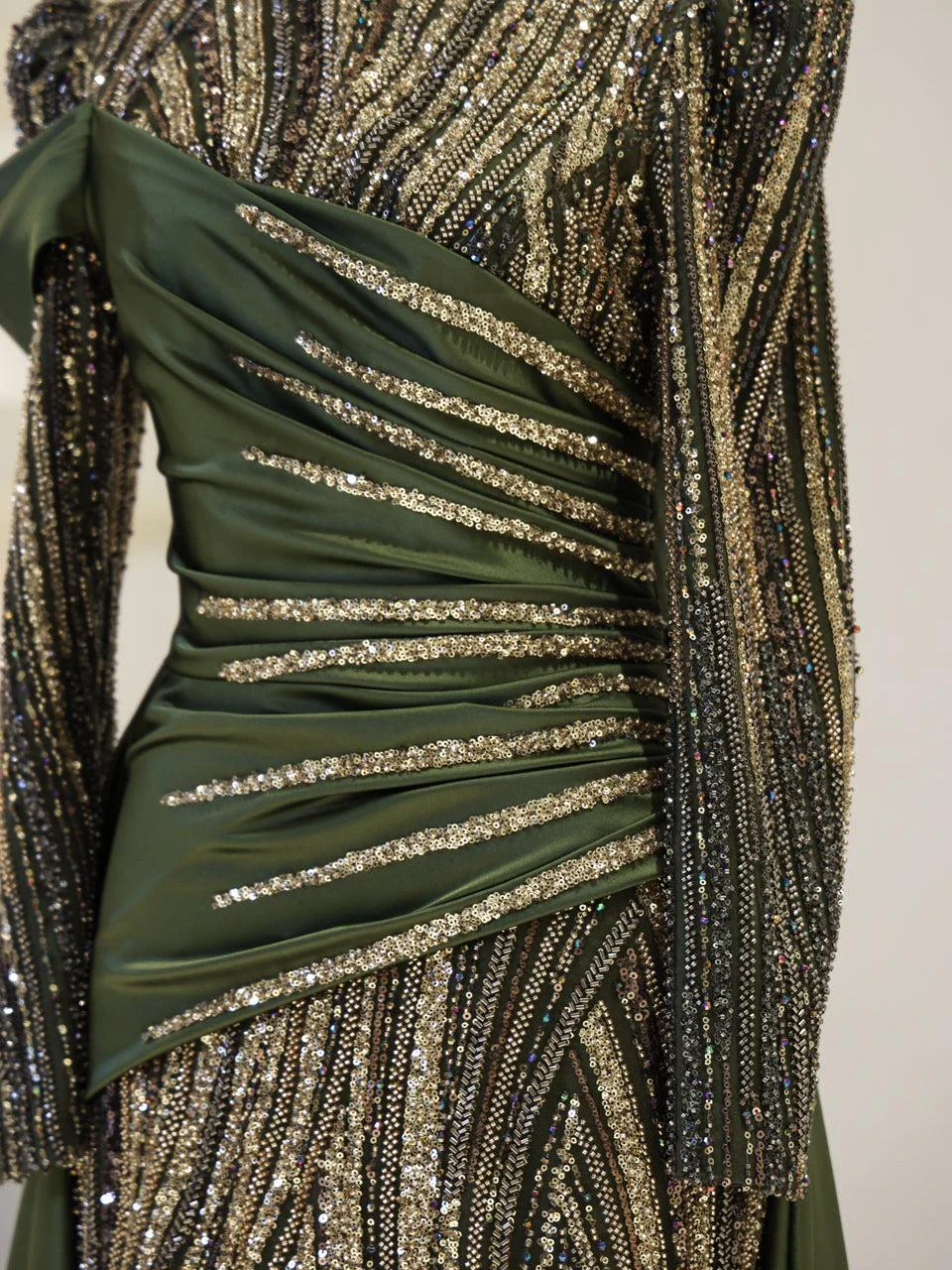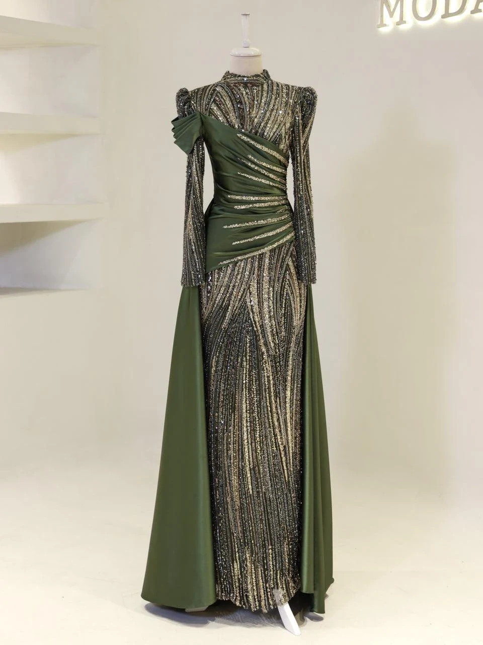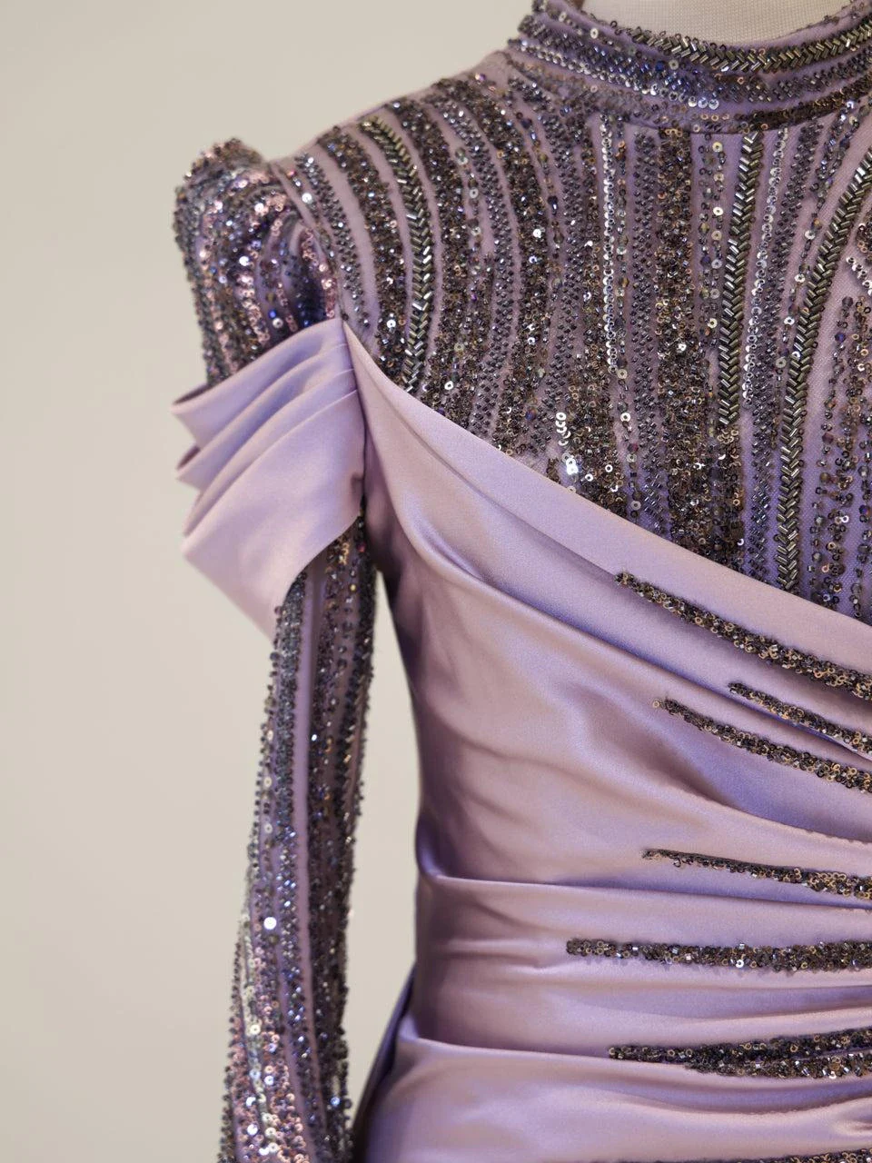 The Parla Modest Evening Dress offers a perfect fit with an average length of 165 cm. Made from luxurious satin fabric, this dress features a full lining and a back zipper for ease of wear. The embellishments are securely attached, and the skirt section includes a cape-like overlay with a pencil form inner skirt.