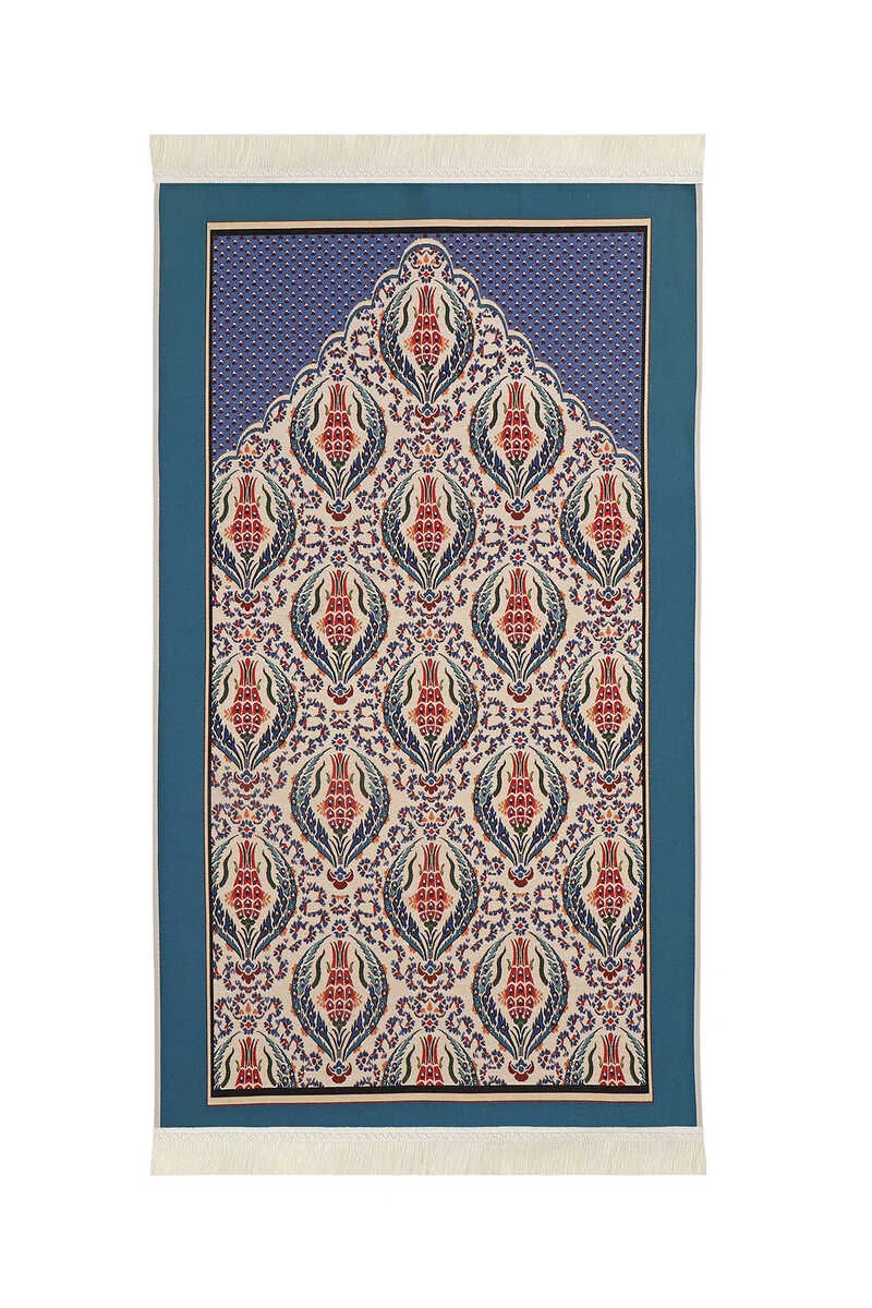 This Petrol Blue Tulip Pattern Gobelin Prayer Rug features a gobelin texture with eye-catching colors and traditional Turkish and tile motifs. Designed for decorative appeal, it measures 70 x 110 cm, providing comfortable use. Originating from Bursa, Turkey, this prayer rug combines cultural aesthetics with practical design.