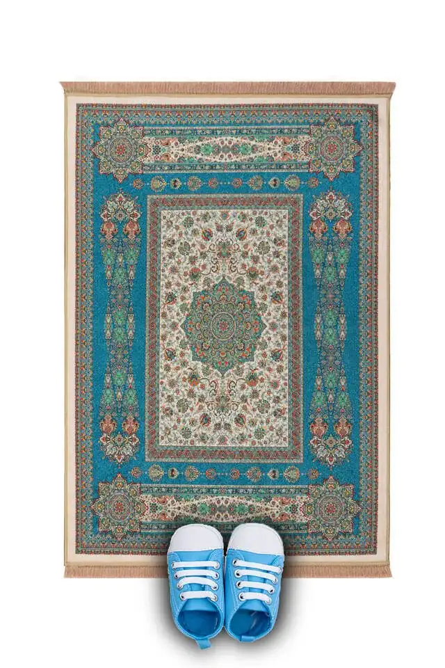 The Petrol Mavi Kadife Çocuk Seccadesi Ve Oyun Halısı is a velvet prayer mat and play rug designed for children, featuring an eye-catching color and pattern. It measures 45x80cm and is made in Bursa, Turkey.