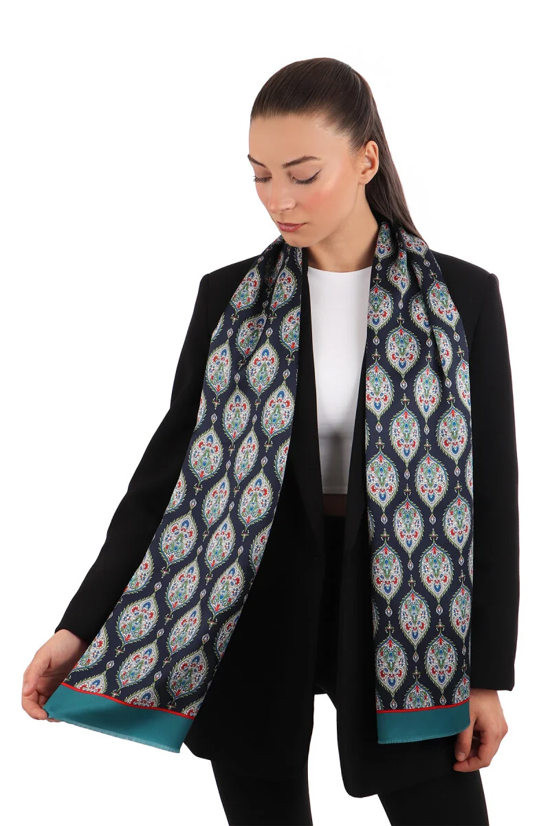Petrol Green Hatai Pattern Narrow Silk Scarf