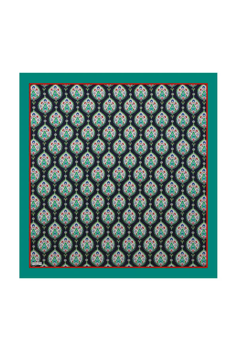 The Petrol Yeşil Hatai Desen İpek Eşarp is a 90×90 cm scarf made from 100% silk. It originates from Bursa, Turkey and offers ease of use.