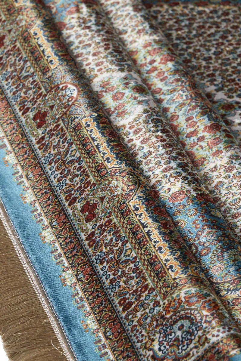 The Petrol Green Velvet Prayer Rug features a silky texture and eye-catching colors. It showcases traditional Turkish motifs combined with intricate tile patterns, offering a decorative touch to any space. Measuring 65×115 cm, this rug is designed for comfortable use. Originating from Bursa, Turkey, it reflects the region's rich textile heritage.