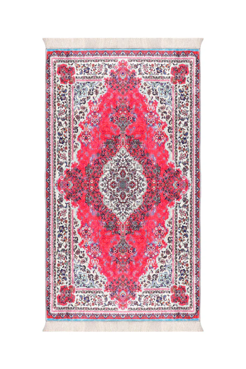 The Pembe Kadife Halı Seccade features a silky texture and eye-catching colors, designed for decorative appeal. It measures 65 x 115 cm and is made in Bursa, Turkey.