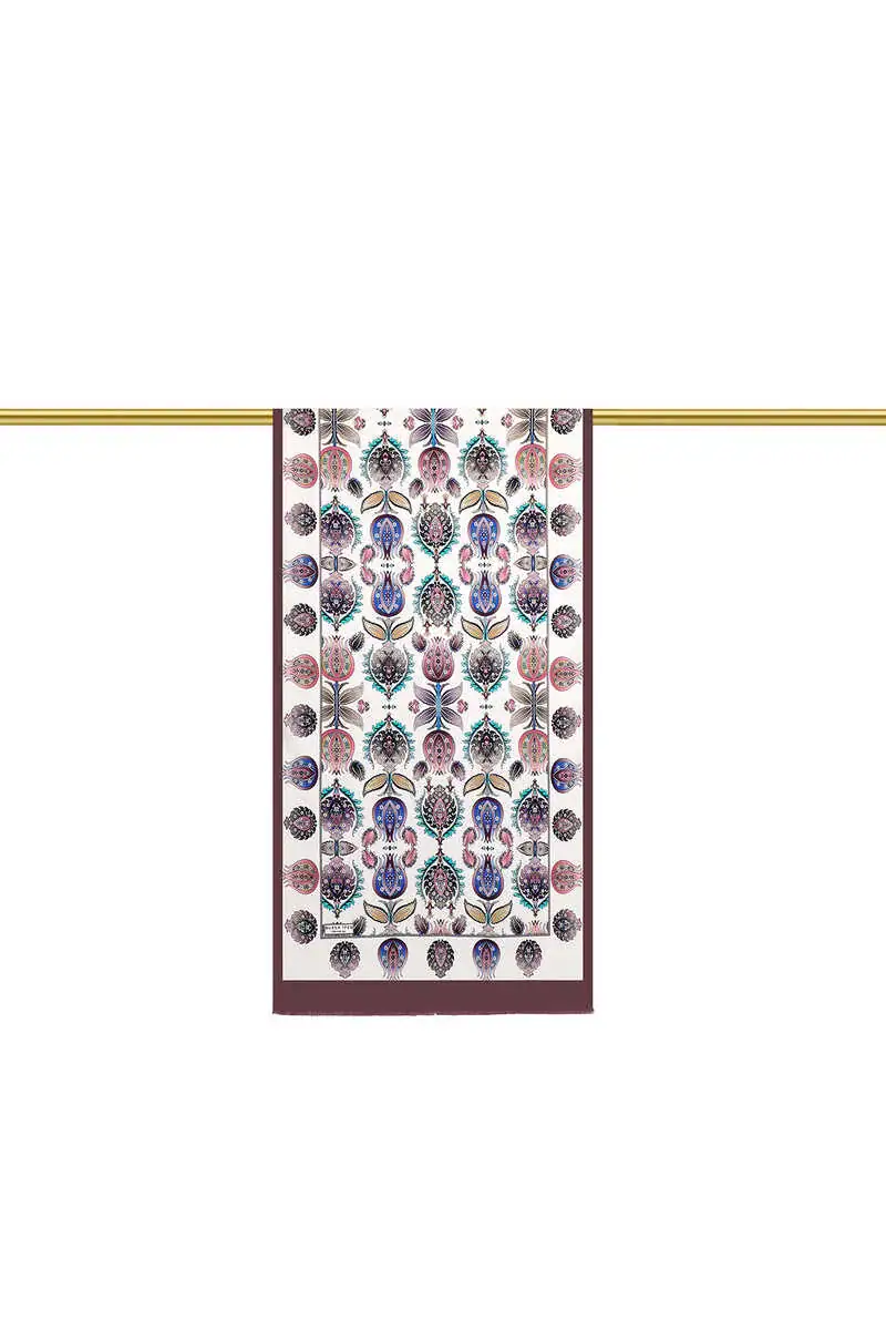 The Mürdüm İznik Desen Dar İpek Fular is a narrow silk scarf featuring eye-catching patterns in a plum color. Made from 100% silk, it measures 45 x 165 cm and originates from Bursa, Turkey.