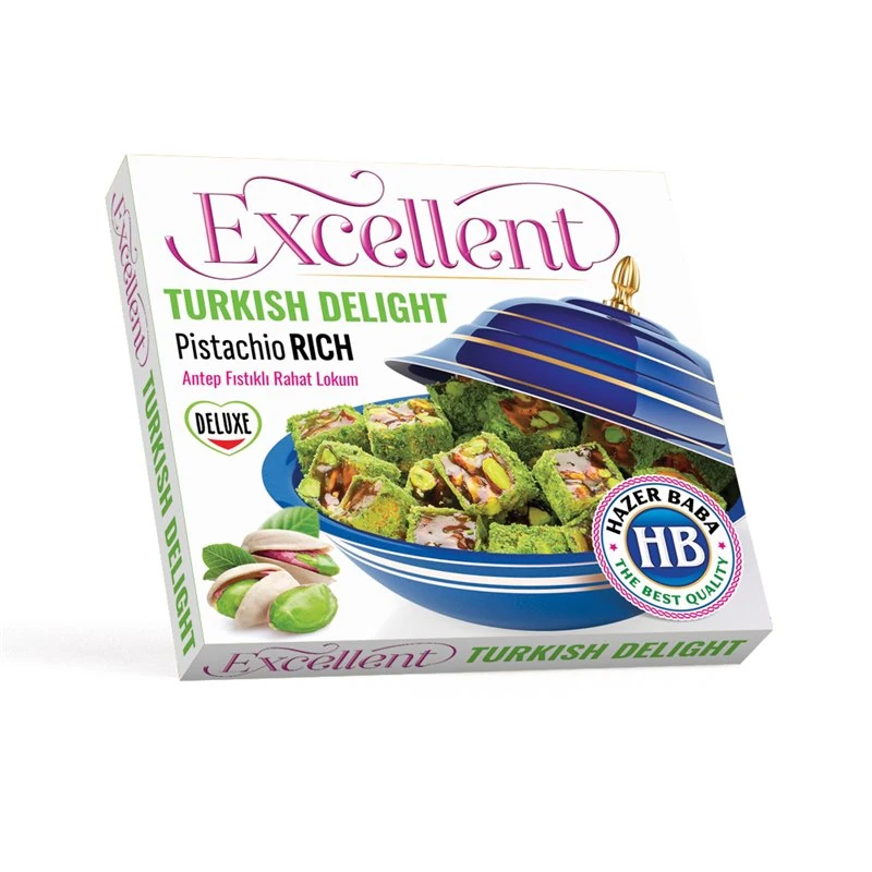 This Turkish delight is coated with powdered pistachios and contains 20% pistachios. The ingredients include sugar, pistachios, starch, water, vanilla flavor, and citric acid as an acidity regulator. It may contain traces of other nuts, gluten, sesame, sulfur dioxide, milk, and dairy products. Made in Turkey.