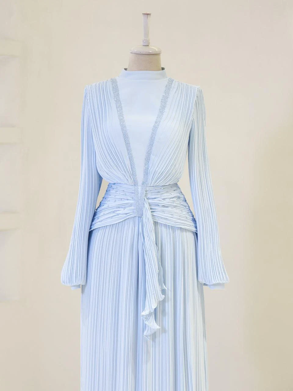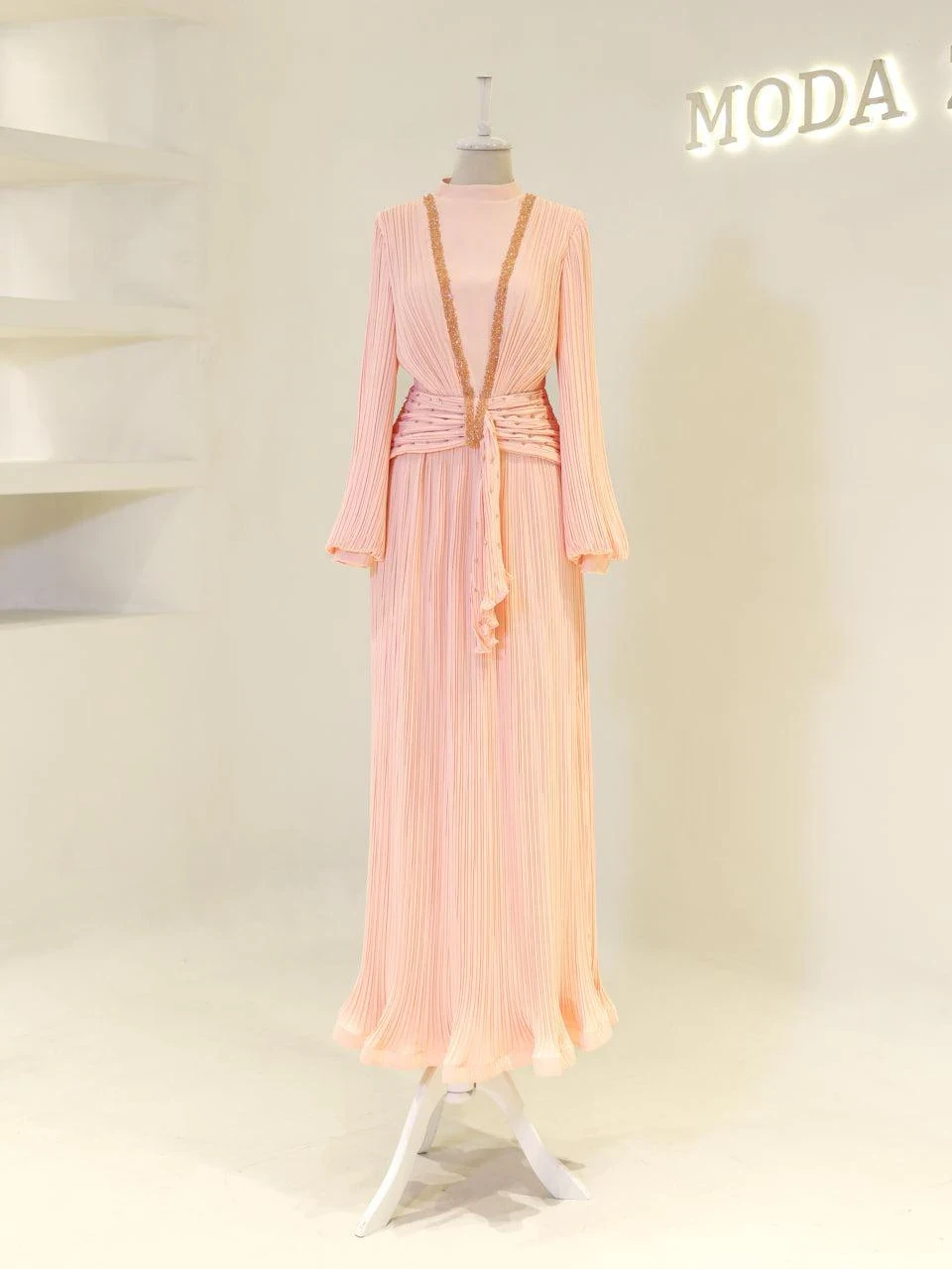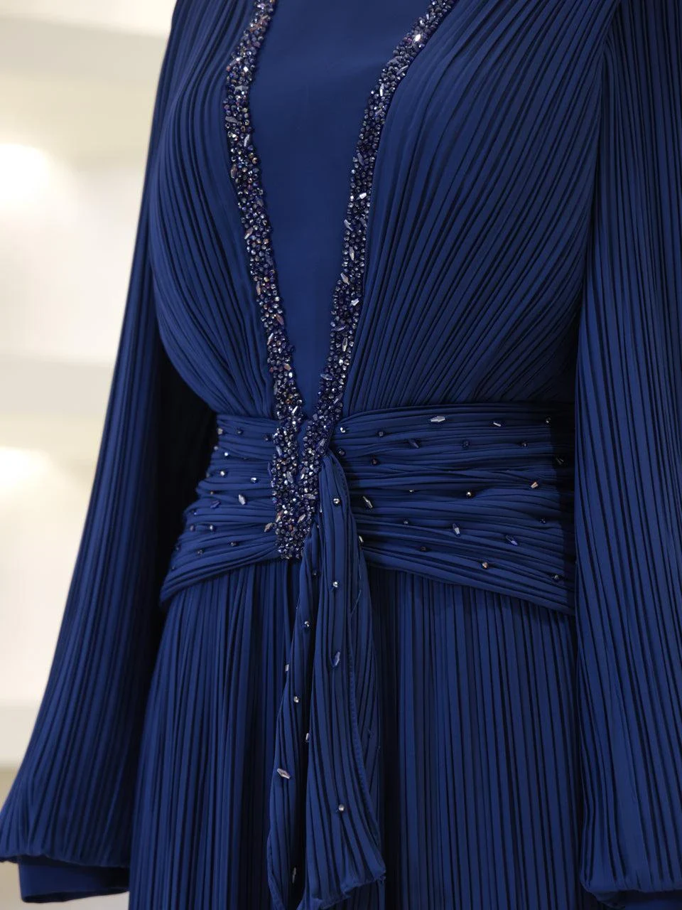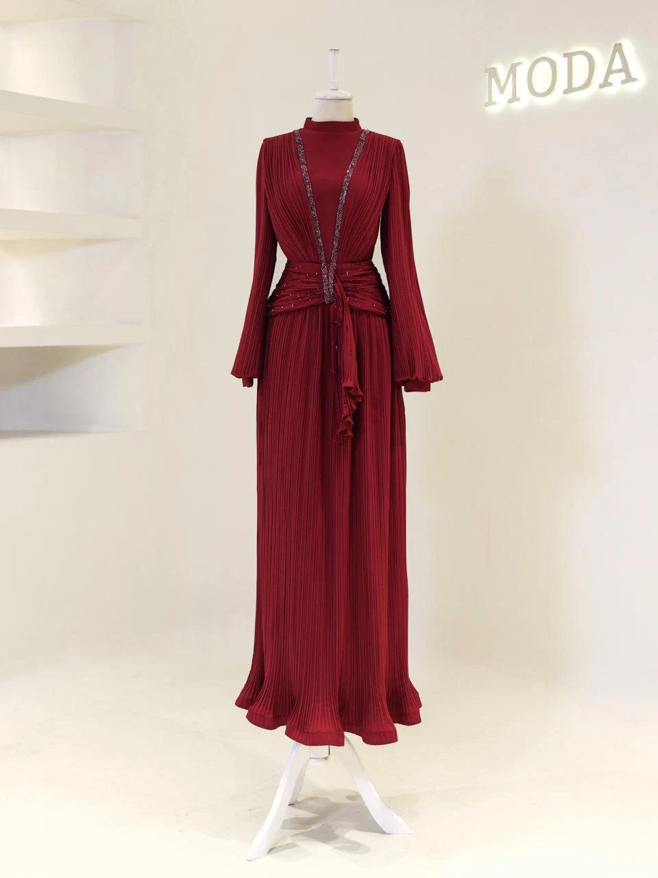 The Purella Modest Evening Dress offers a classic fit with an average length of 150 cm. Crafted from pleated crepe fabric, this dress includes a back zipper for easy wear and a comfortable lining. It features balloon sleeves and a straight skirt design. The dress is equipped with a chest pad for added comfort. Please note that the embellishments are adhesive and may experience minor shedding, which will not affect the overall appearance of the dress.