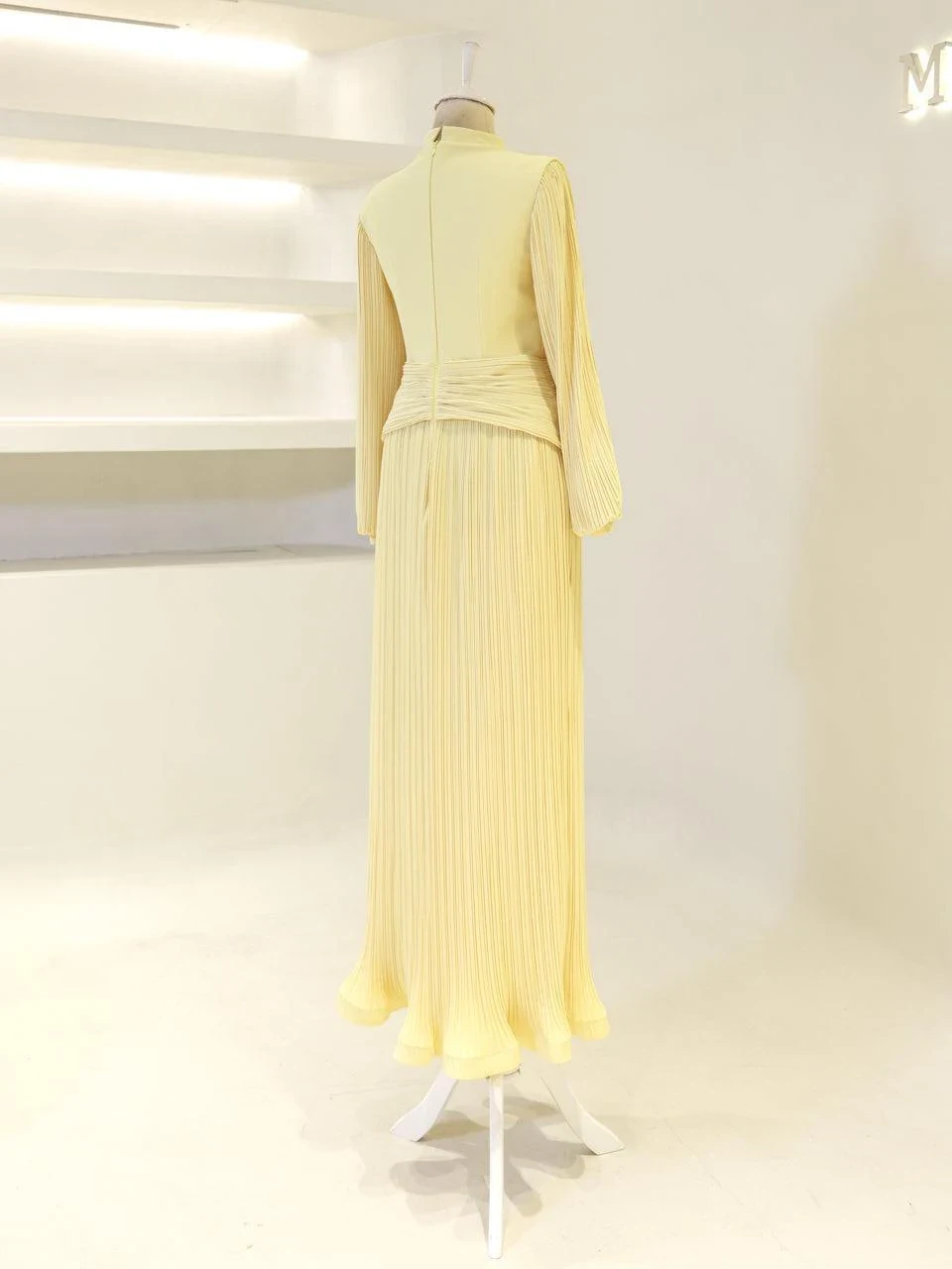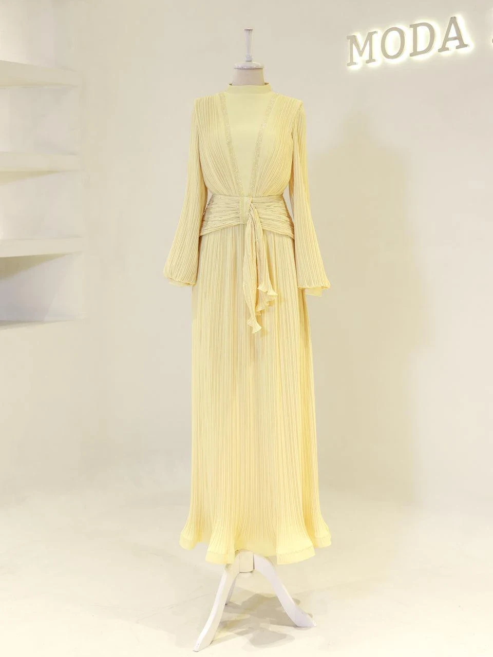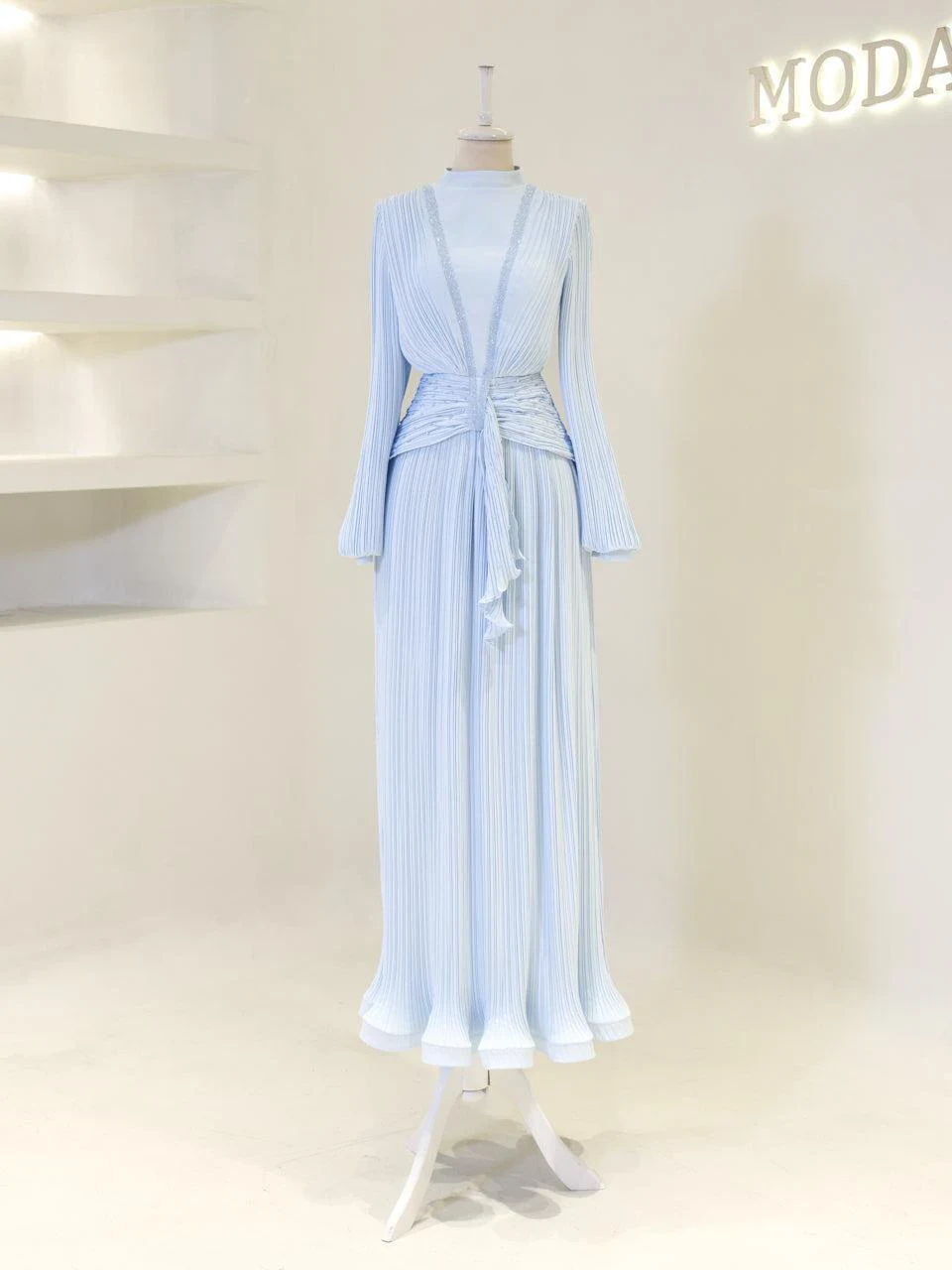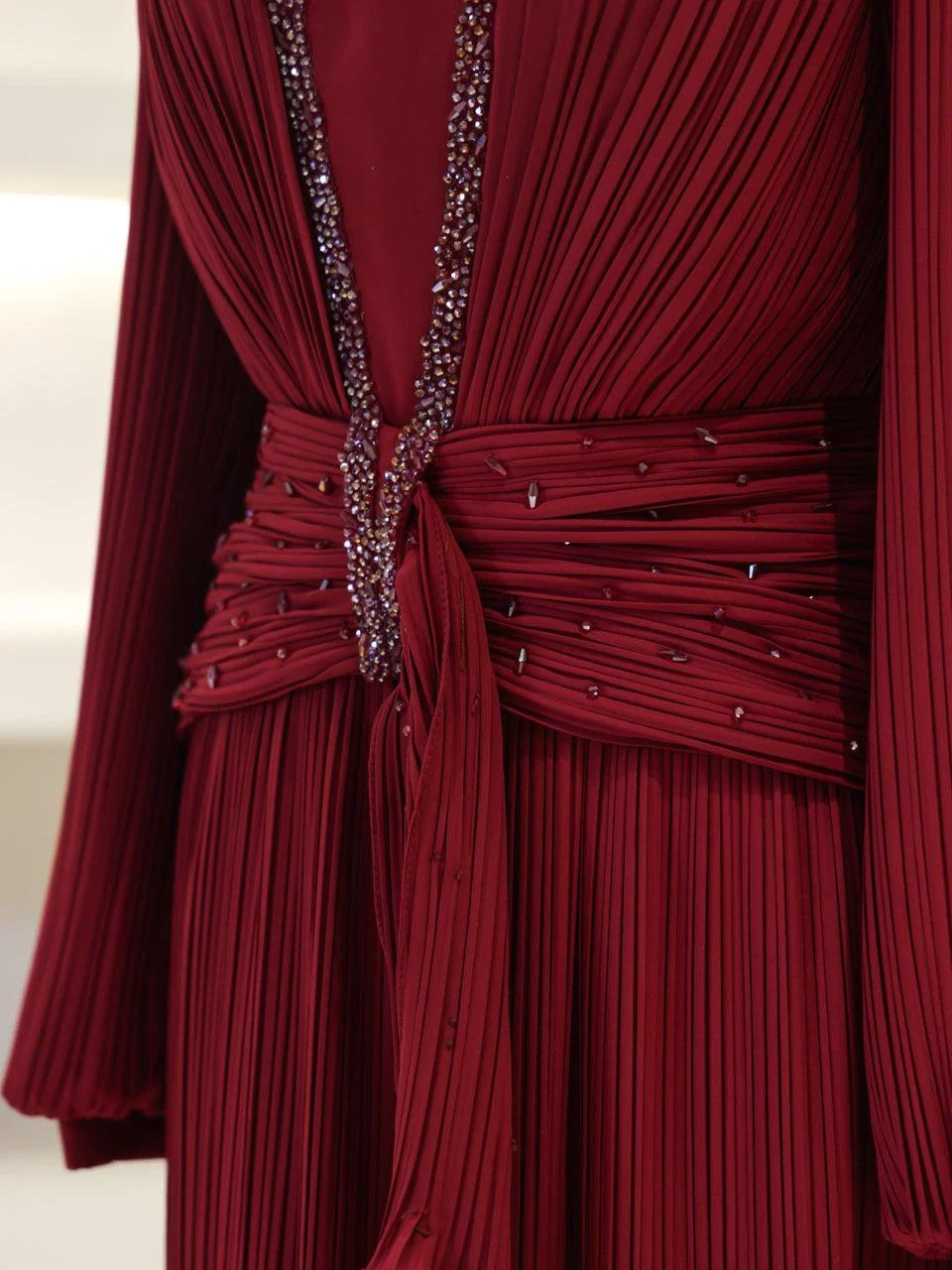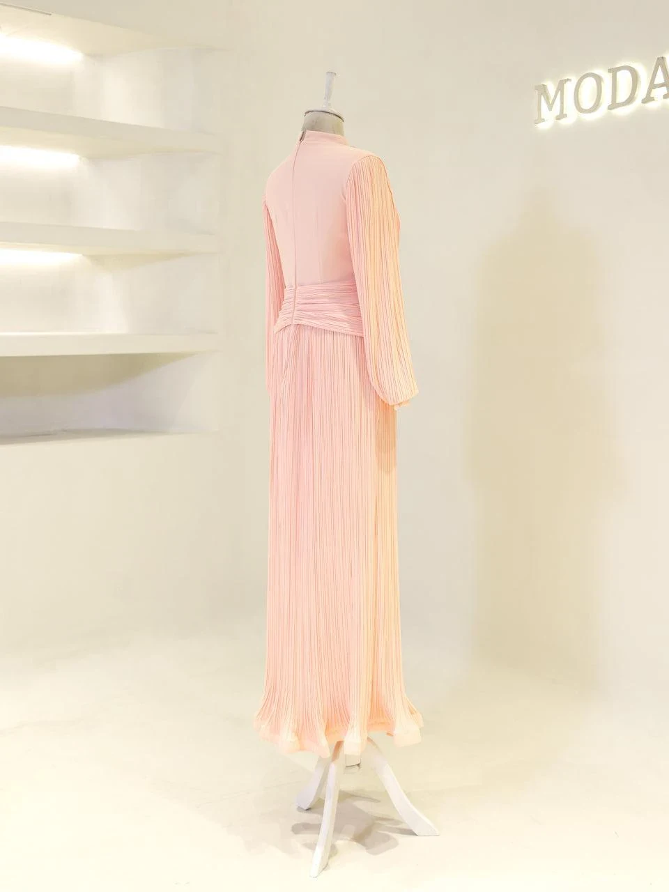 The Purella Modest Evening Dress offers a classic fit with an average length of 150 cm. Crafted from pleated crepe fabric, this dress includes a back zipper for easy wear and a comfortable lining. It features balloon sleeves and a straight skirt design. The dress is equipped with a chest pad for added comfort. Please note that the embellishments are adhesive and may experience minor shedding, which will not affect the overall appearance of the dress.