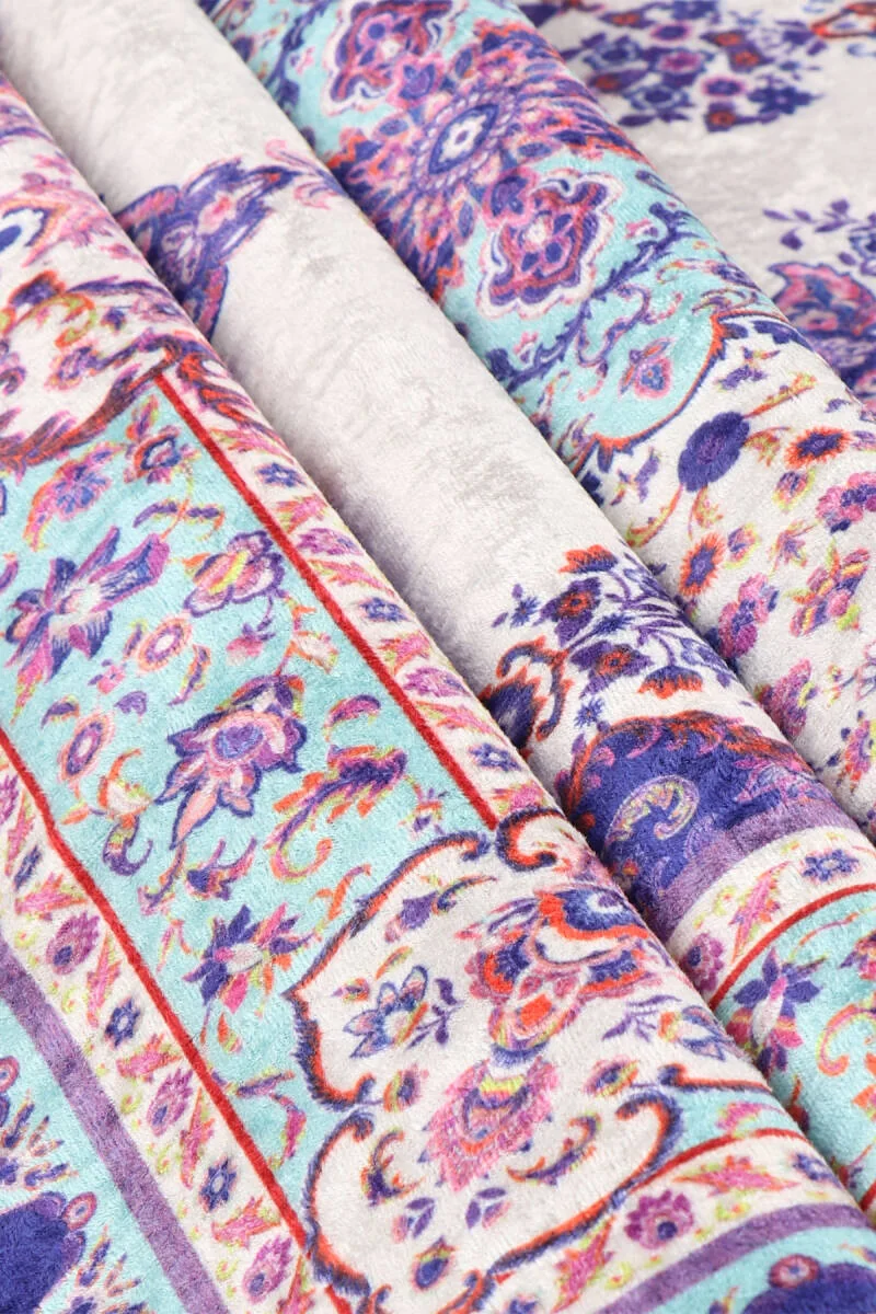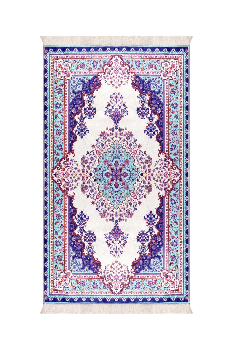 The Mor Kadife Halı Seccade features a silky texture and eye-catching colors, designed for decorative appeal. It measures 65 x 115 cm and is made in Bursa, Turkey.