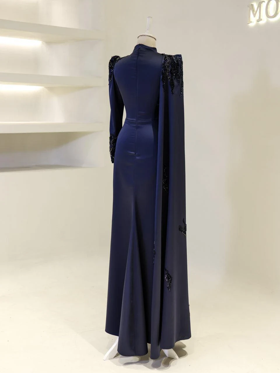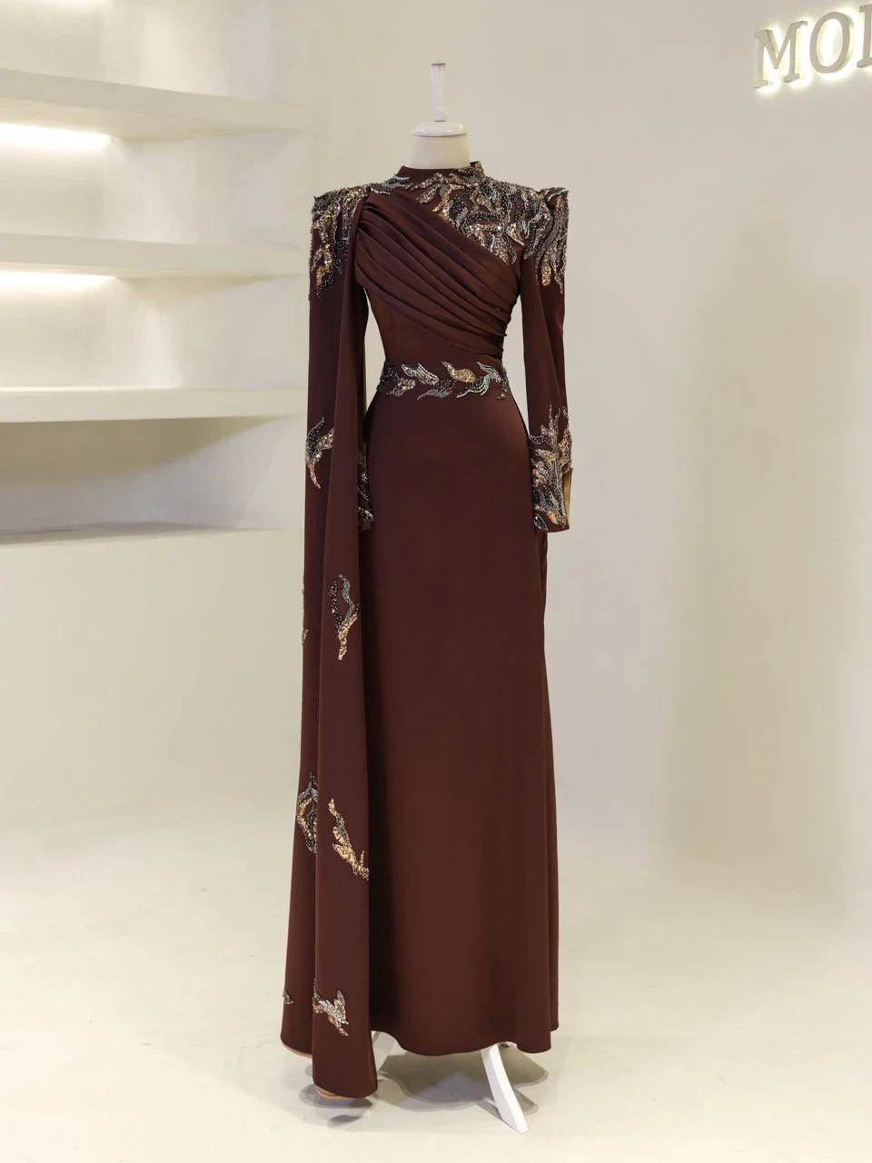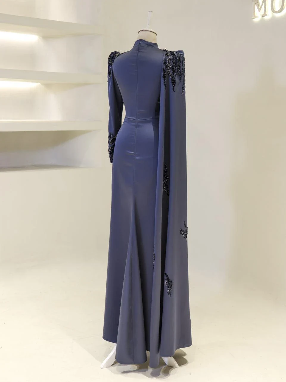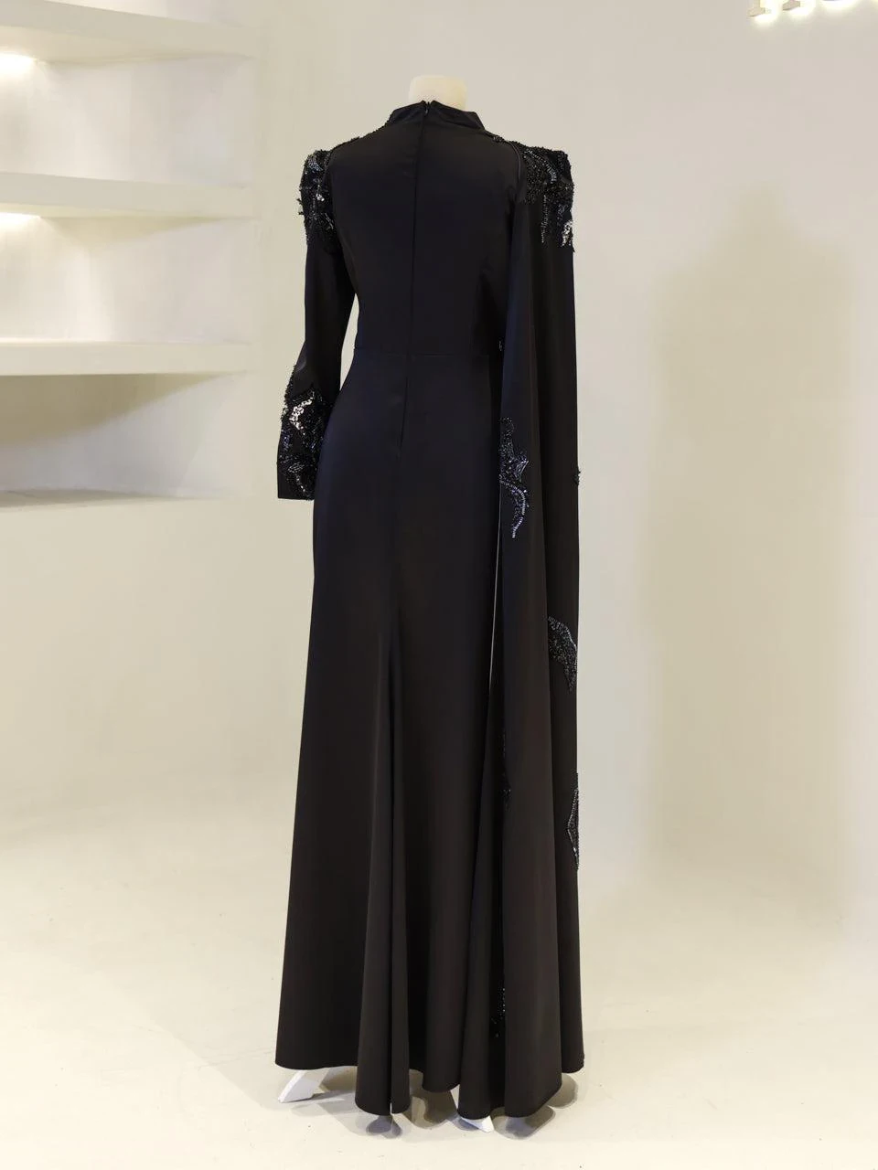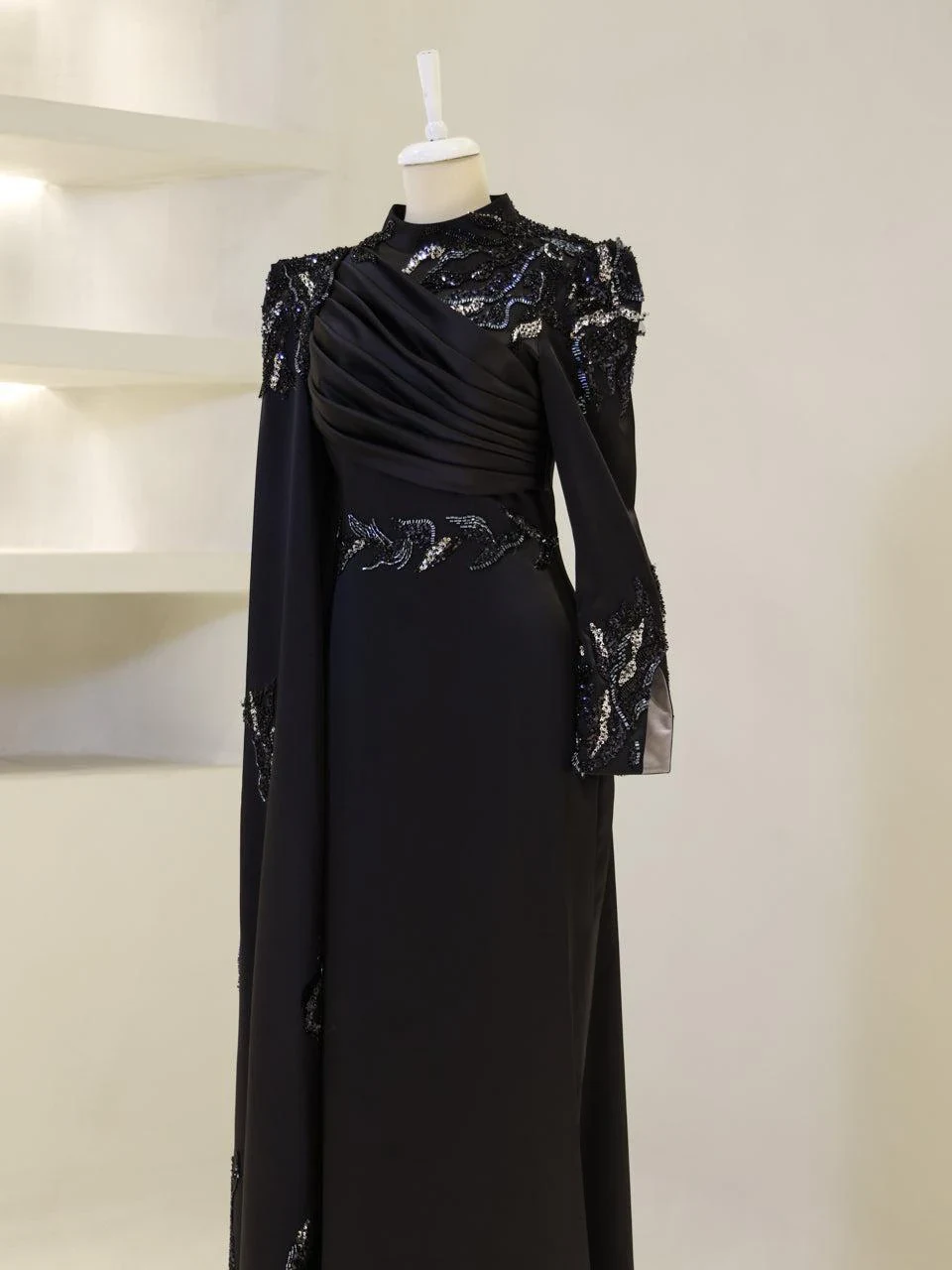 The Rabiye Modest Evening Dress is designed to offer elegance and comfort. It features a full-length design with an average length of 160 cm. Made from satin fabric, this dress includes a lining for added comfort. The back zipper allows for easy wear. A unique cape detail extends from the right shoulder to the hem, adding a distinctive touch. The dress is adorned with adhesive embellishments and has a flared skirt form.