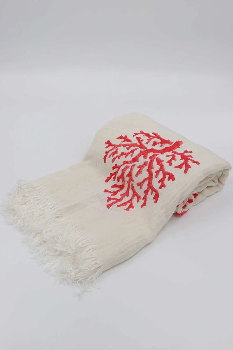 The Kırmızı Taş Baskı Mercan Peştemal is a red towel with a coral design, made from 100% muslin and measuring 100×190 cm. It absorbs water quickly, dries fast, takes up little space, and is suitable for use in the bath, at the beach, by the pool, or as home decor.