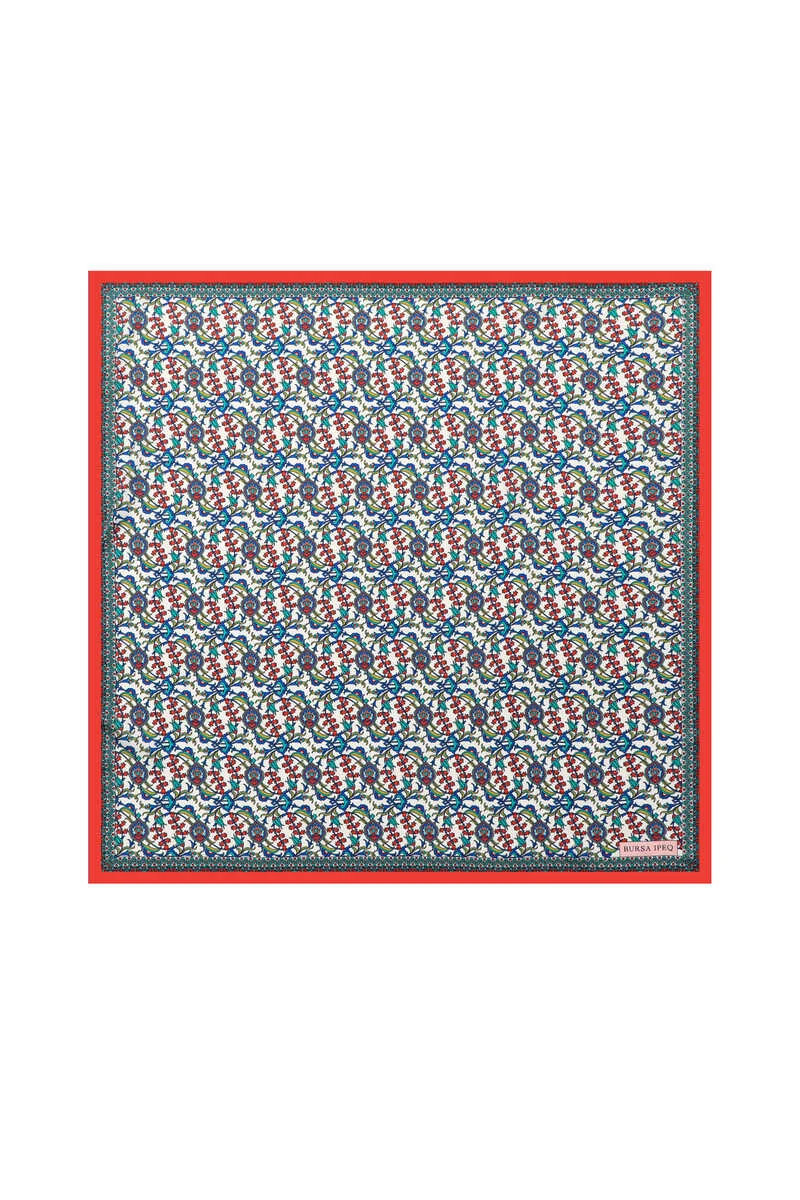 The "Kırmızı Sarmaşık Lale Desen İpeksi Mendil" is a silk-like handkerchief featuring a red ivy tulip pattern. It measures 55×55 cm and is made from silky rayon with hand-rolled stitching, originating from Bursa, Turkey.
