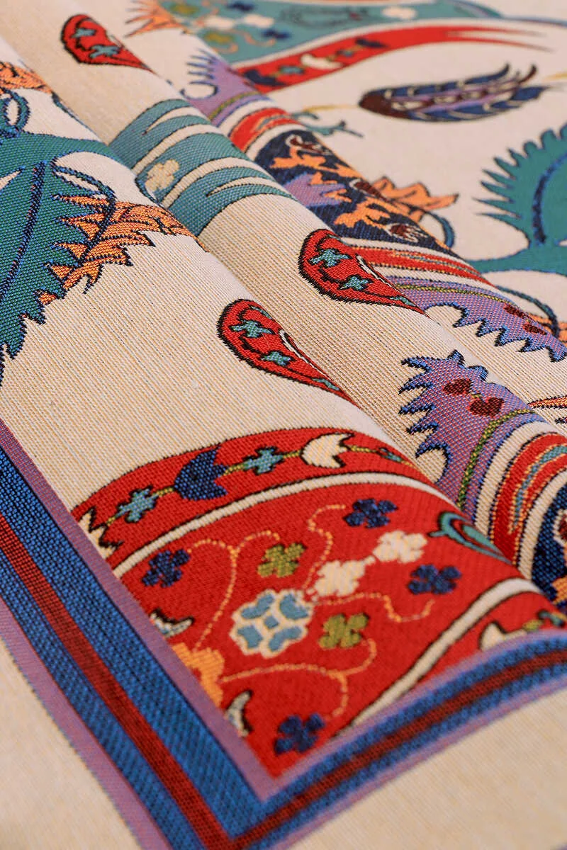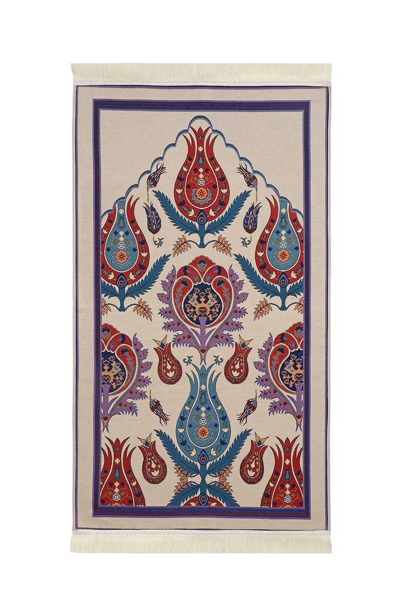 This prayer rug features a gobelin texture that highlights its vibrant colors and intricate Turkish motifs combined with tile patterns. Designed in Bursa, Turkey, it measures 70 x 110 cm, providing ample space for comfortable usage. The decorative appearance makes it a suitable addition to any setting.