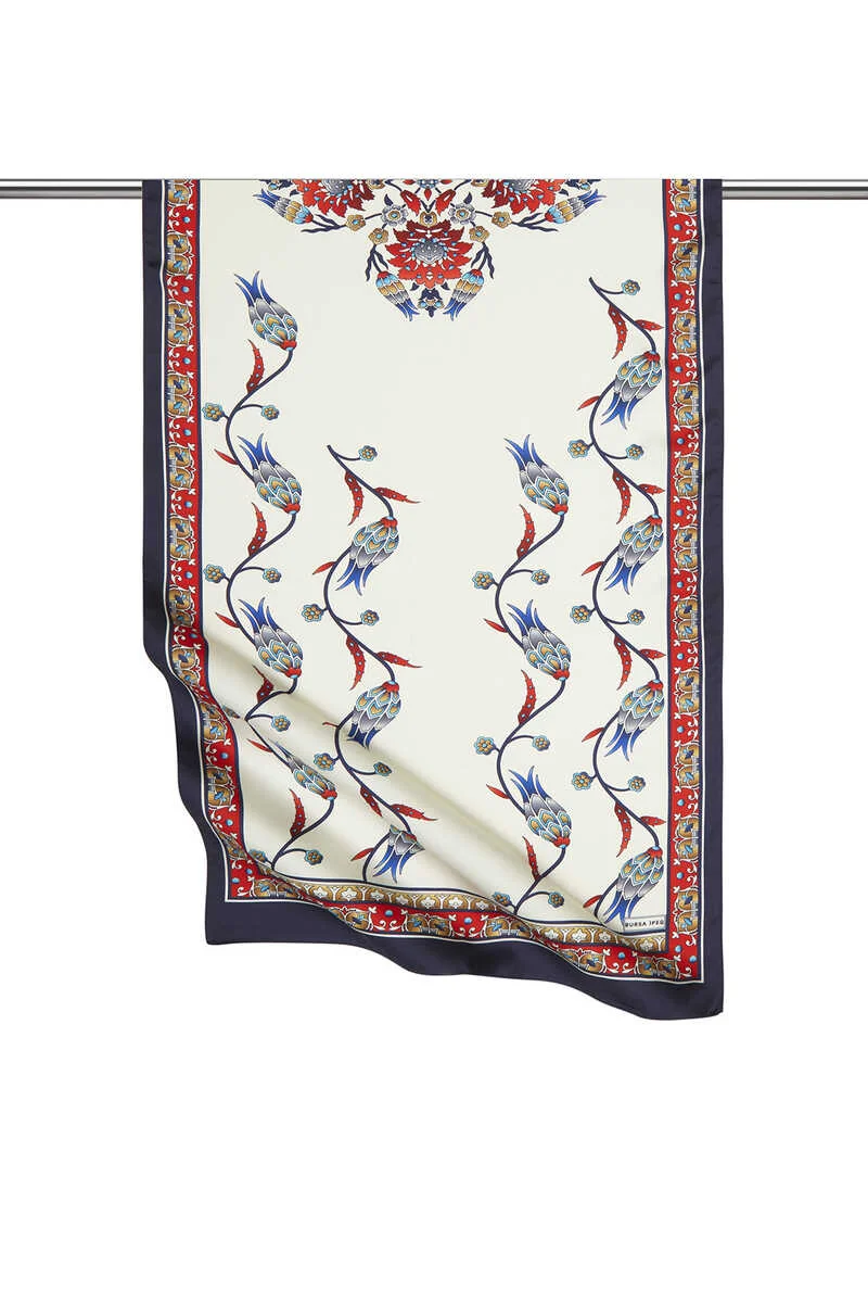 The "Kırmızı Lacivert Sıra Lale Desen Geniş İpeksi Fular" is a scarf featuring red and navy tulip patterns on silky rayon fabric. It measures 55×160 cm and originates from Bursa, Turkey.