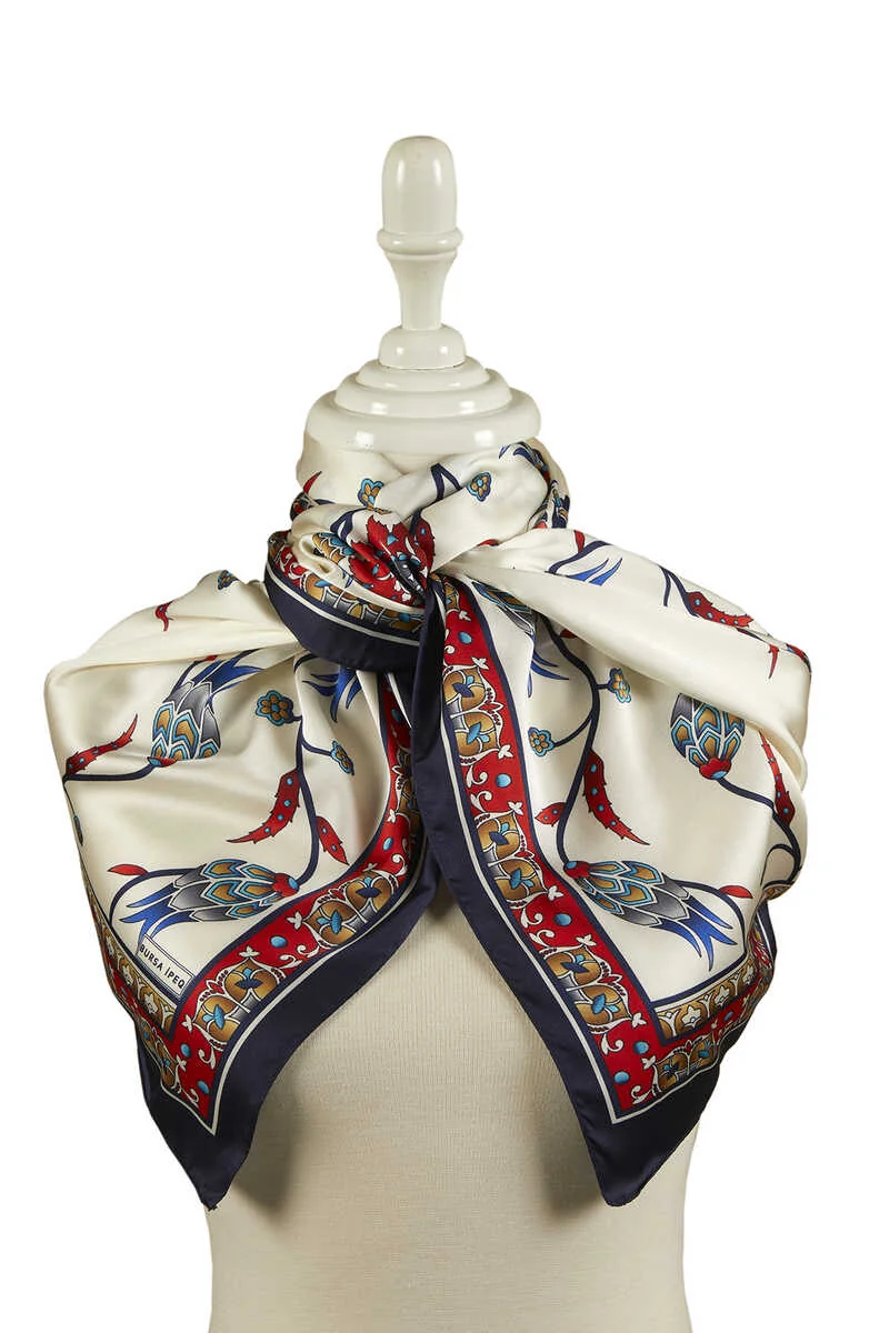 This wide scarf features a red and navy tulip pattern on a silky rayon fabric, offering both style and comfort. Its vibrant colors make it a versatile accessory for various outfits. Measuring 55×160 cm, it provides ease of use whether draped over the shoulders or tied around the neck. Originating from Bursa, Turkey, this scarf combines traditional design with modern flair.