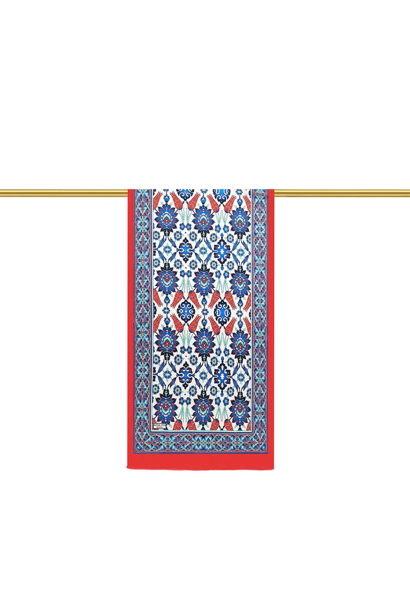 The Kırmızı Çini Lale Desen Dar İpek Fular is a red silk scarf with eye-catching patterns, measuring 45 x 165 cm. Made from 100% silk, it originates from Bursa, Turkey.
