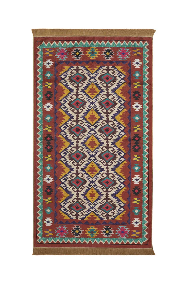 The Kırmızı Kadife Halı Seccade features a silky texture and eye-catching colors with Turkish motifs and ceramic patterns. It is designed for comfortable use with dimensions of 65×115 cm and originates from Bursa, Turkey.