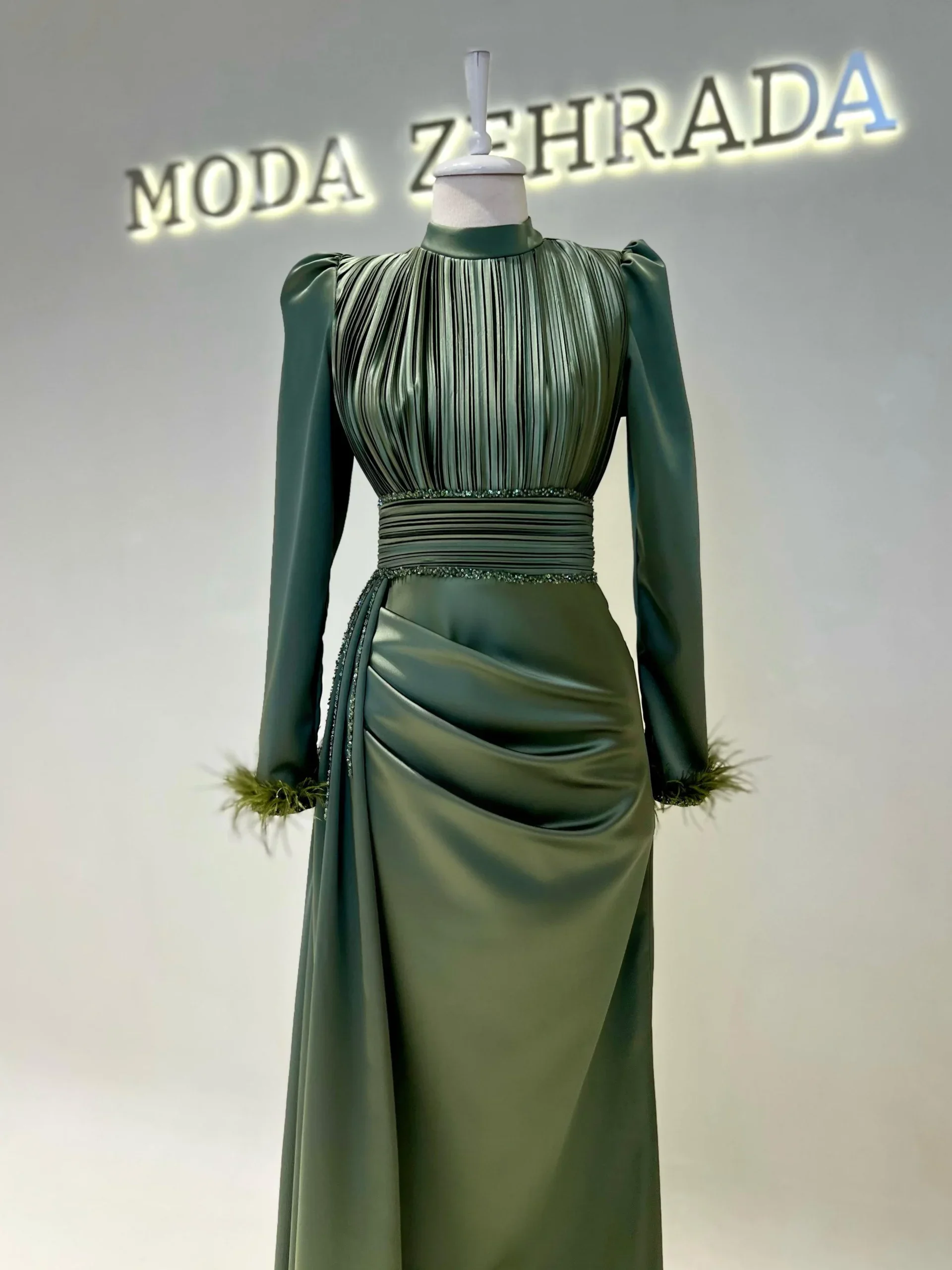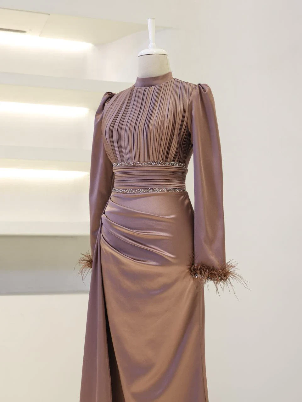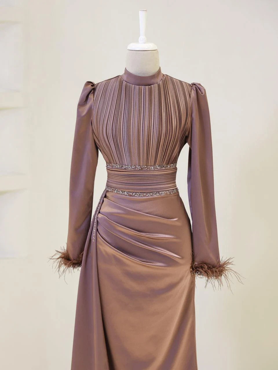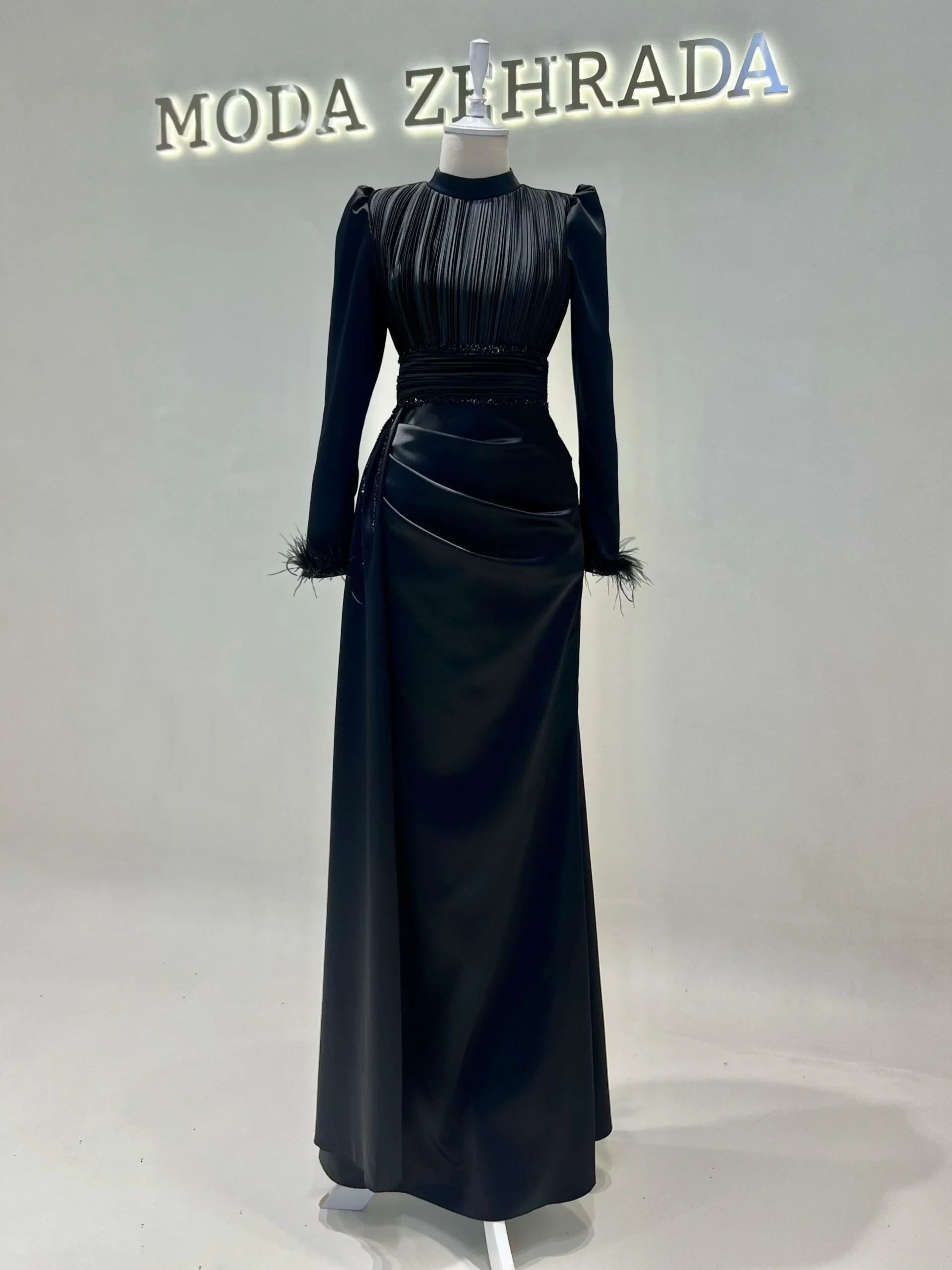The Riva Modest Evening Dress is designed with a length of 160 cm and crafted from satin fabric. It features a back zipper closure and a mandarin collar. The dress includes a flap detail on the right side and pleated details on the belt and bodice. The sleeves have attached feather embellishments. It is tailored to fit true to size and has an A-line skirt. Please note: The embellishments are glued, which may result in some falling off, but this will not affect the overall design.
