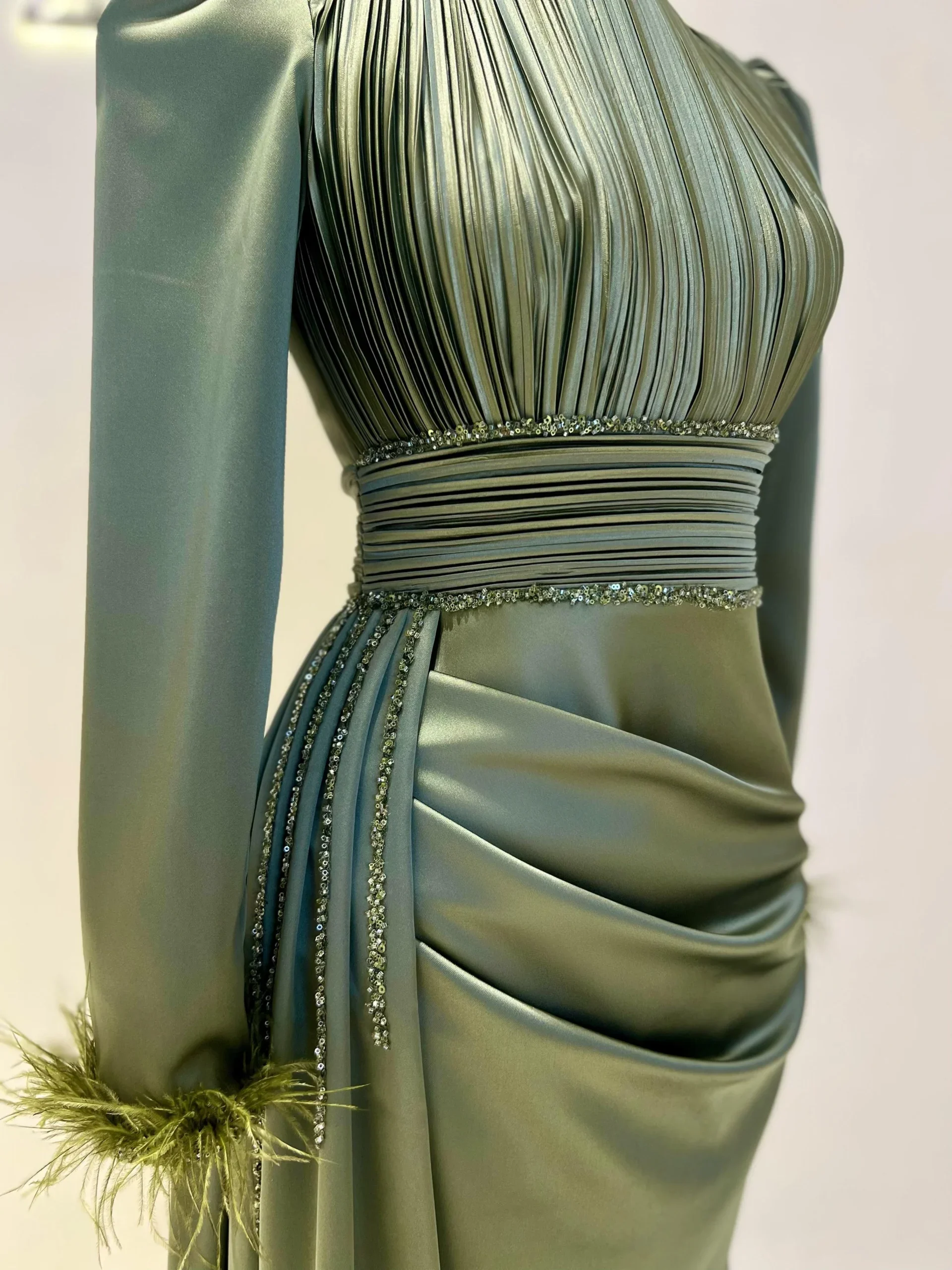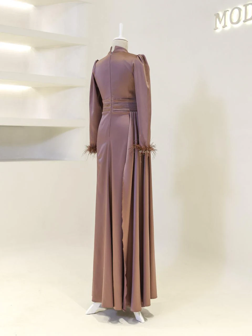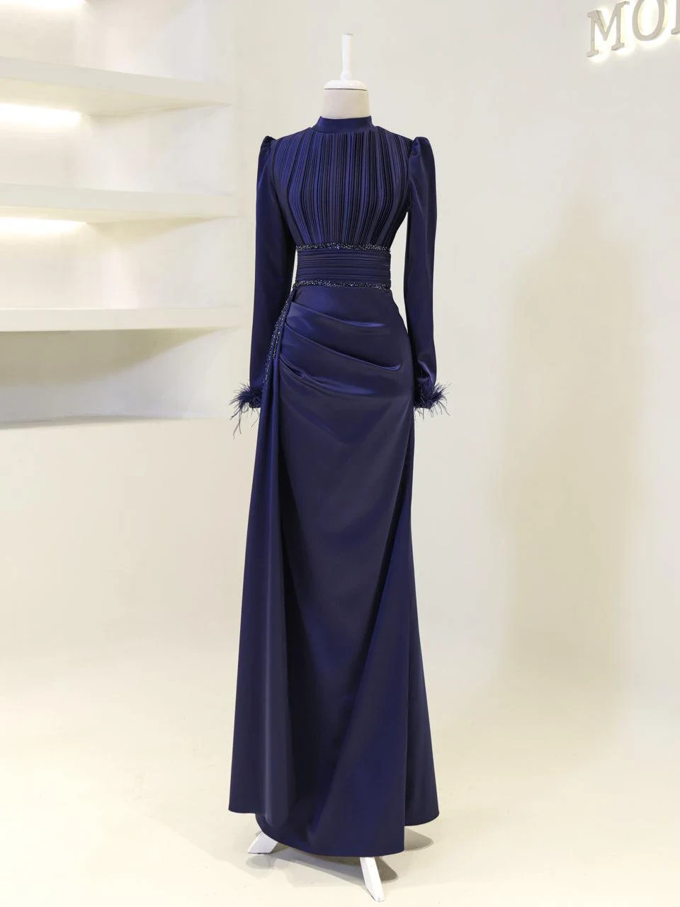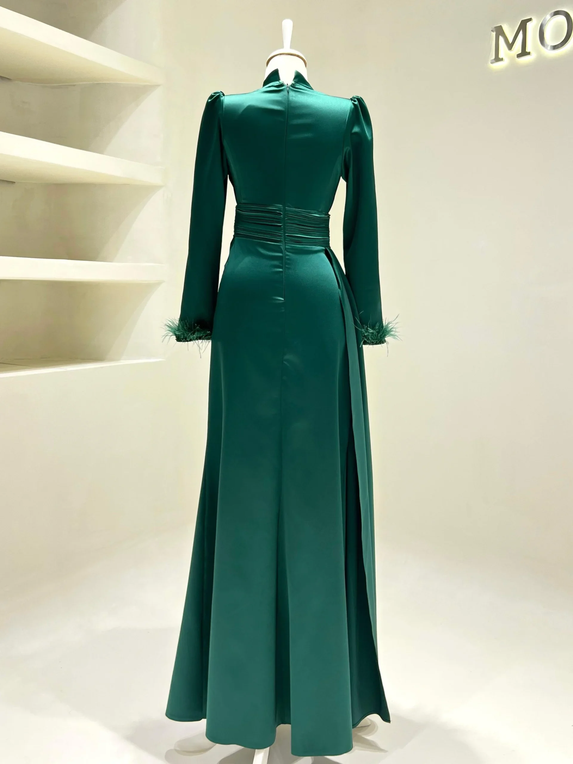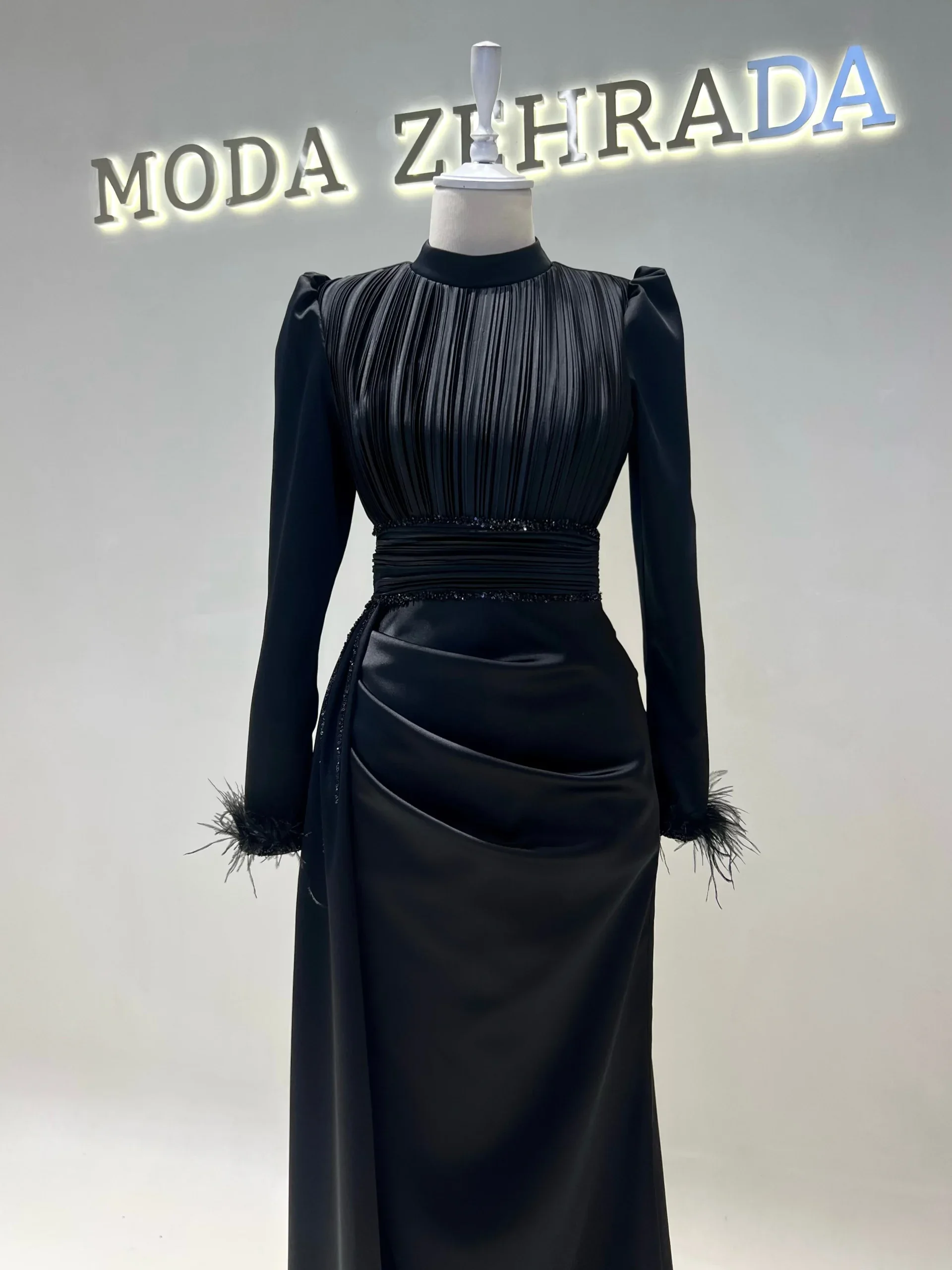 The Riva Modest Evening Dress is designed with a length of 160 cm and crafted from satin fabric. It features a back zipper closure and a mandarin collar. The dress includes a flap detail on the right side and pleated details on the belt and bodice. The sleeves have attached feather embellishments. It is tailored to fit true to size and has an A-line skirt. Please note: The embellishments are glued, which may result in some falling off, but this will not affect the overall design.