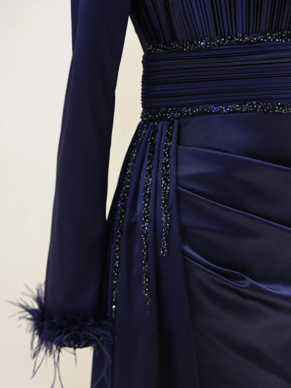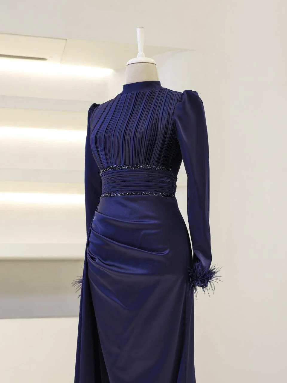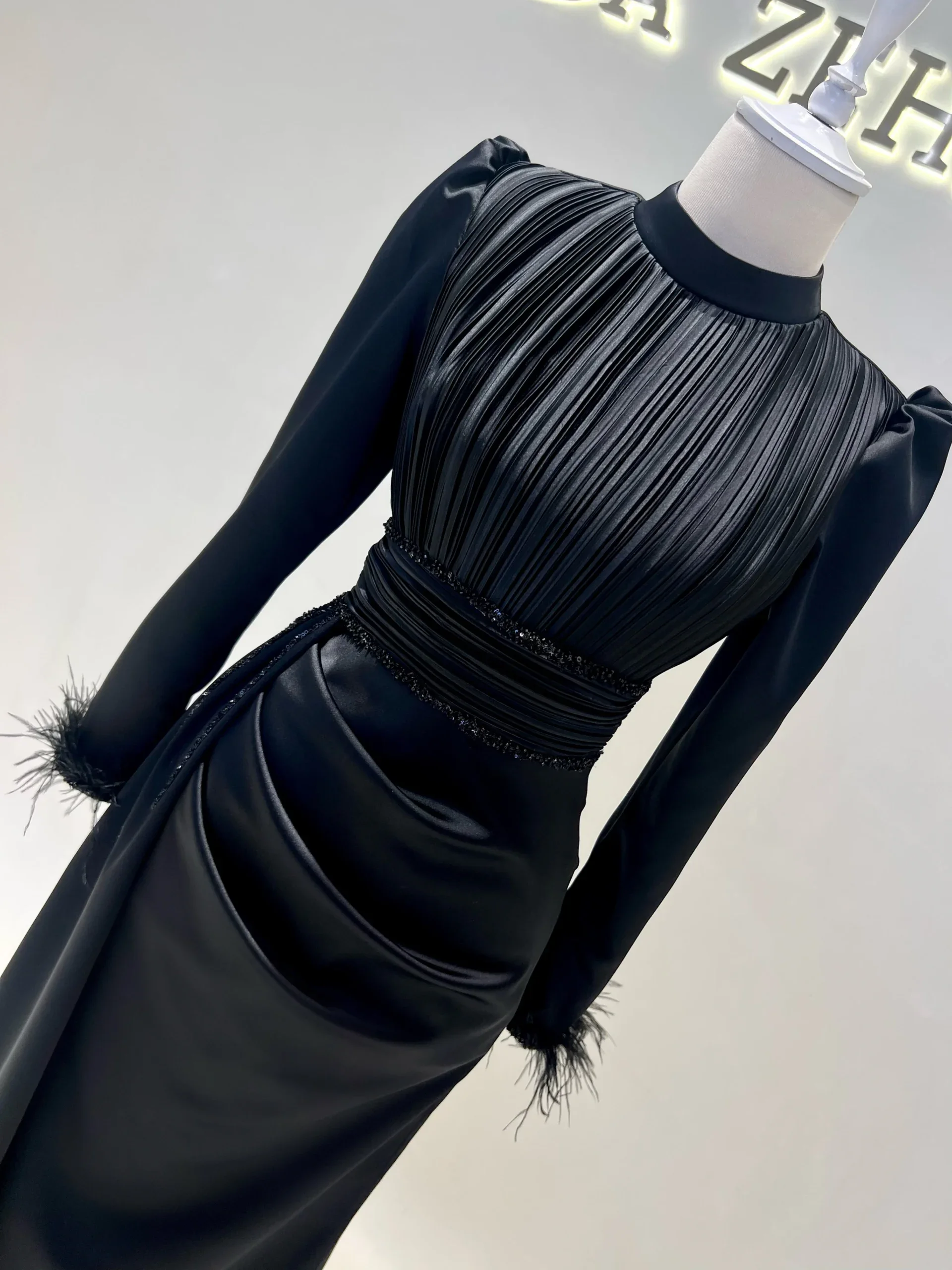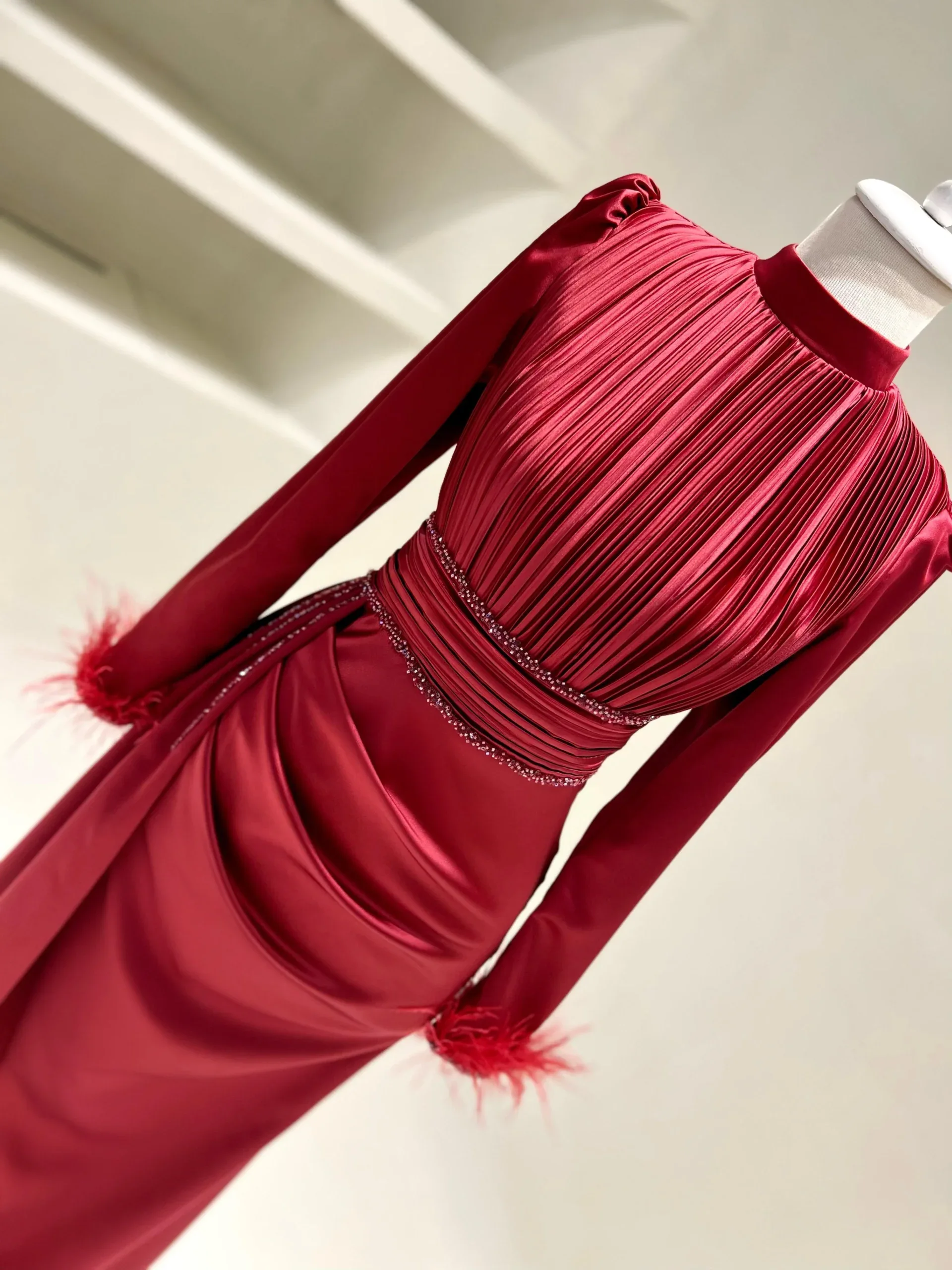The Riva Modest Evening Dress is designed with a length of 160 cm and crafted from satin fabric. It features a back zipper closure and a mandarin collar. The dress includes a flap detail on the right side and pleated details on the belt and bodice. The sleeves have attached feather embellishments. It is tailored to fit true to size and has an A-line skirt. Please note: The embellishments are glued, which may result in some falling off, but this will not affect the overall design.