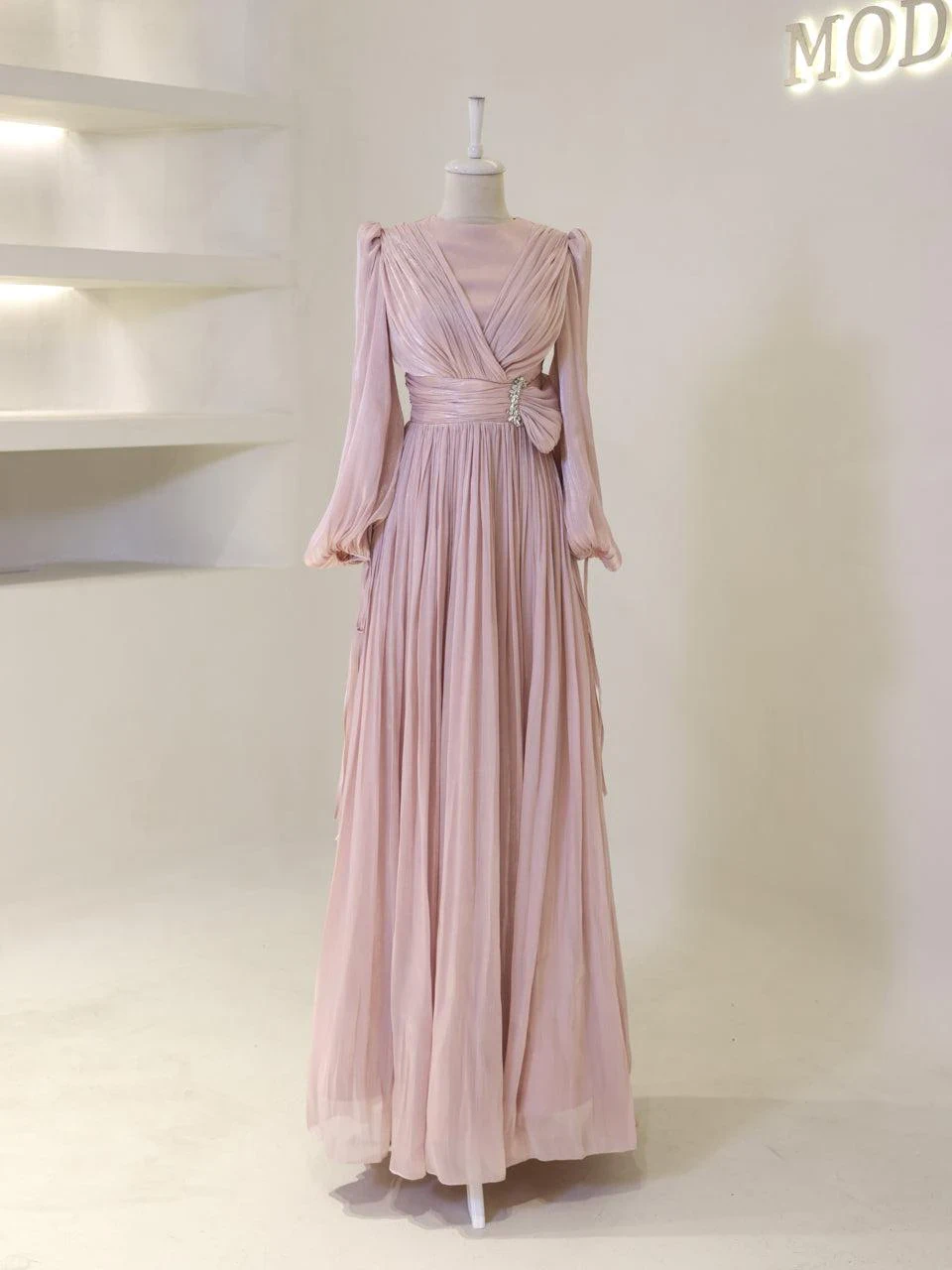 The Rosemary Modest Evening Dress is designed with a full-length of 160 cm, made from orchid fabric. It includes a lining and a back zipper for easy wear. The dress is equipped with a chest pad and features balloon sleeves with tie cuffs. The embellishments are adhesive and may experience slight detachment, though this will not affect the overall design. The dress is accompanied by a shawl and has a pleated skirt form.