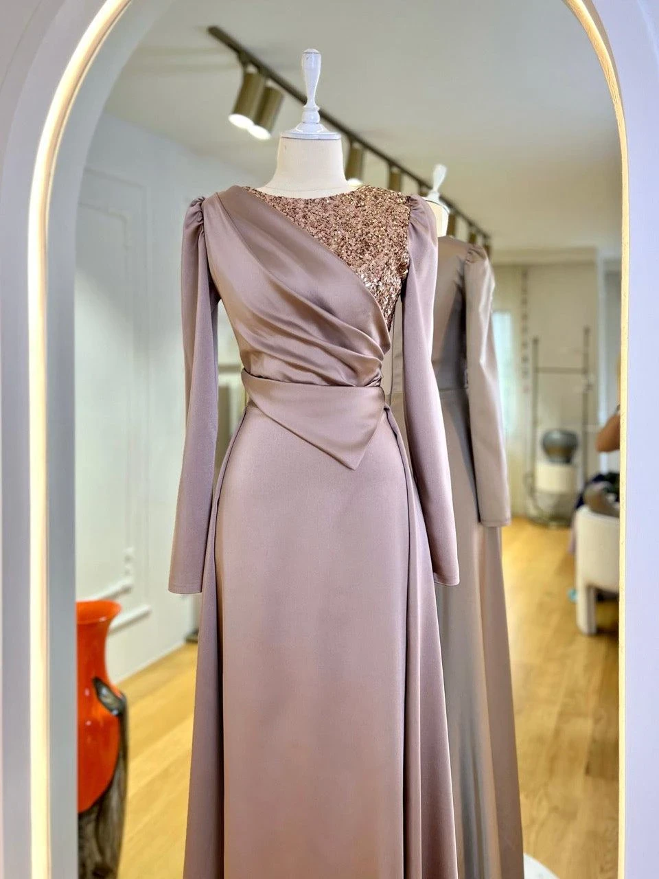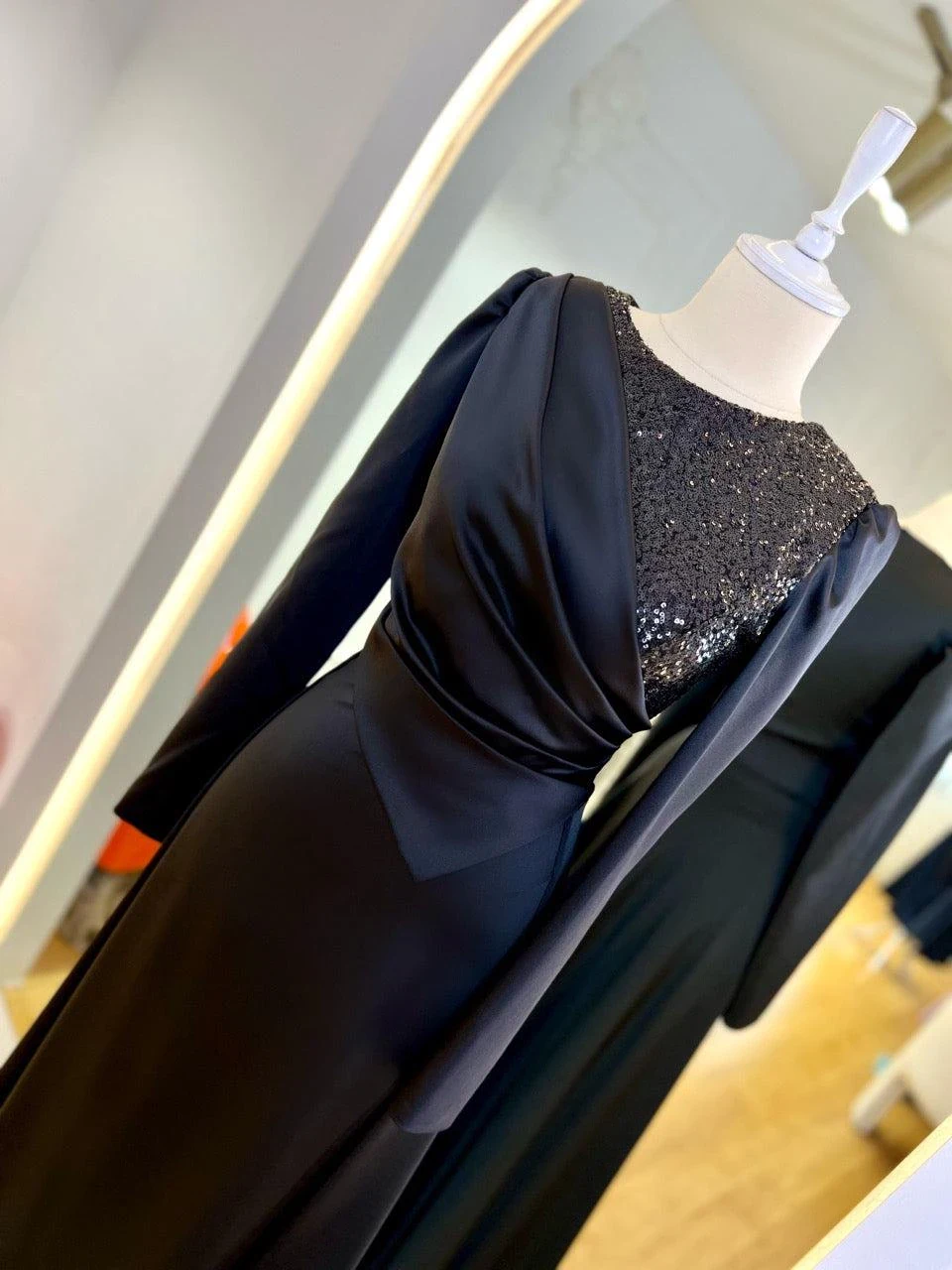 The Rozary Modest Evening Dress is crafted from satin fabric, offering a sophisticated look for special occasions. The dress features a fitted design, with a front length of 160 cm and a back length of 175 cm. It includes a lining for added comfort and a zipper closure at the back. The skirt section has a cape-like design, adding elegance to the overall appearance. The upper part of the dress is adorned with sequin details that are not glued on, and it features cross drape details. The dress has an A-line skirt form. Please note that due to its fitted design, it is recommended to order one size larger than usual.