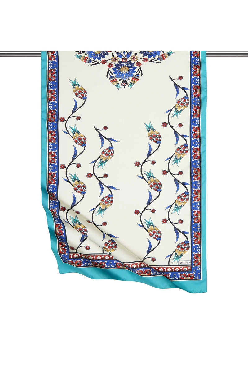 The "Saks Yeşil Sıra Lale Desen Geniş İpeksi Fular" is a scarf featuring tulip patterns in vibrant colors on silky rayon fabric. It measures 55×160 cm and is made in Bursa, Turkey.