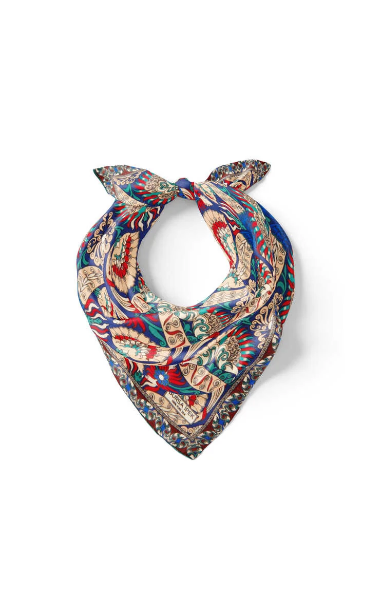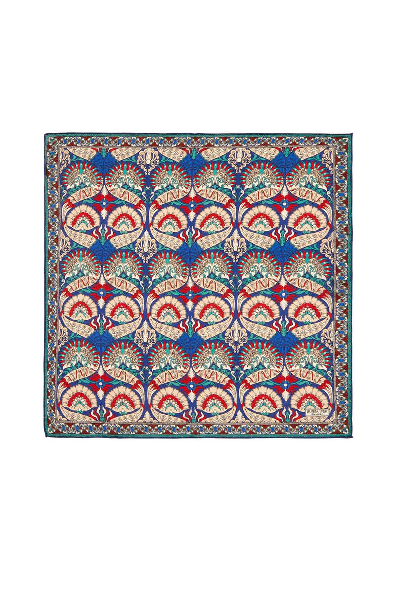 The Saks Kırmızı Tavuskuşu Desen İpek Mendil is a silk handkerchief featuring a unique peacock design in red and blue, inspired by traditional Turkish motifs. Made from 100% silk, it measures 55×55 cm and originates from Bursa, Turkey.