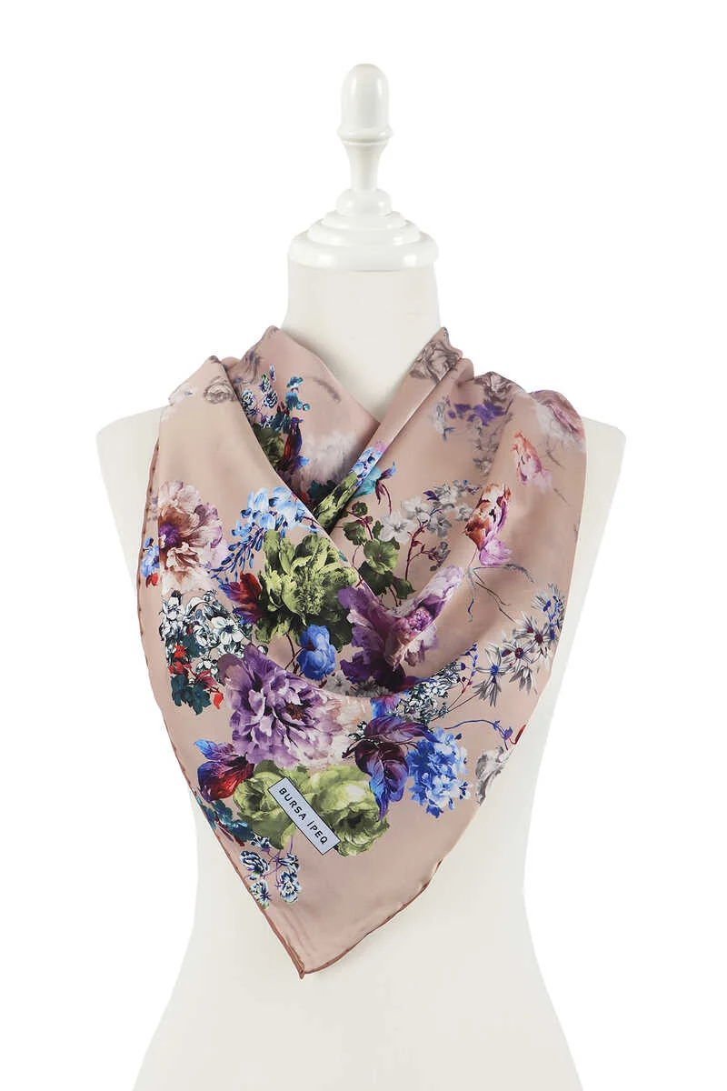 The Somon Begonya Desen İpeksi Eşarp is a scarf made from 100% silky rayon fabric, measuring 90×90 cm. It features vibrant salmon begonia patterns and is produced in Bursa, Turkey.