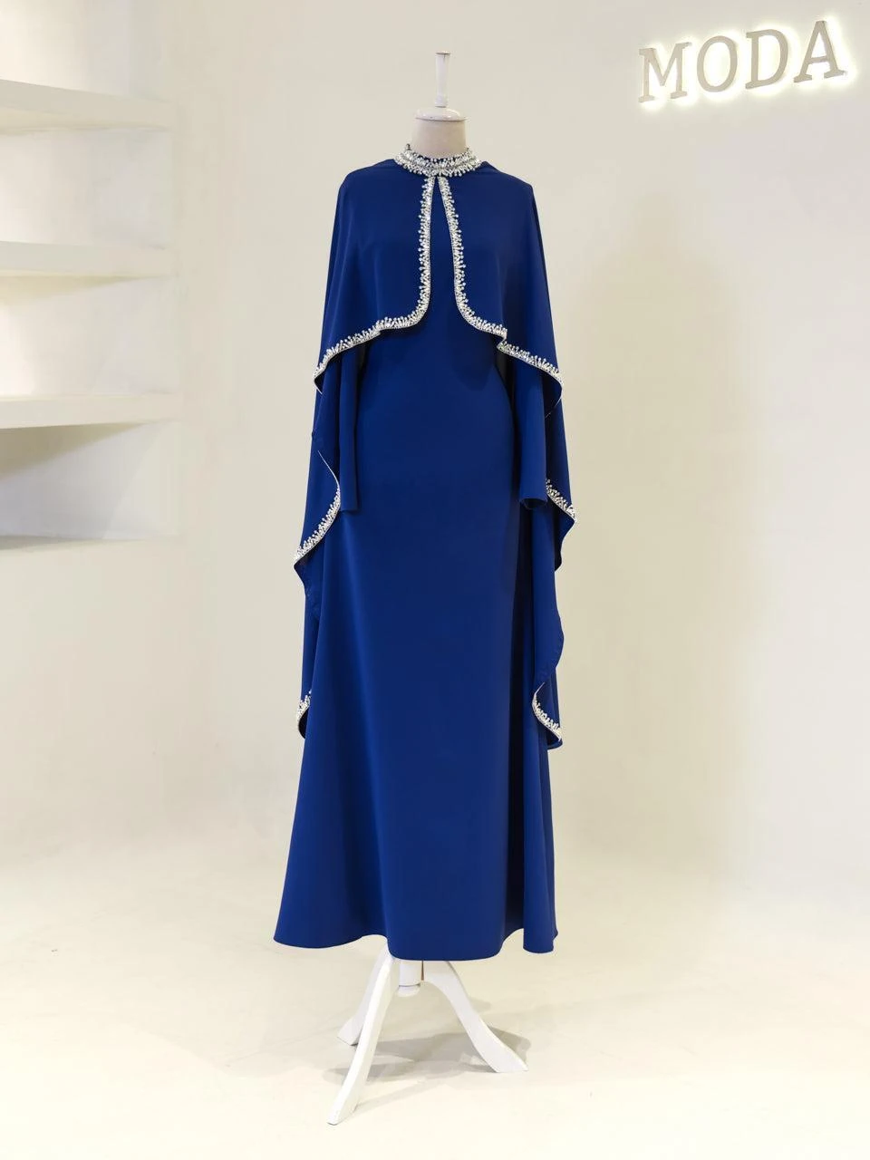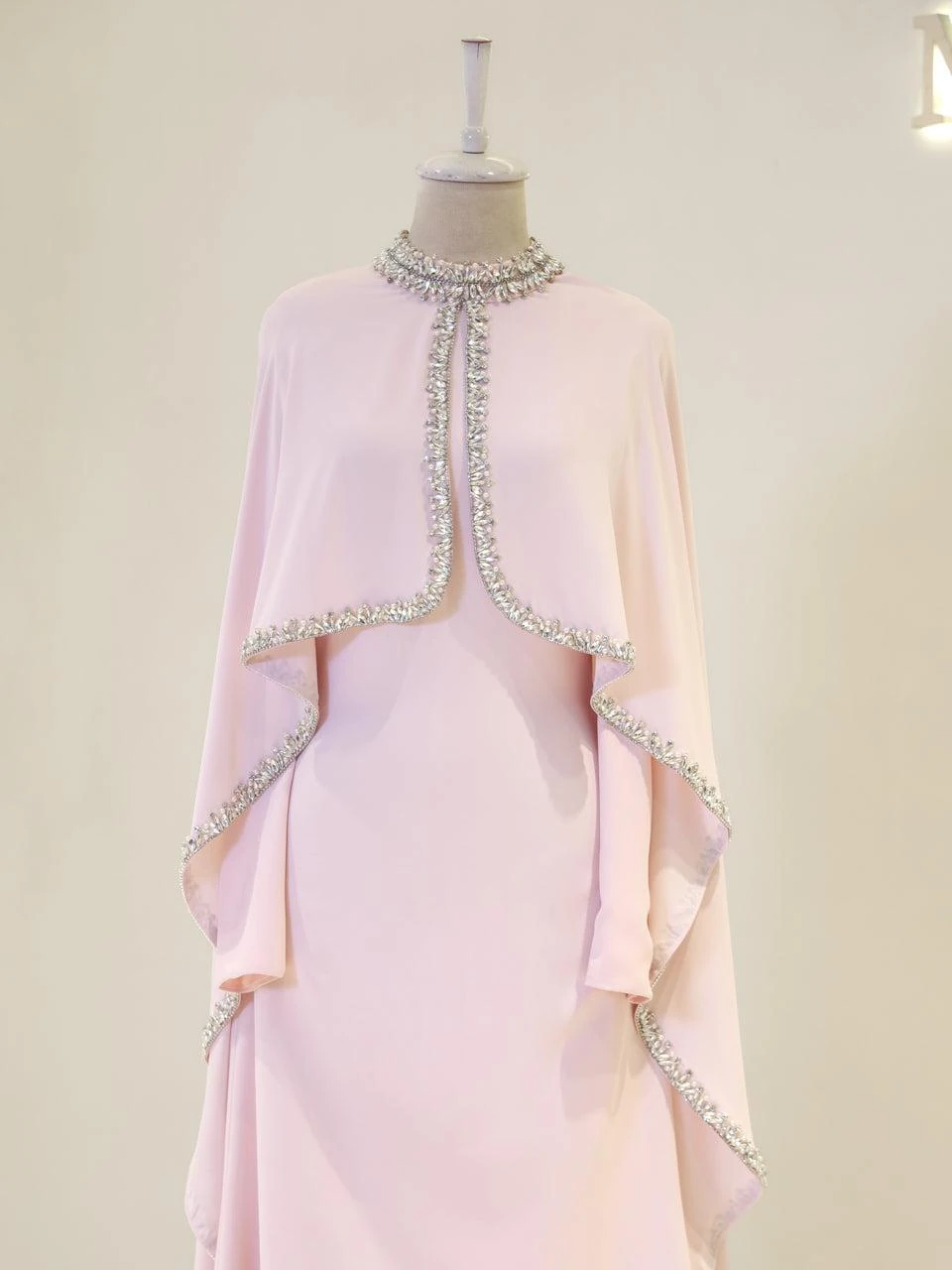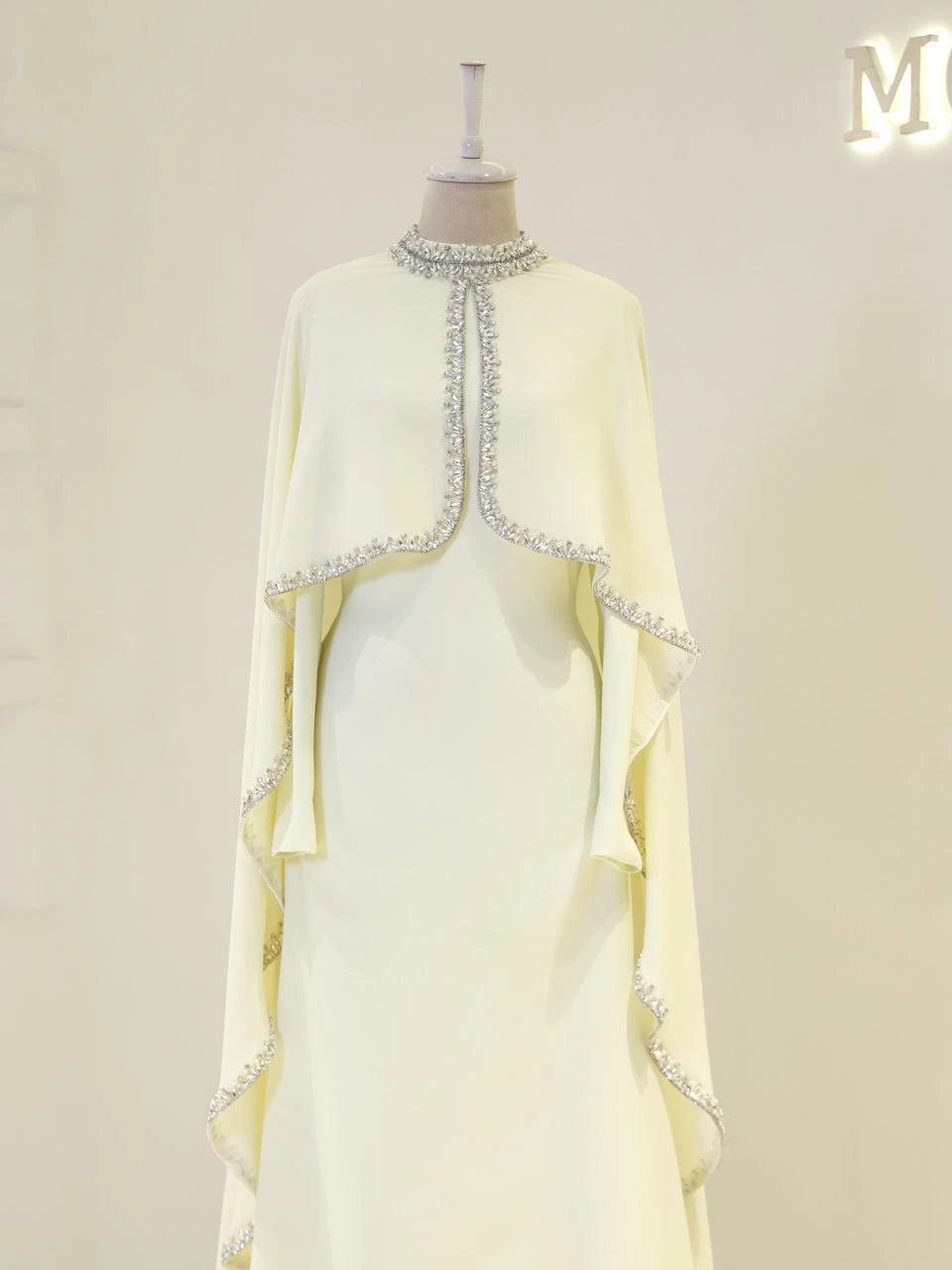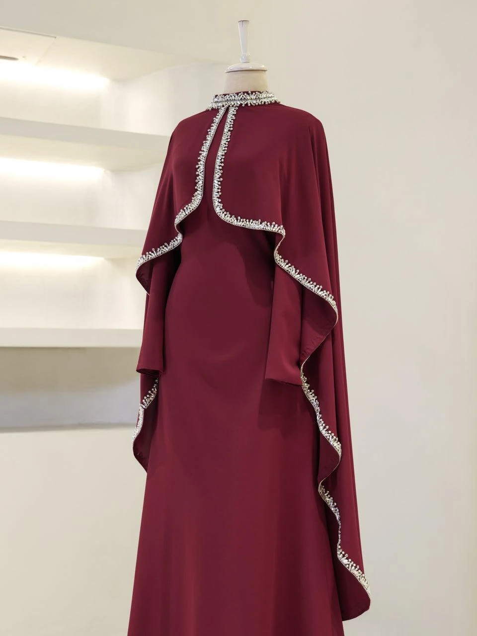 The Sandra Modest Evening Dress is designed with a full fit and measures 150 cm in length. It is made from satin crepe fabric and includes a lining for added comfort. The dress features a detachable cape detail and is secured with a back zipper. The embellishments are adhesive, and while some shedding may occur, it will not affect the overall design of the dress. The dress has a flared skirt form.