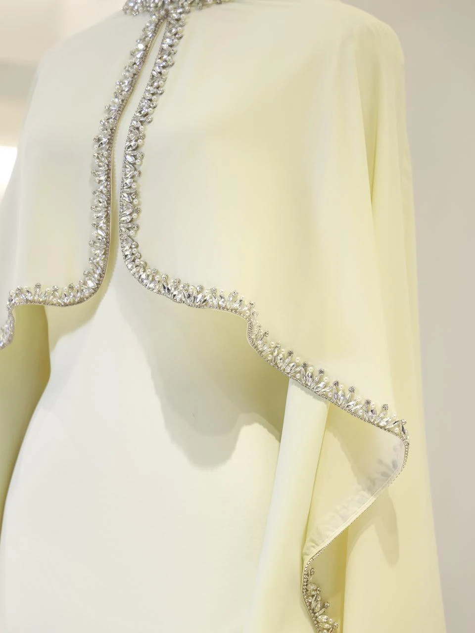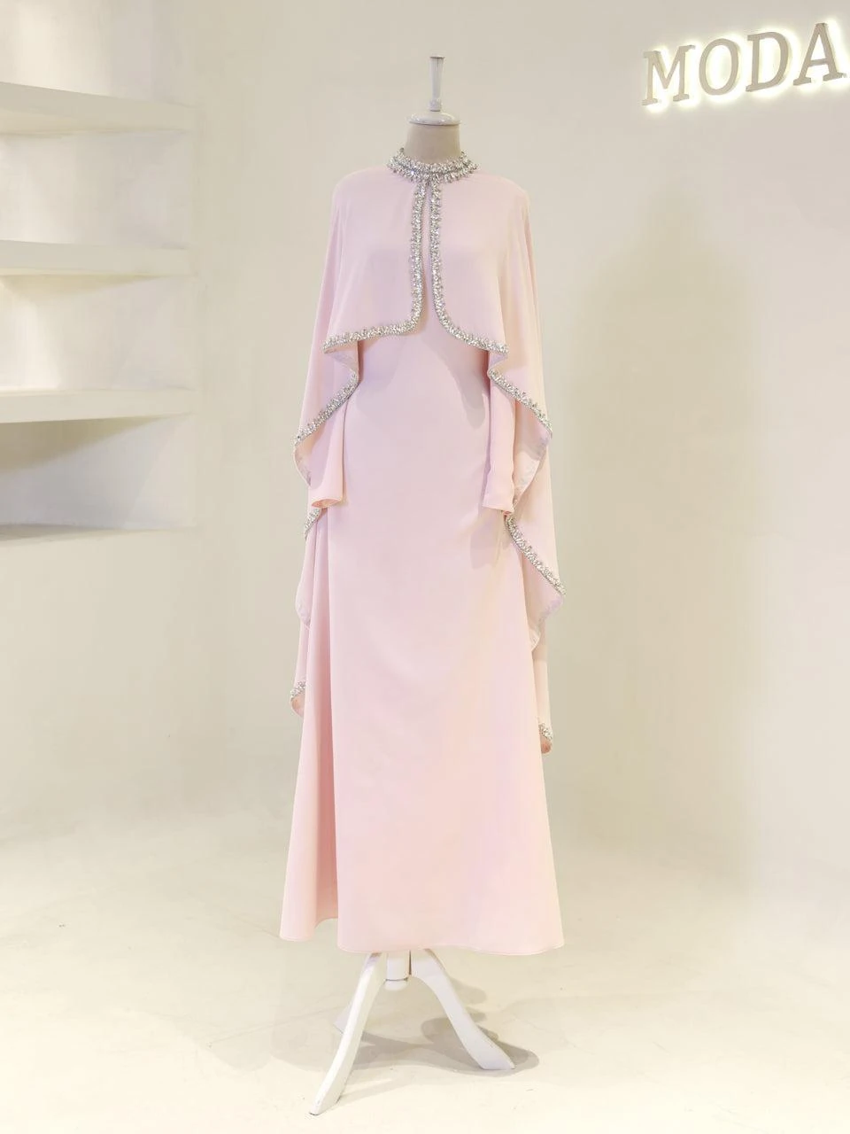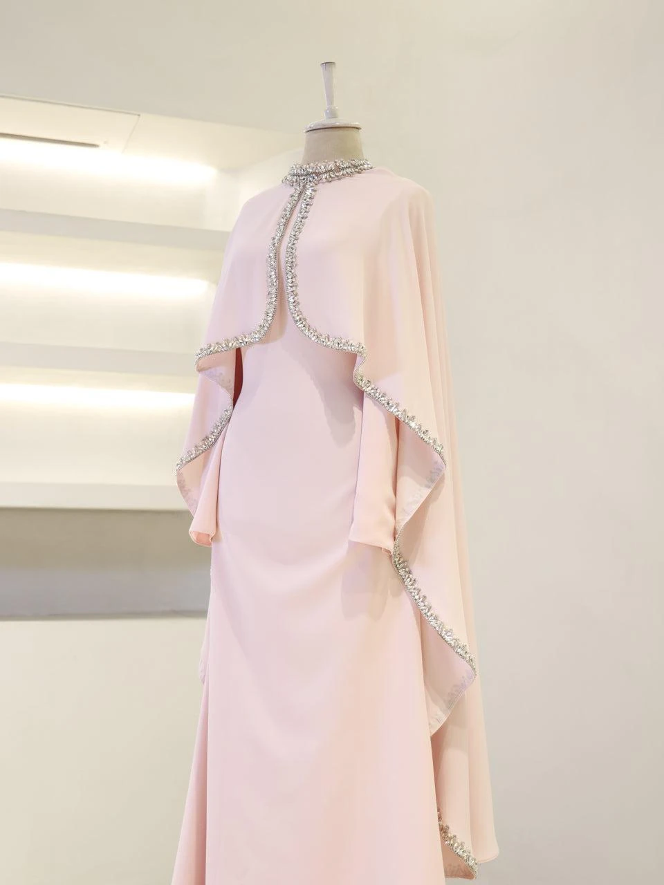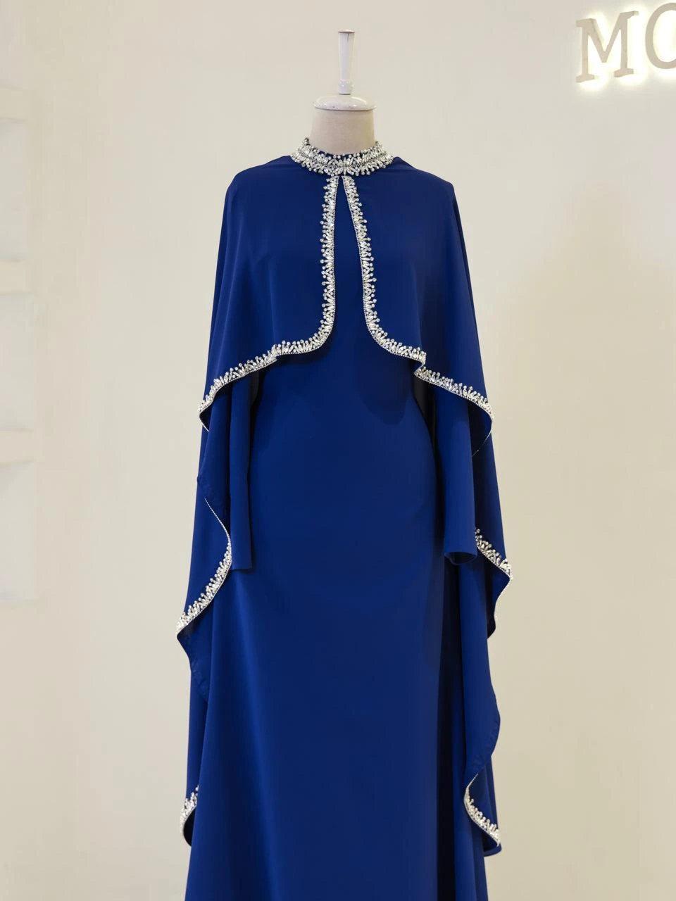 The Sandra Modest Evening Dress is designed with a full fit and measures 150 cm in length. It is made from satin crepe fabric and includes a lining for added comfort. The dress features a detachable cape detail and is secured with a back zipper. The embellishments are adhesive, and while some shedding may occur, it will not affect the overall design of the dress. The dress has a flared skirt form.