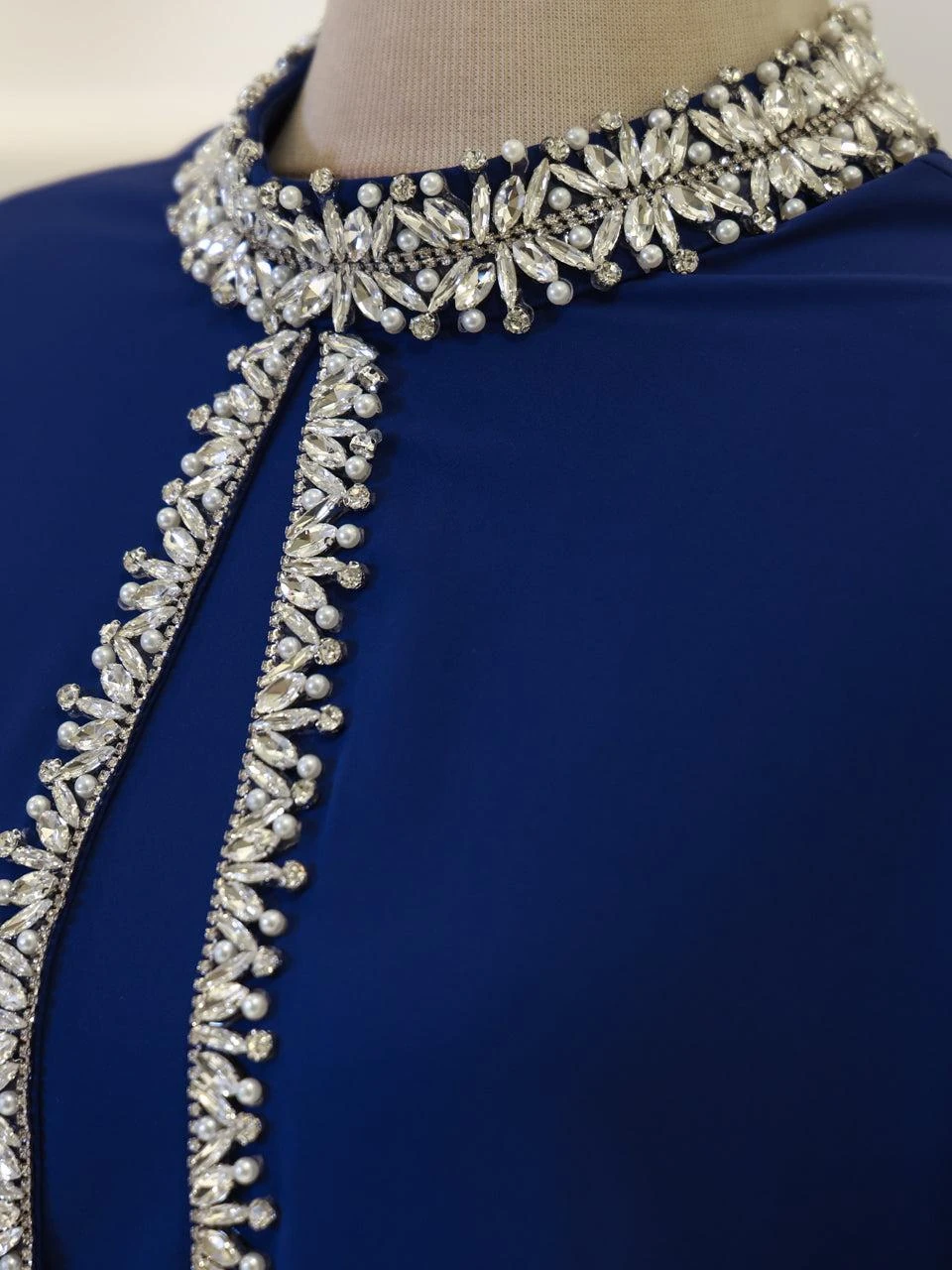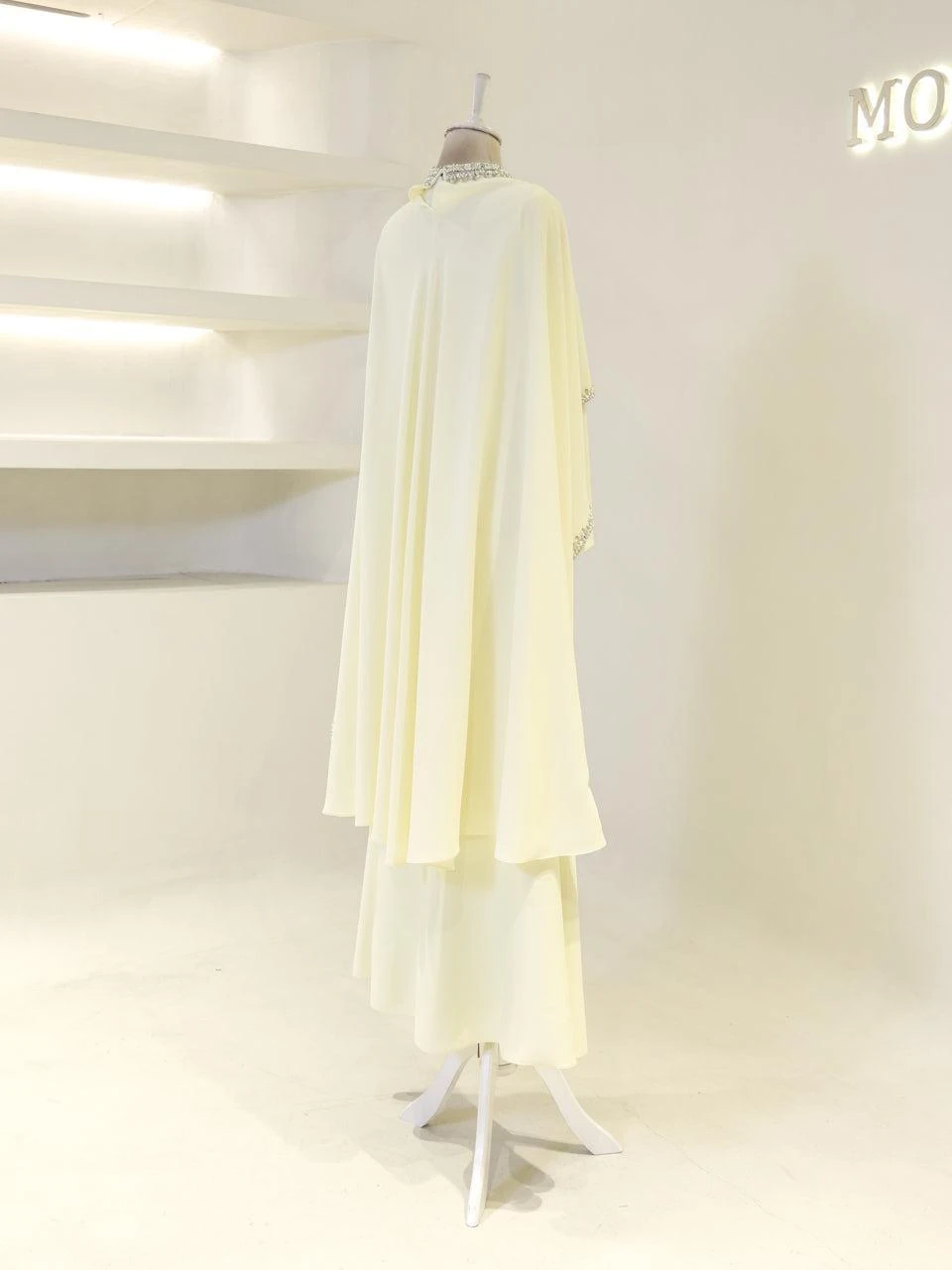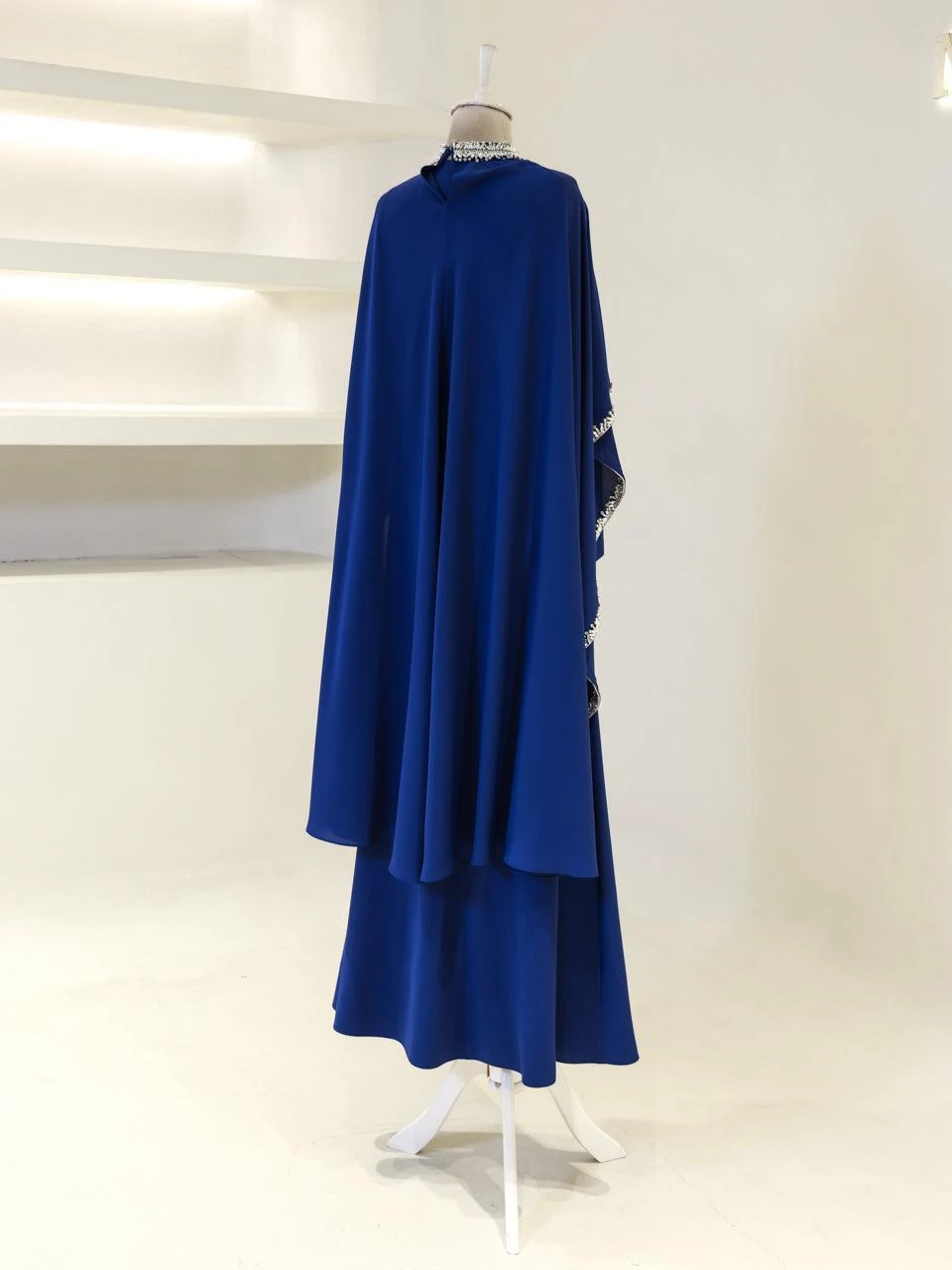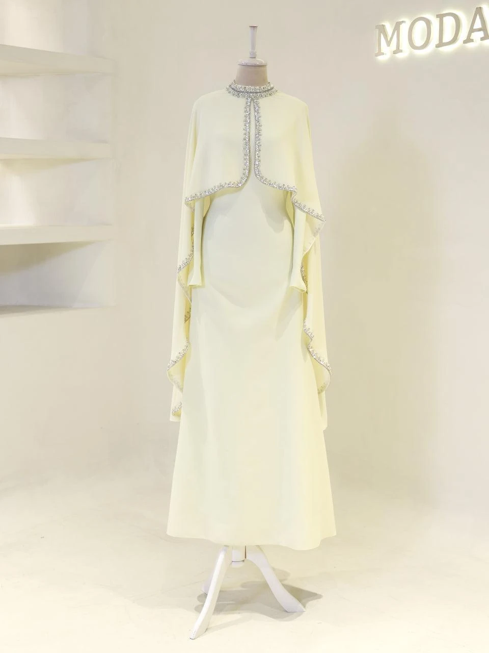 The Sandra Modest Evening Dress is designed with a full fit and measures 150 cm in length. It is made from satin crepe fabric and includes a lining for added comfort. The dress features a detachable cape detail and is secured with a back zipper. The embellishments are adhesive, and while some shedding may occur, it will not affect the overall design of the dress. The dress has a flared skirt form.