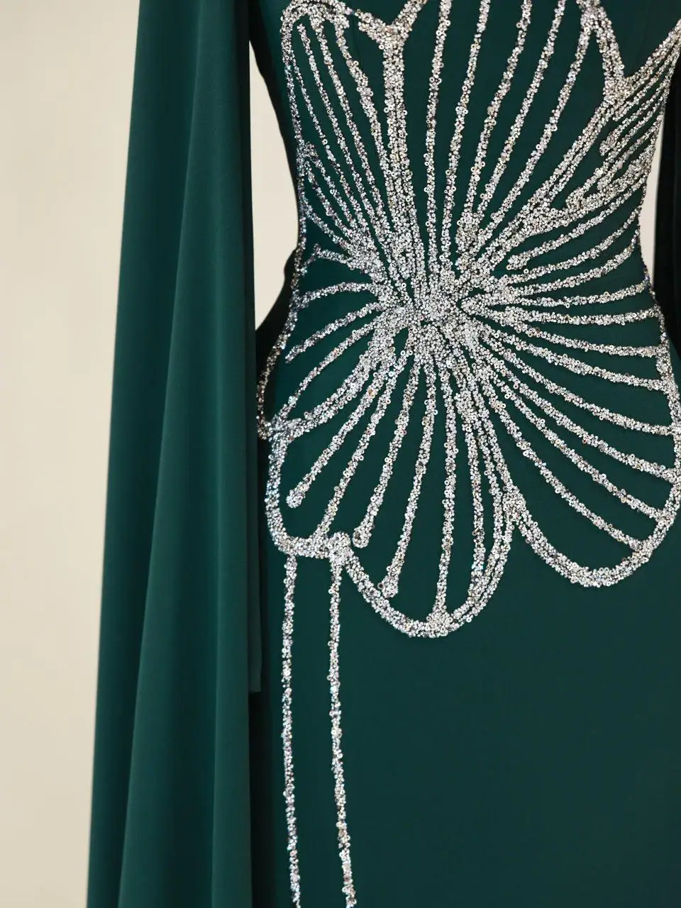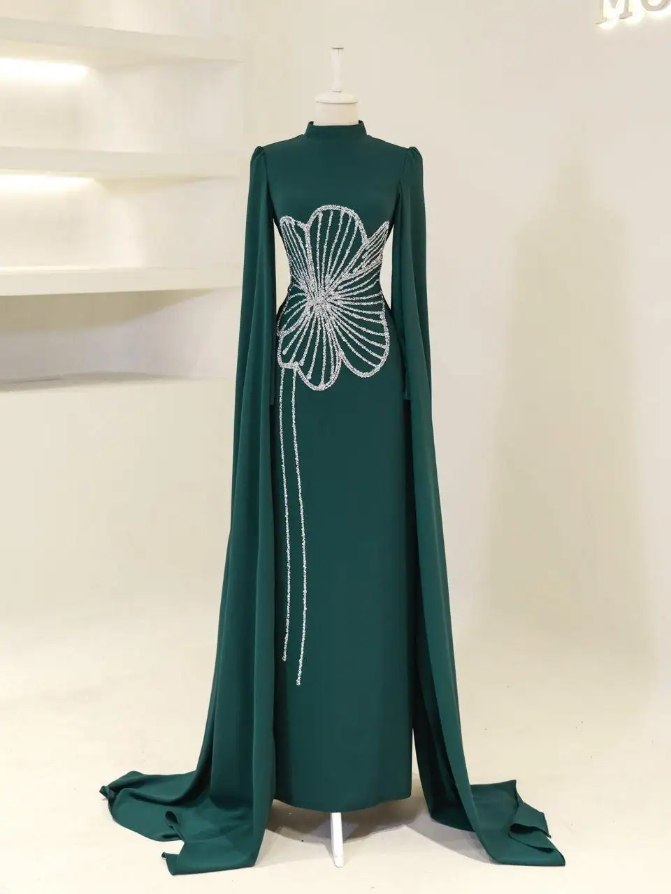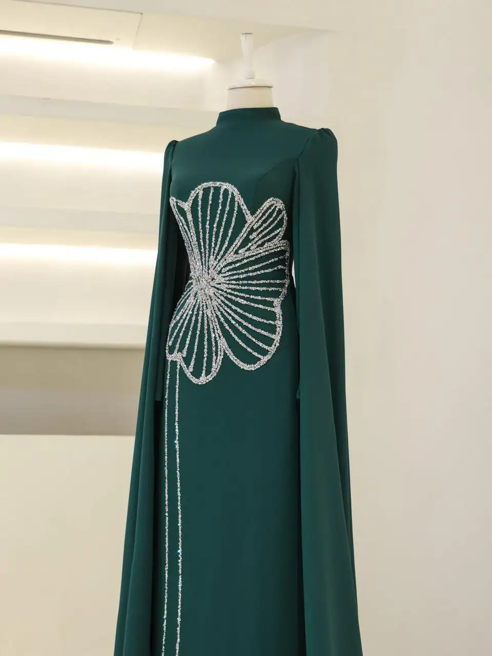 The Sema Modest Evening Dress is designed with a precise fit and measures an average length of 160 cm. Made from crepe fabric, it is fully lined and features a convenient back zipper. The dress includes chest padding for added comfort and support. A notable design element is the cape detail that extends from the shoulders to the hem, adding a touch of elegance. The dress has a pencil skirt form, and the embellishments are glued on. Please note that while some embellishments may detach, it will not significantly affect the overall appearance of the dress.