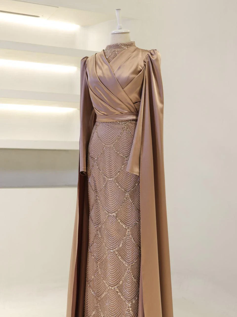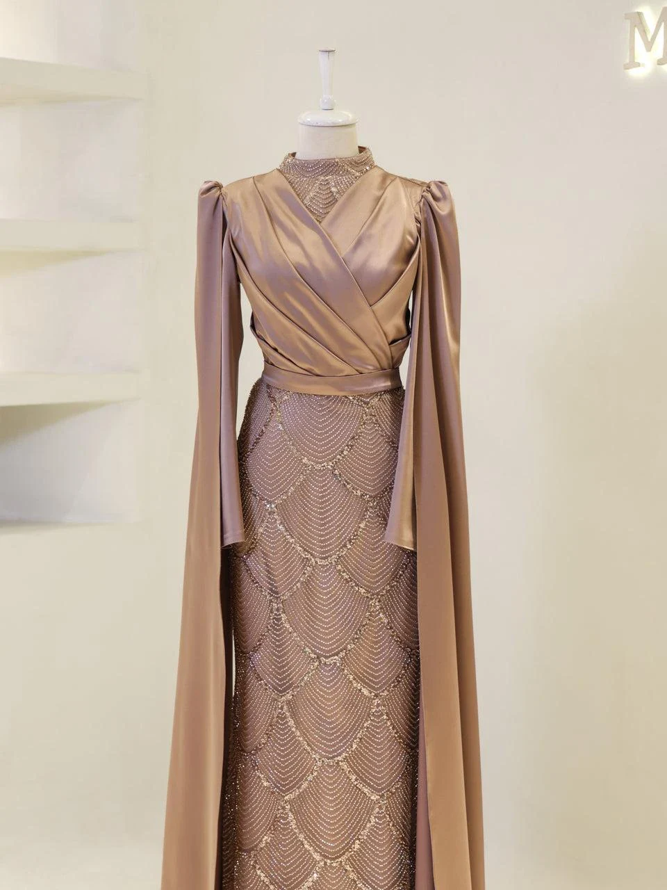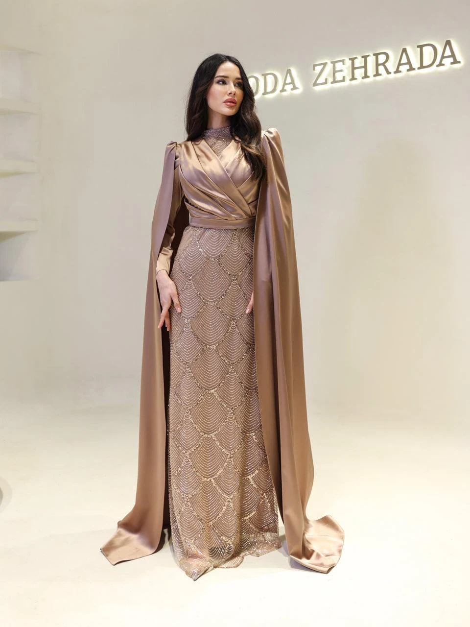 The Semnan Modest Evening Dress is crafted from satin fabric, offering a luxurious and elegant appearance. It is designed to fit true to size with an average length of 165 cm. The dress includes a lining and a back zipper for ease of wear. A notable feature is the cape detail that extends from the sleeves to the ground, adding a unique touch to its pencil form. Additionally, the dress is equipped with a bust pad for added comfort. Unlike some designs, the embellishments on this dress are not glued, ensuring durability and quality.