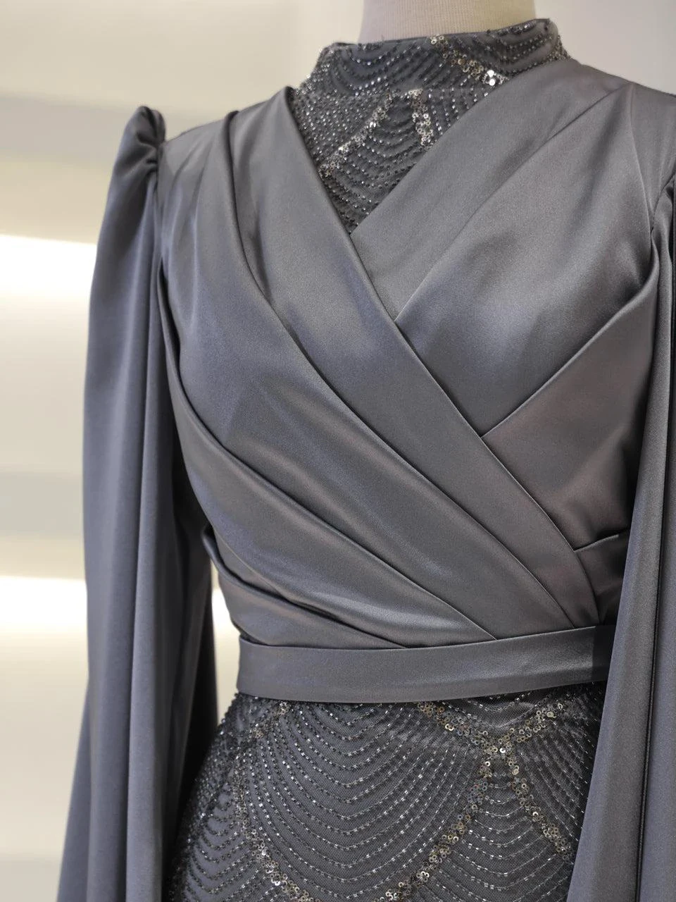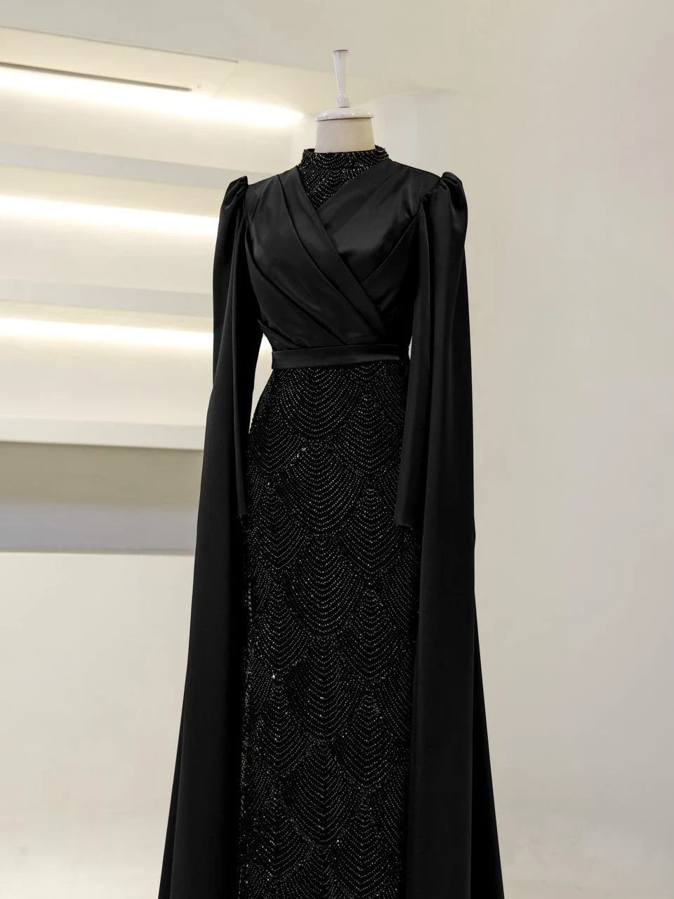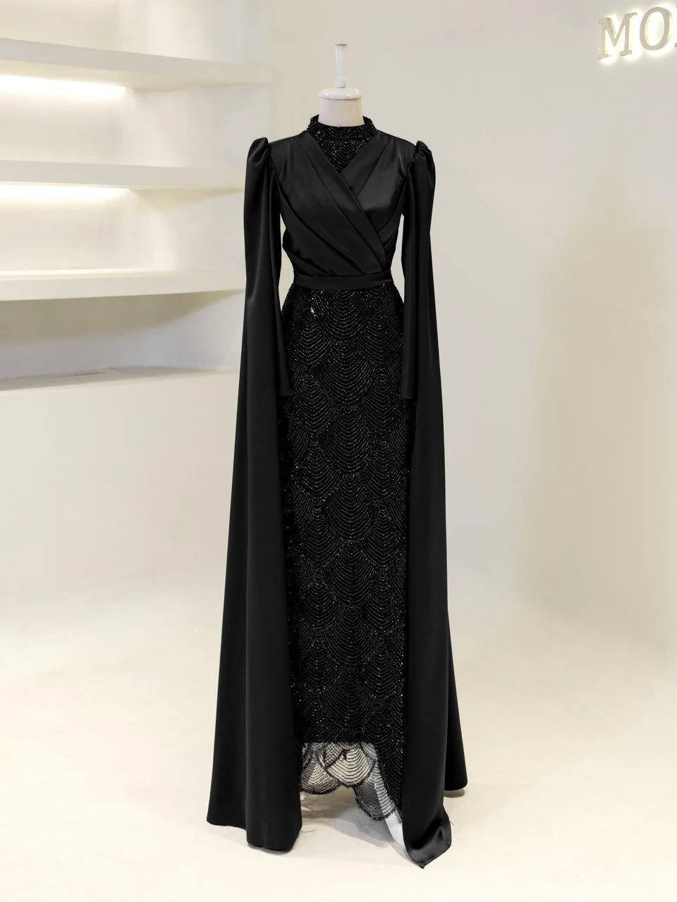 The Semnan Modest Evening Dress is crafted from satin fabric, offering a luxurious and elegant appearance. It is designed to fit true to size with an average length of 165 cm. The dress includes a lining and a back zipper for ease of wear. A notable feature is the cape detail that extends from the sleeves to the ground, adding a unique touch to its pencil form. Additionally, the dress is equipped with a bust pad for added comfort. Unlike some designs, the embellishments on this dress are not glued, ensuring durability and quality.